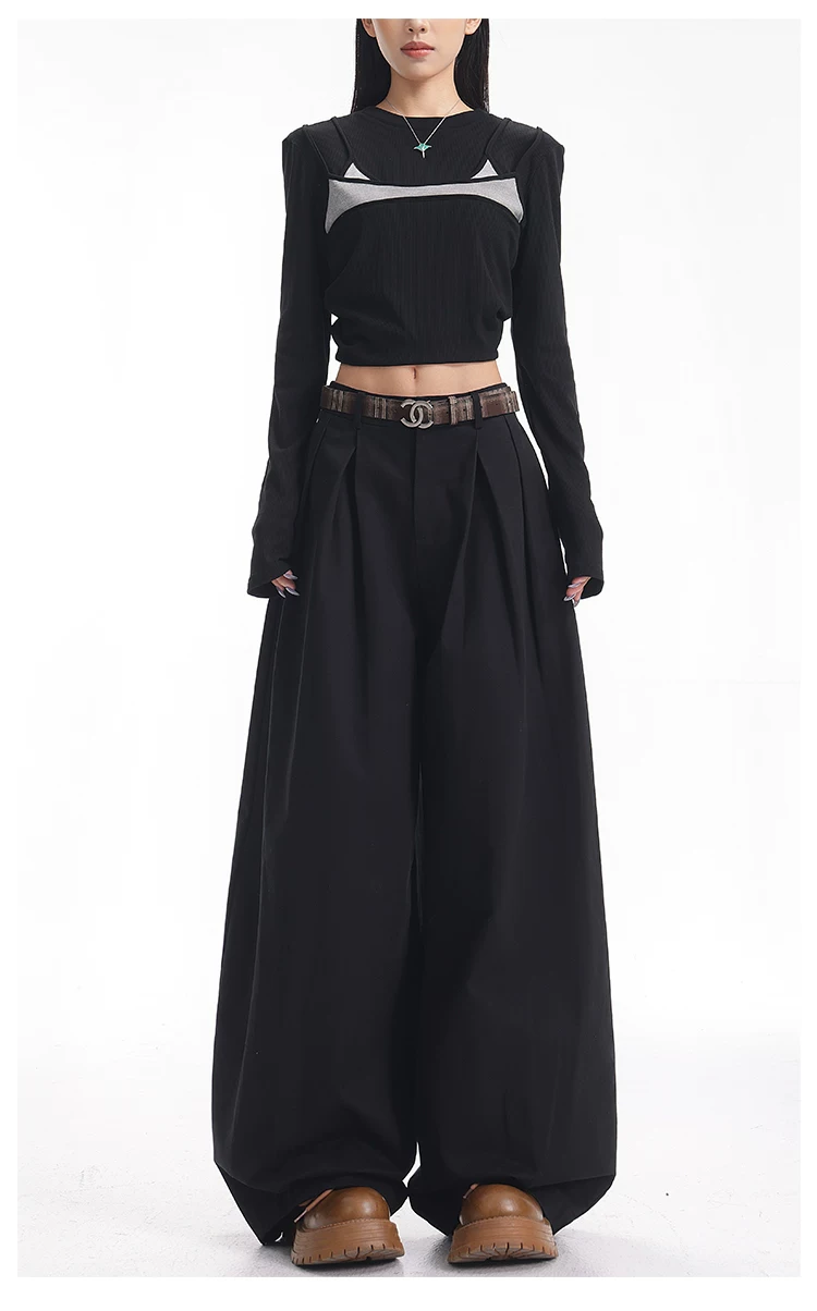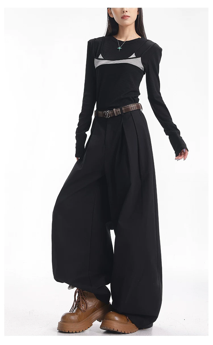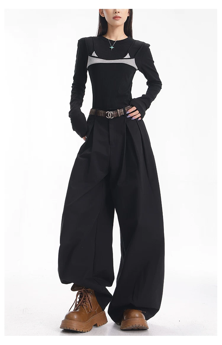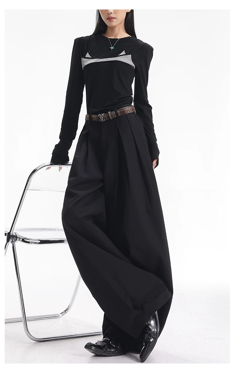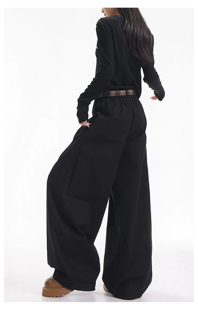 - KEN STUDIO Quần tây ống rộng màu đen thu đông mới dành cho nữ với thiết kế xếp ly, quần ống rộng dáng suông và tôn dáng