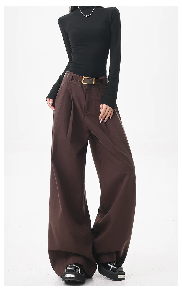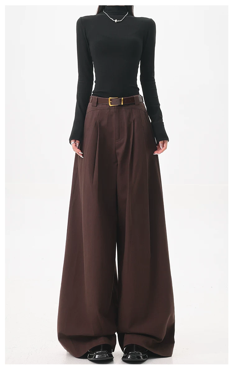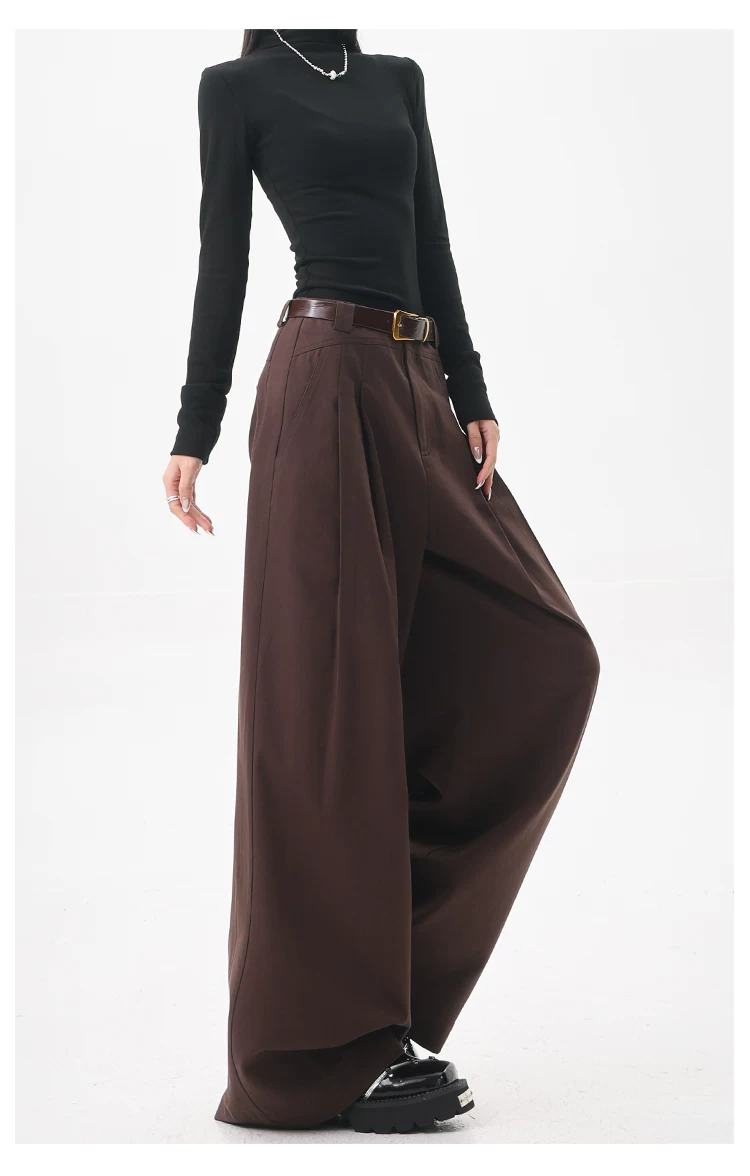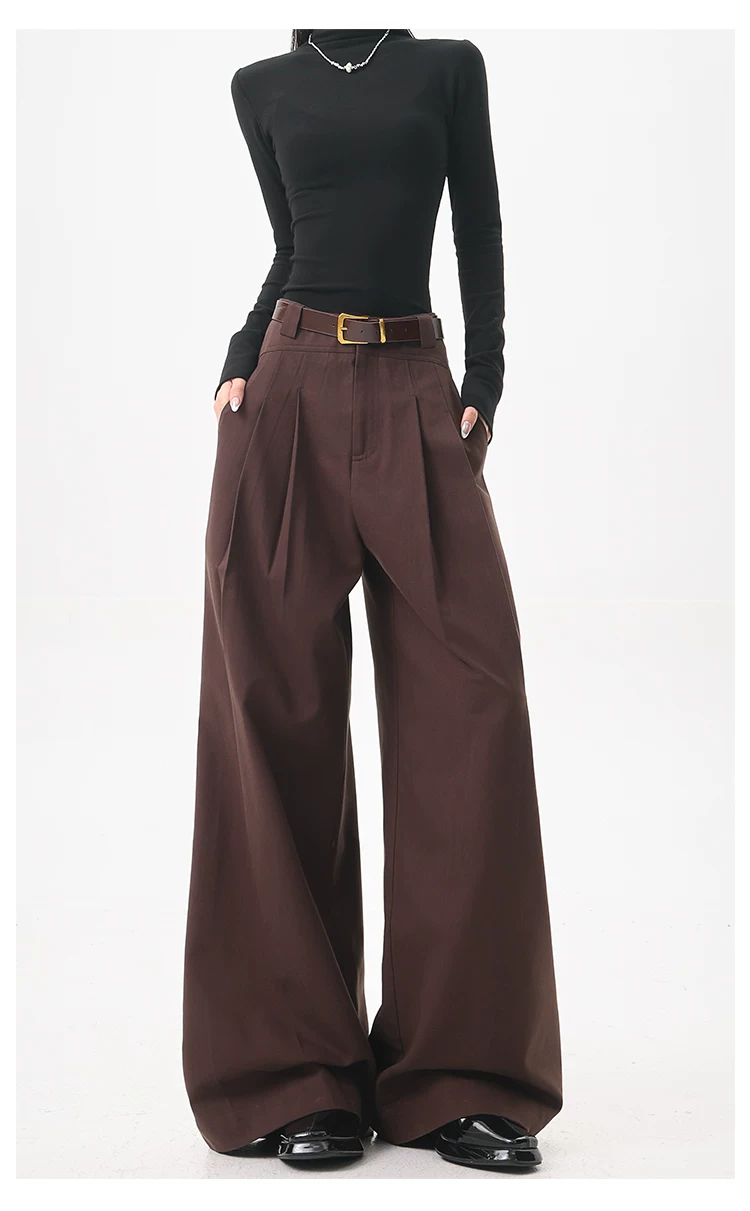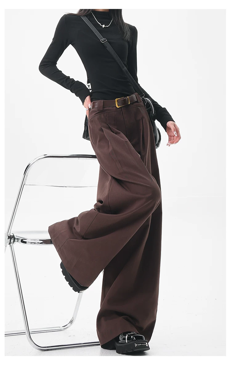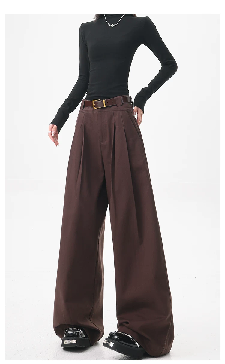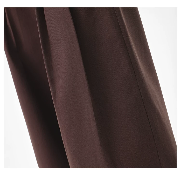 - KEN STUDIO Quần tây ống rộng màu nâu Melard mùa hè và mùa thu mới dành cho nữ, quần cạp cao, dáng rộng và xếp nếp, quần thường ngày