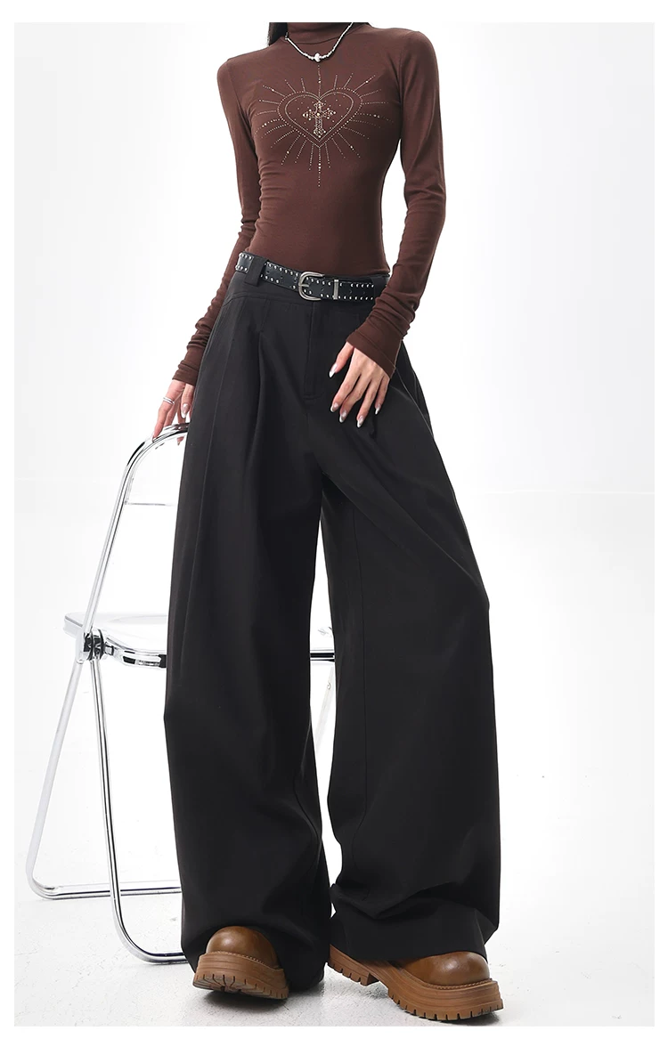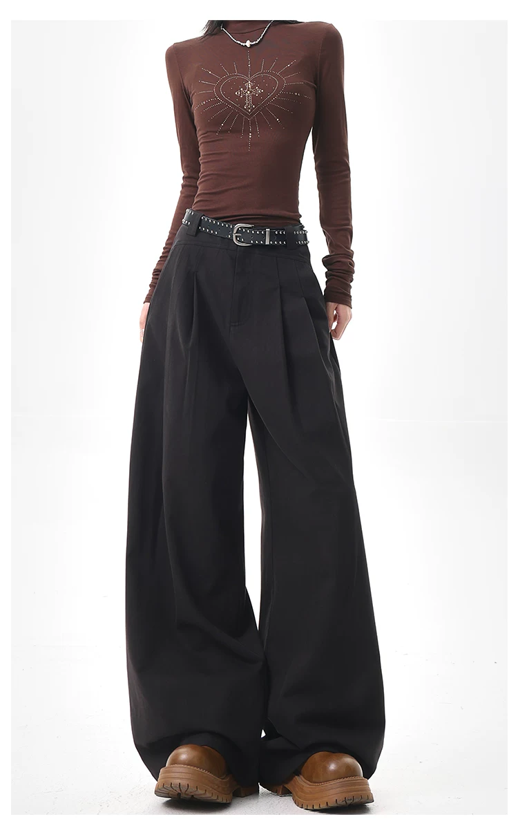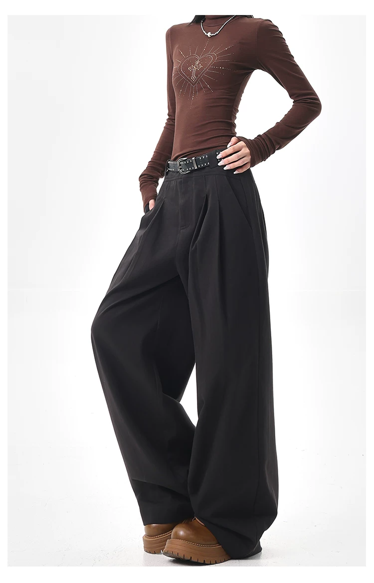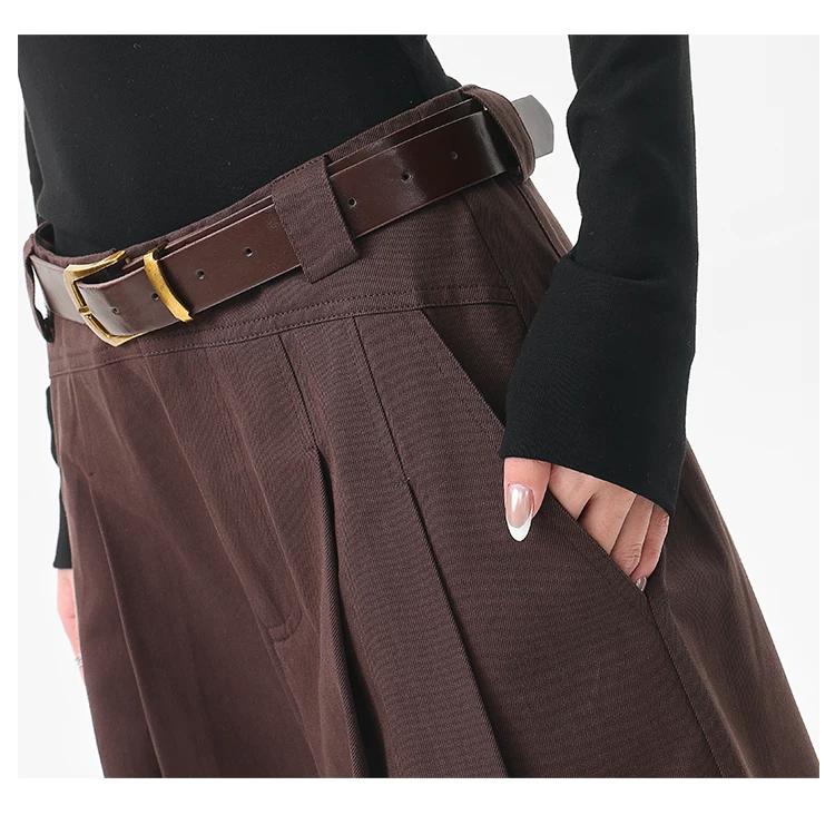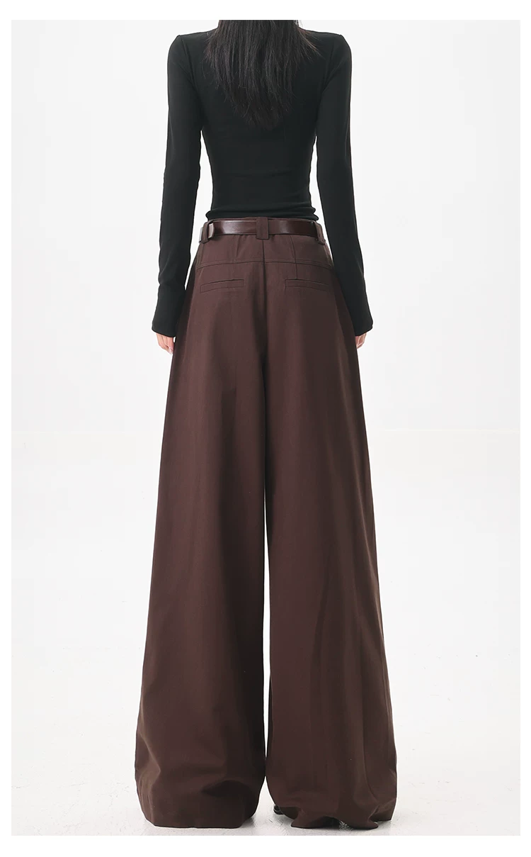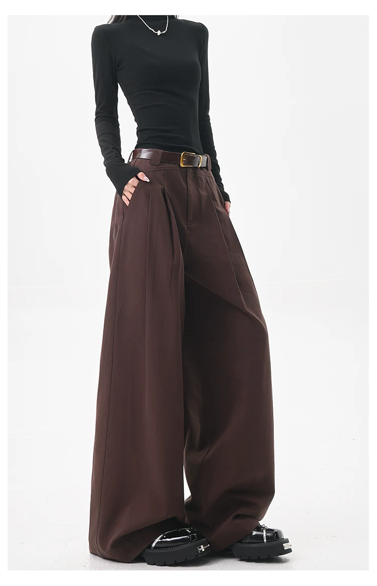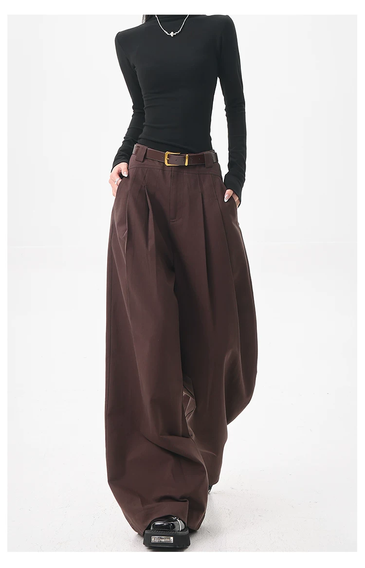 - KEN STUDIO Quần tây ống rộng màu nâu Melard mùa hè và mùa thu mới dành cho nữ, quần cạp cao, dáng rộng và xếp nếp, quần thường ngày