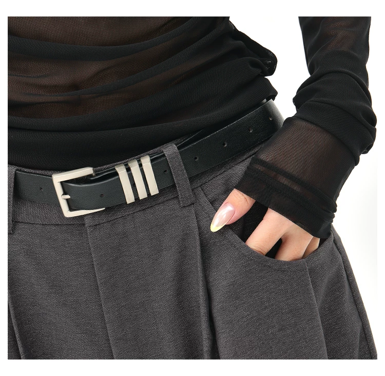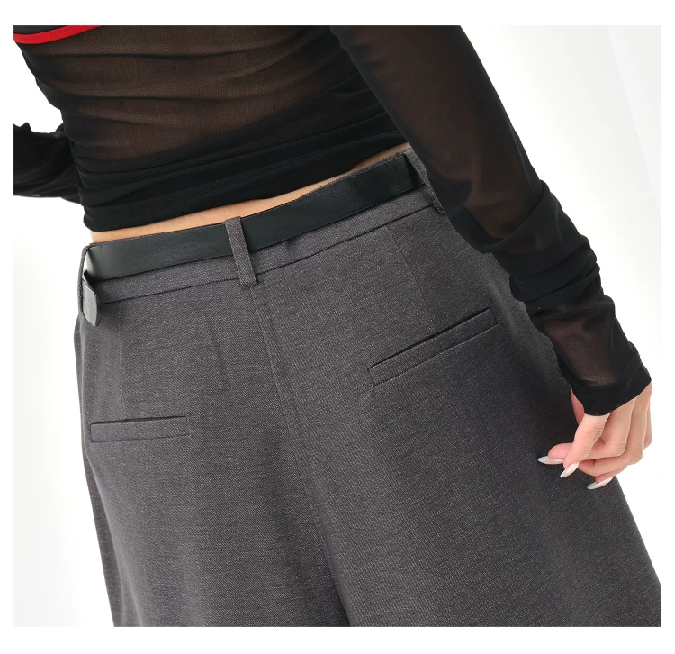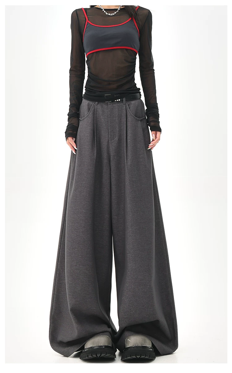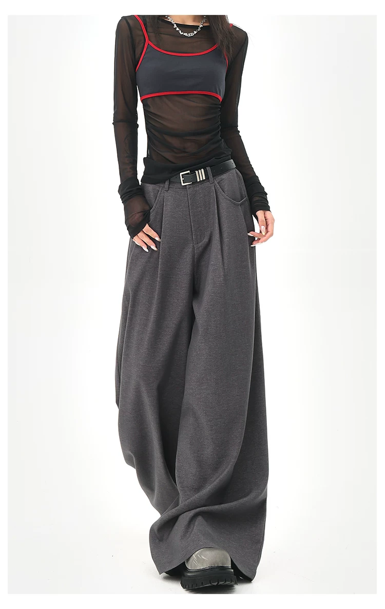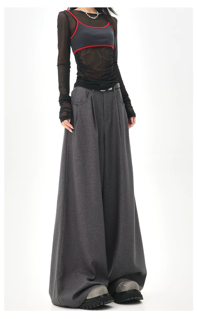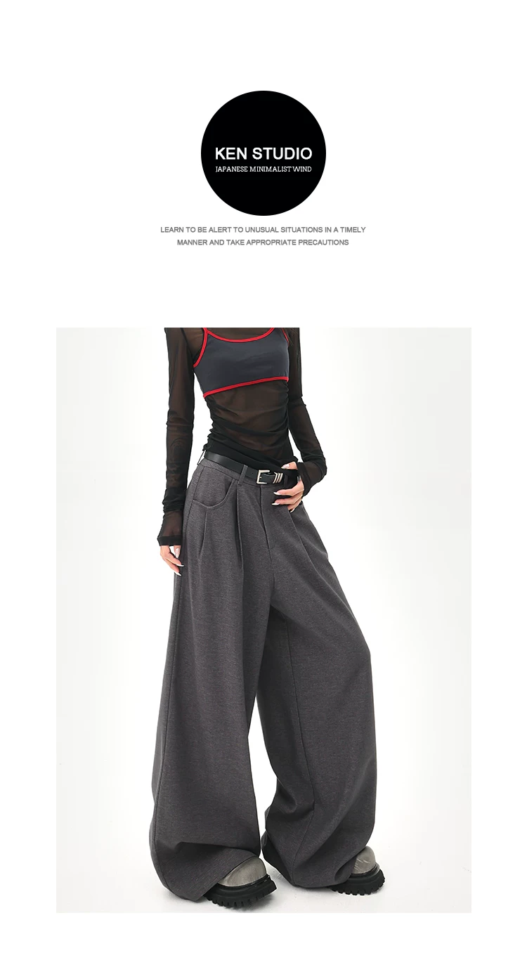 - KEN STUDIO Quần tây ống rộng màu xám mùa hè mới dành cho nữ, lưng cao, dáng suôn, rộng rãi, tôn dáng, quần dài chấm đất