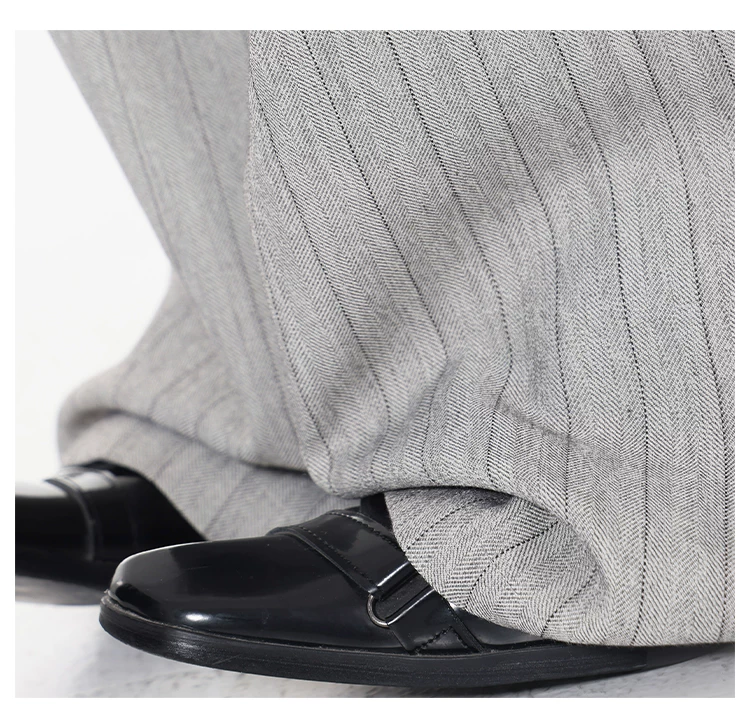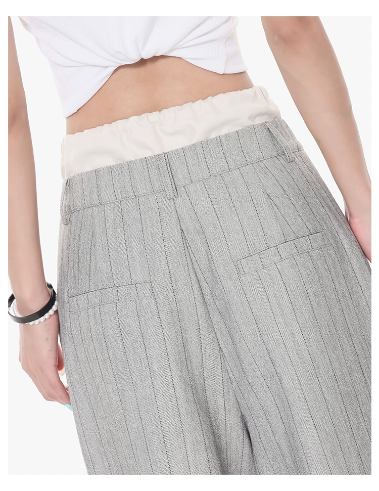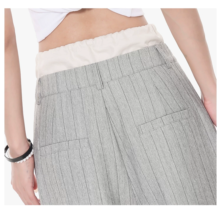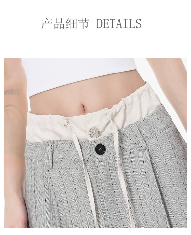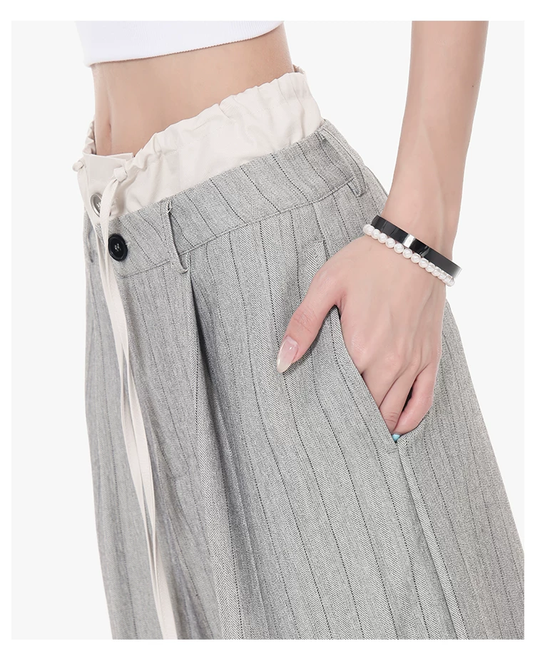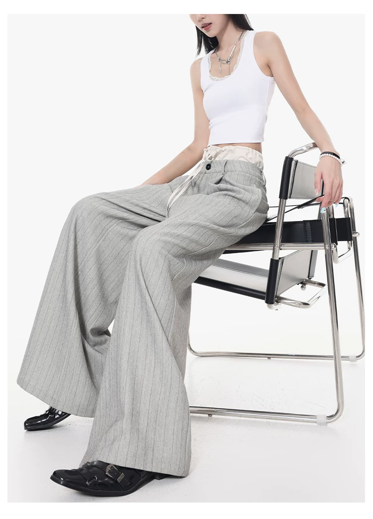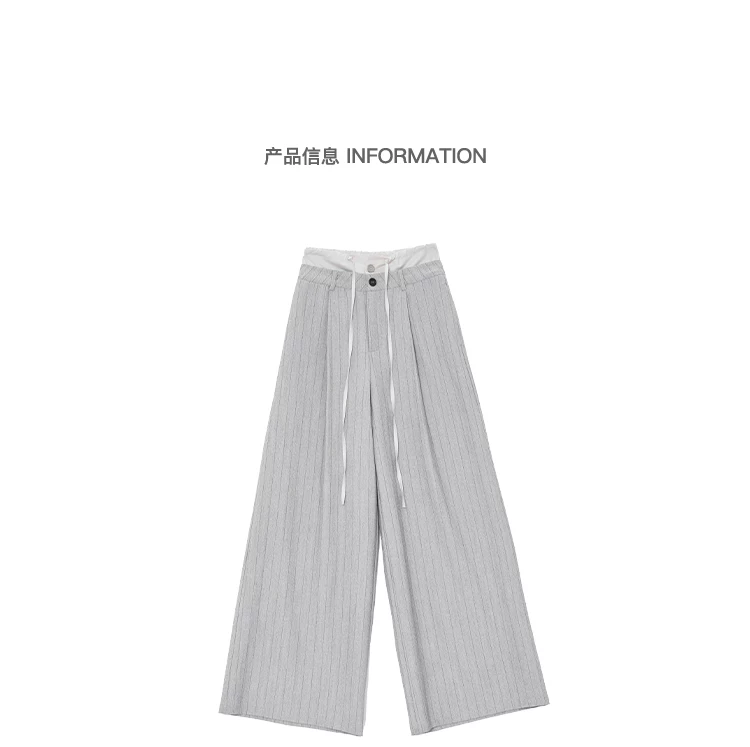 - KEN STUDIO Quần tây sọc xám hai eo mới mùa thu dành cho nữ, quần ống rộng cao cấp, quần dài đến sàn