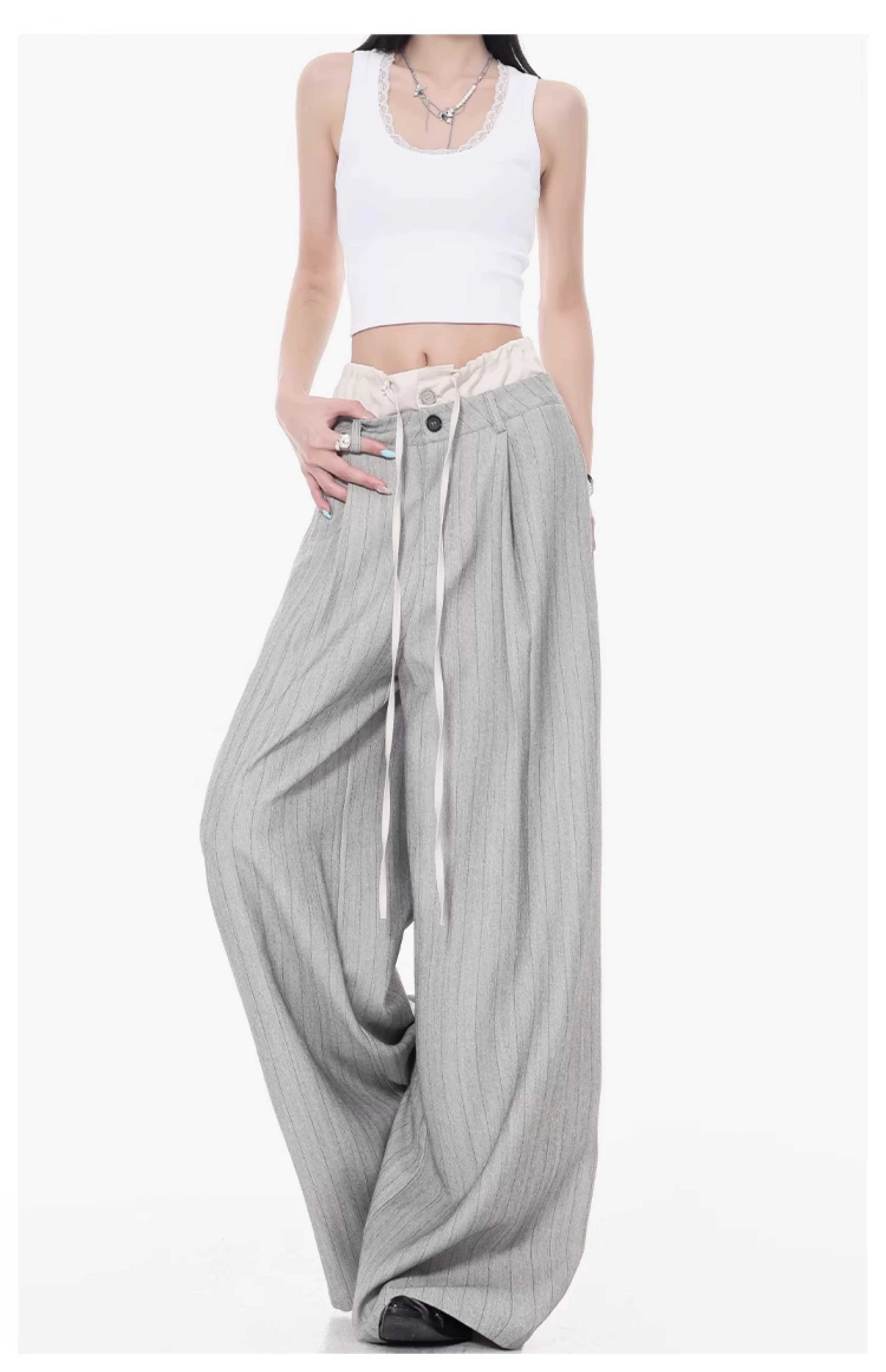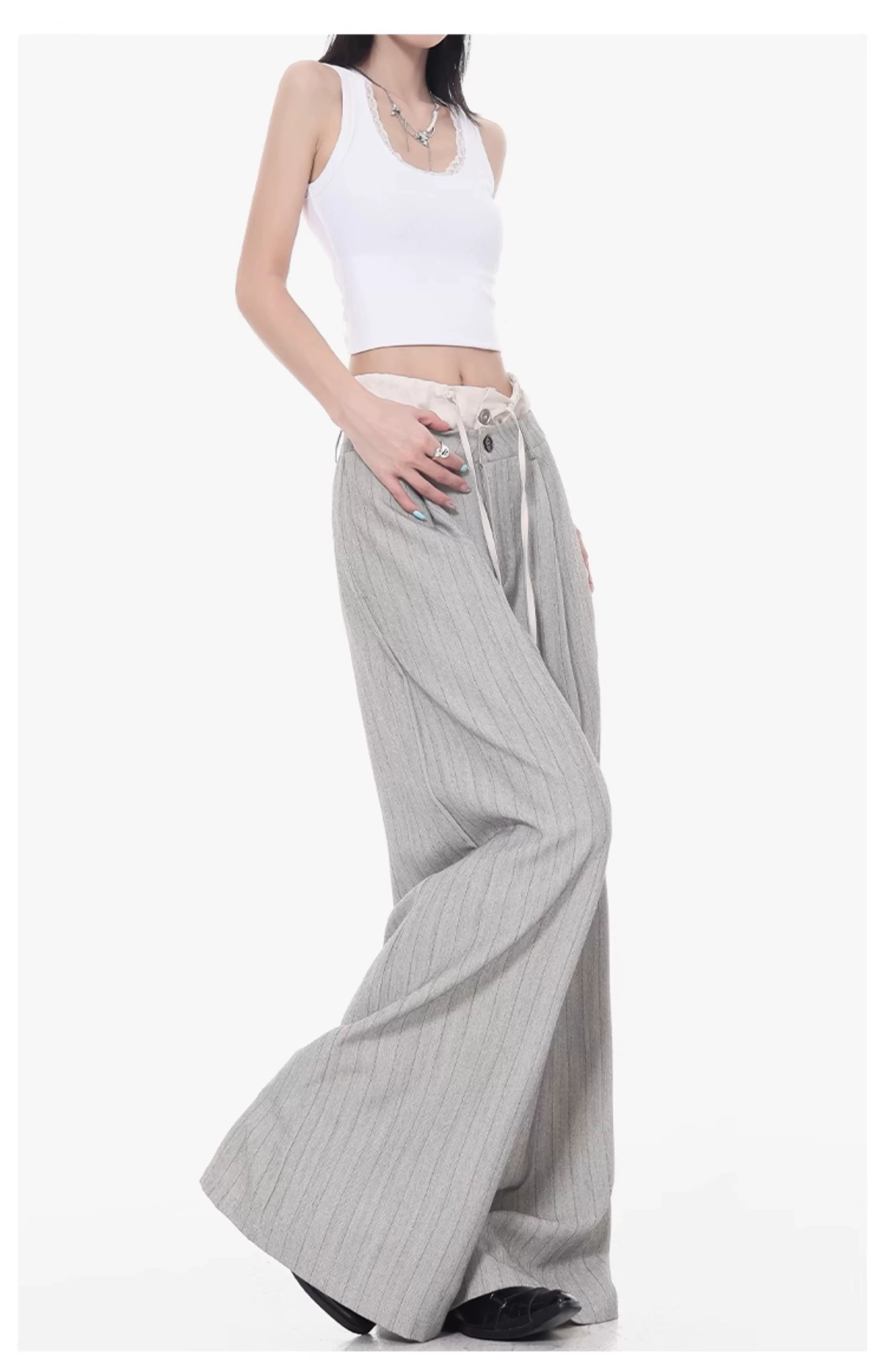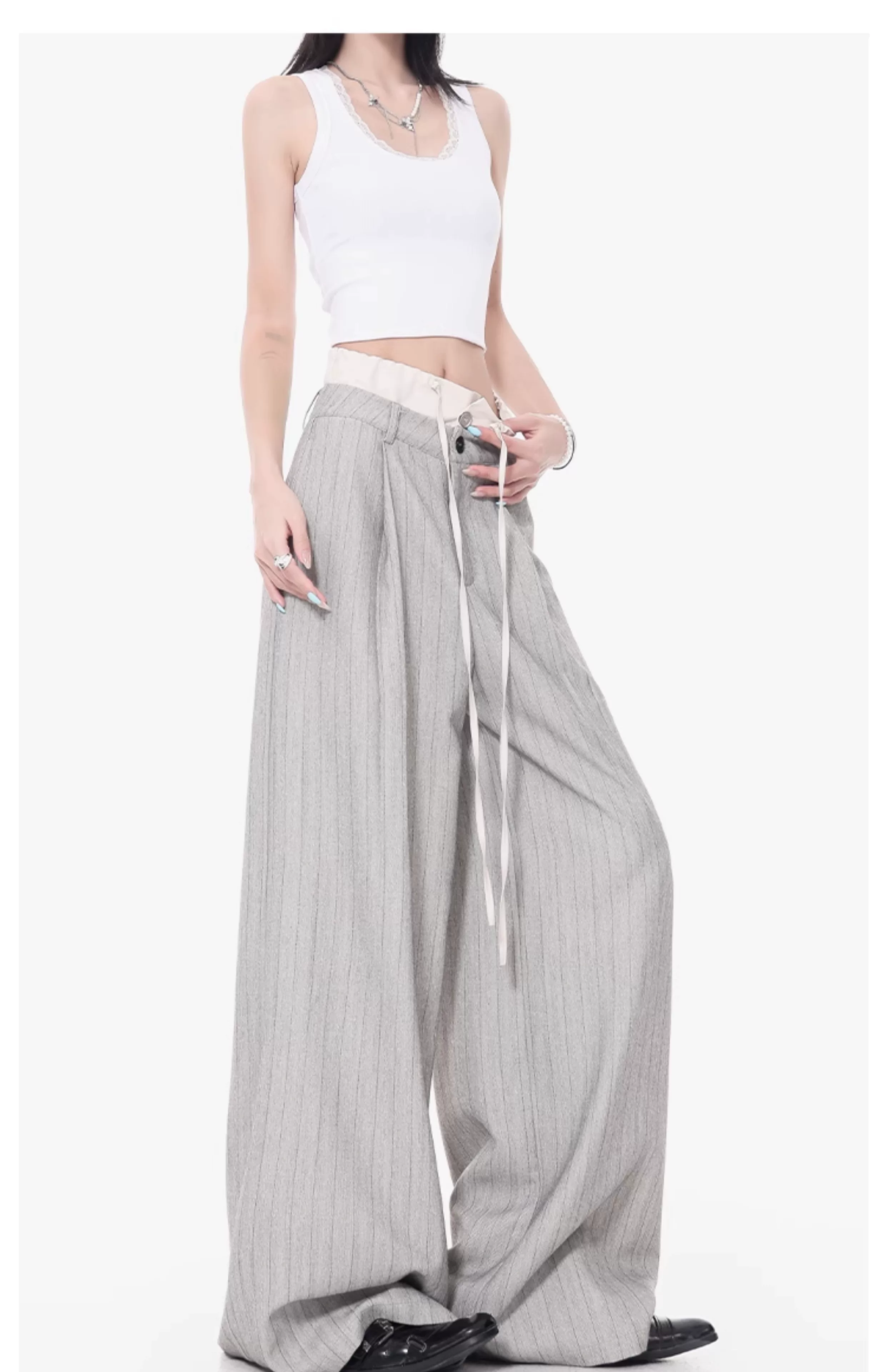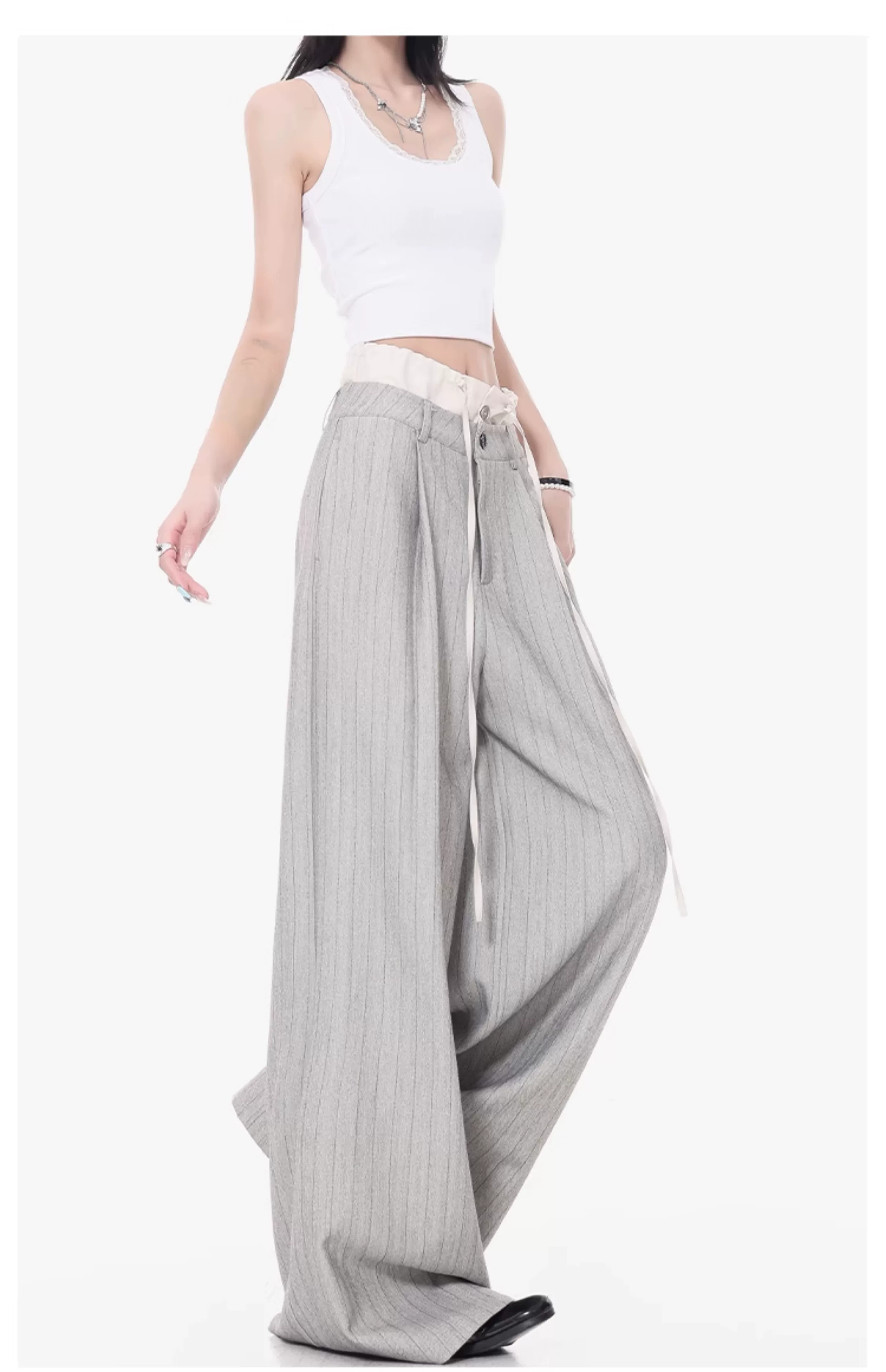 - KEN STUDIO Quần tây sọc xám hai eo mới mùa thu dành cho nữ, quần ống rộng cao cấp, quần dài đến sàn