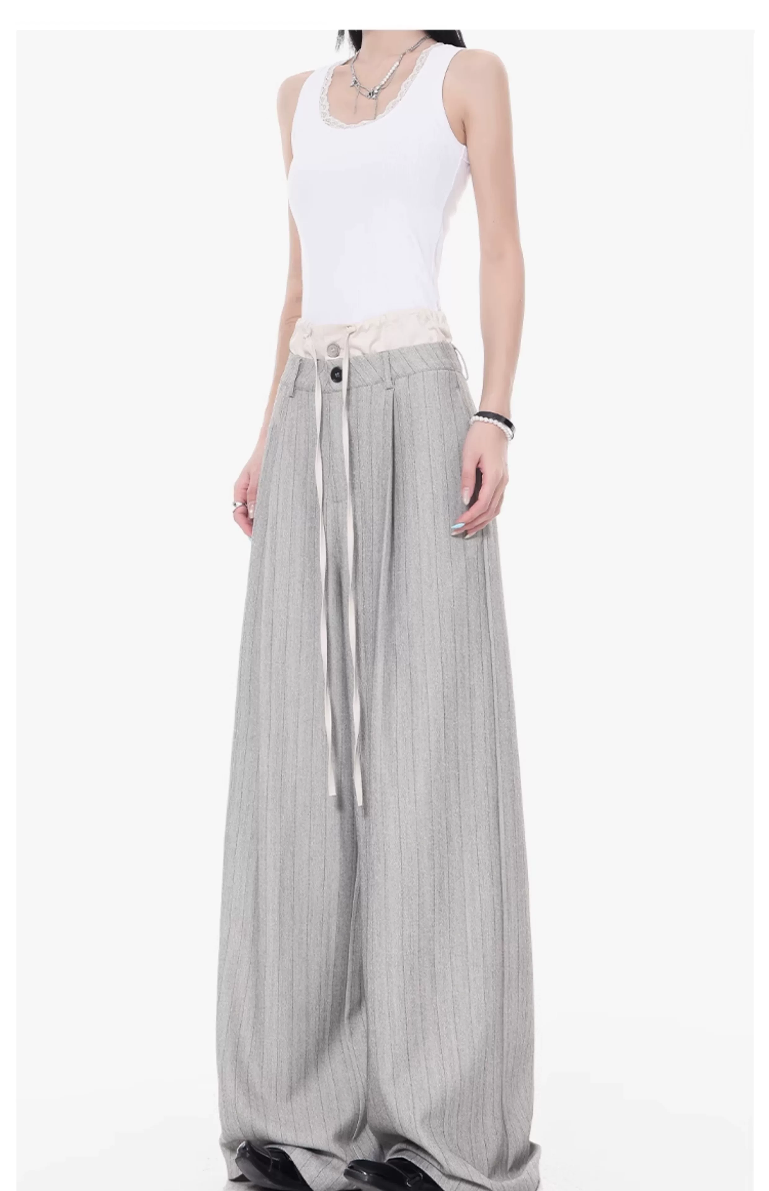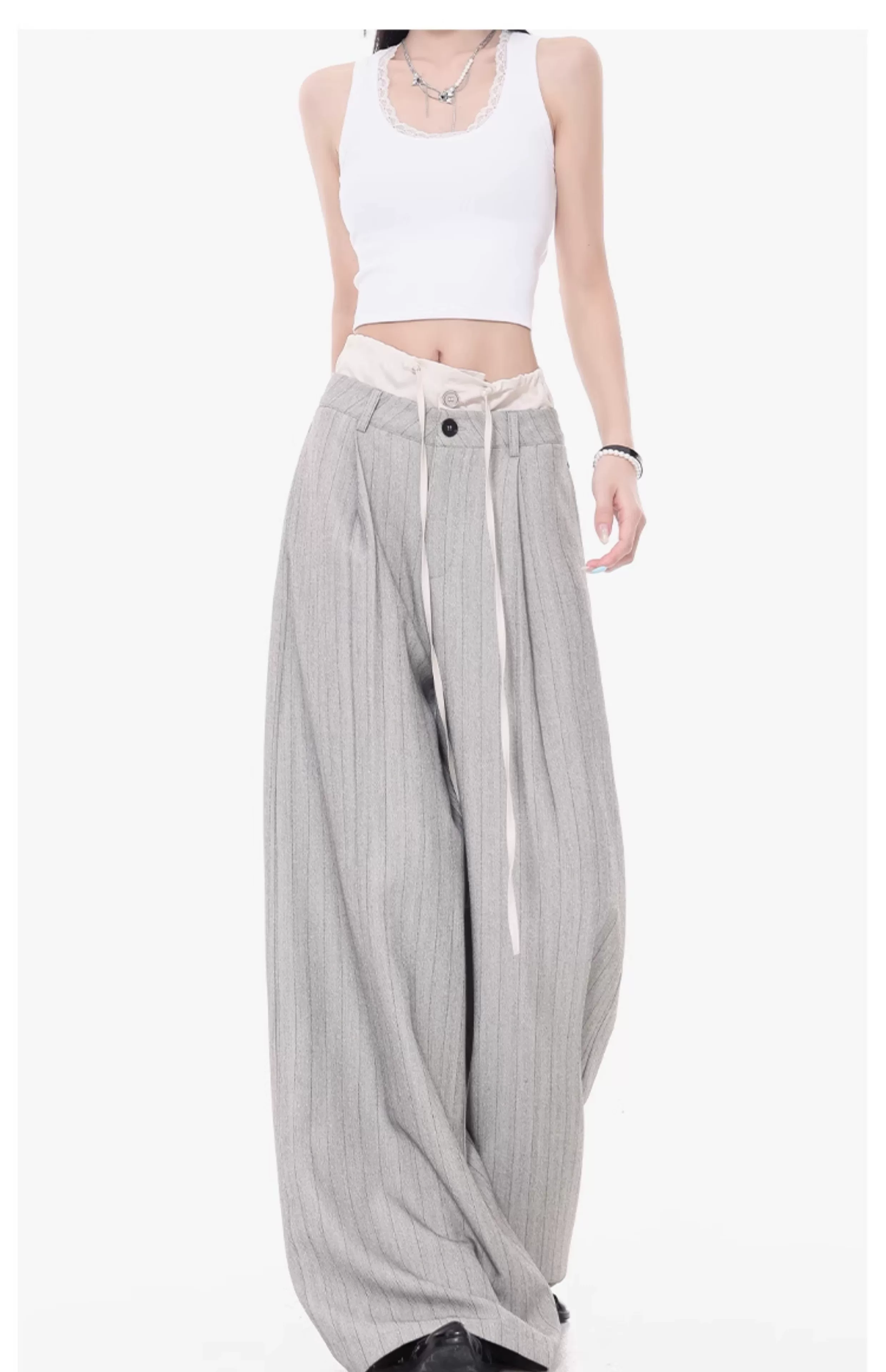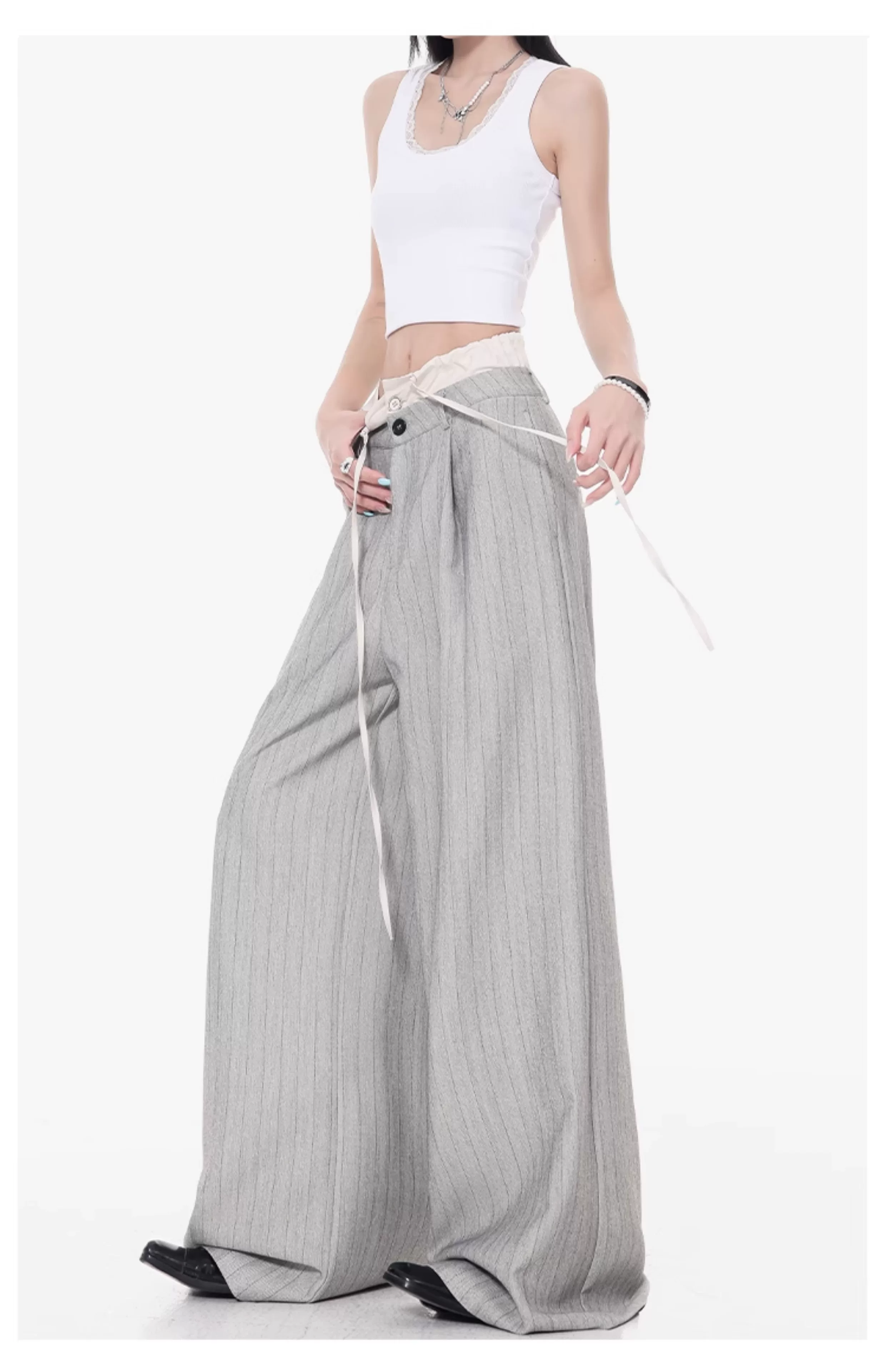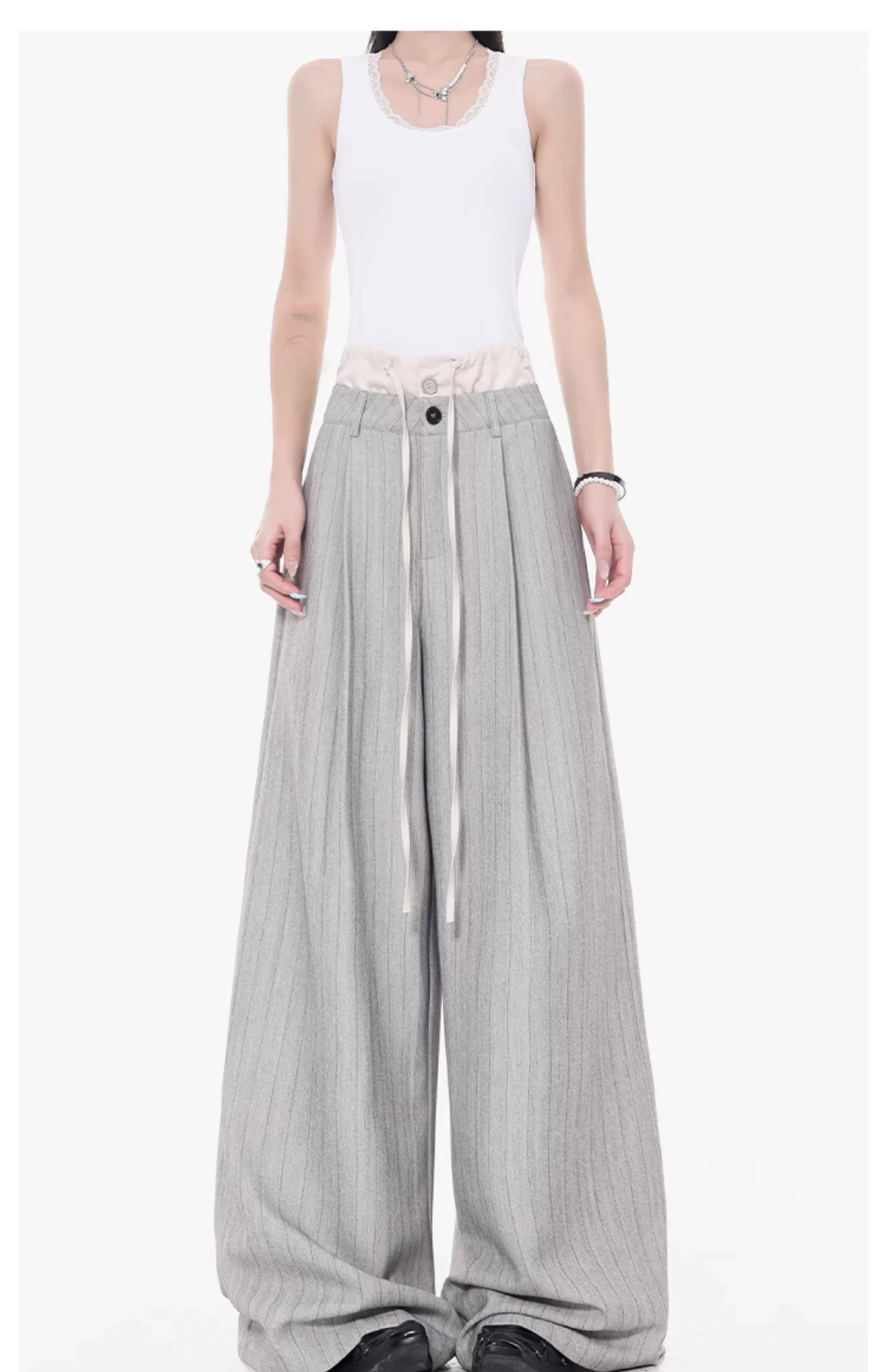 - KEN STUDIO Quần tây sọc xám hai eo mới mùa thu dành cho nữ, quần ống rộng cao cấp, quần dài đến sàn