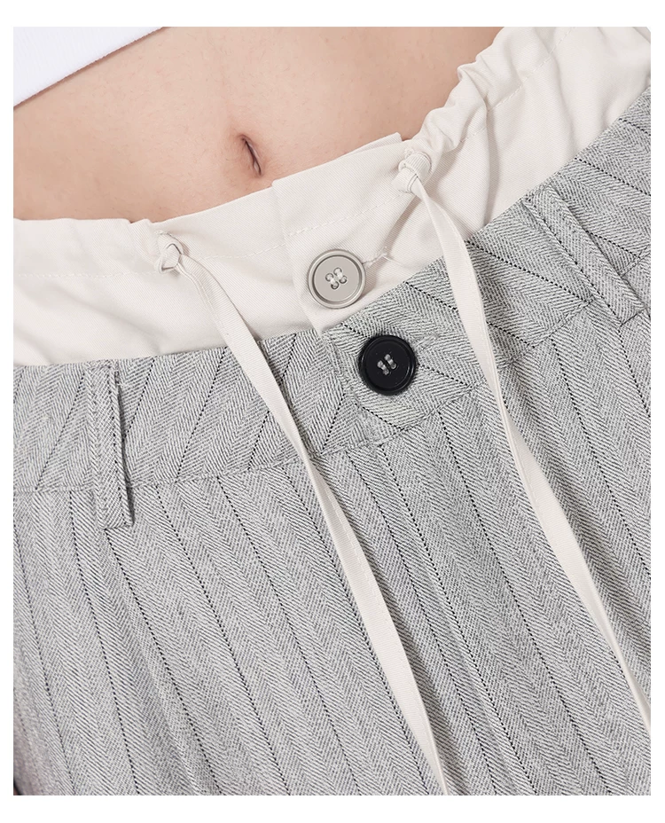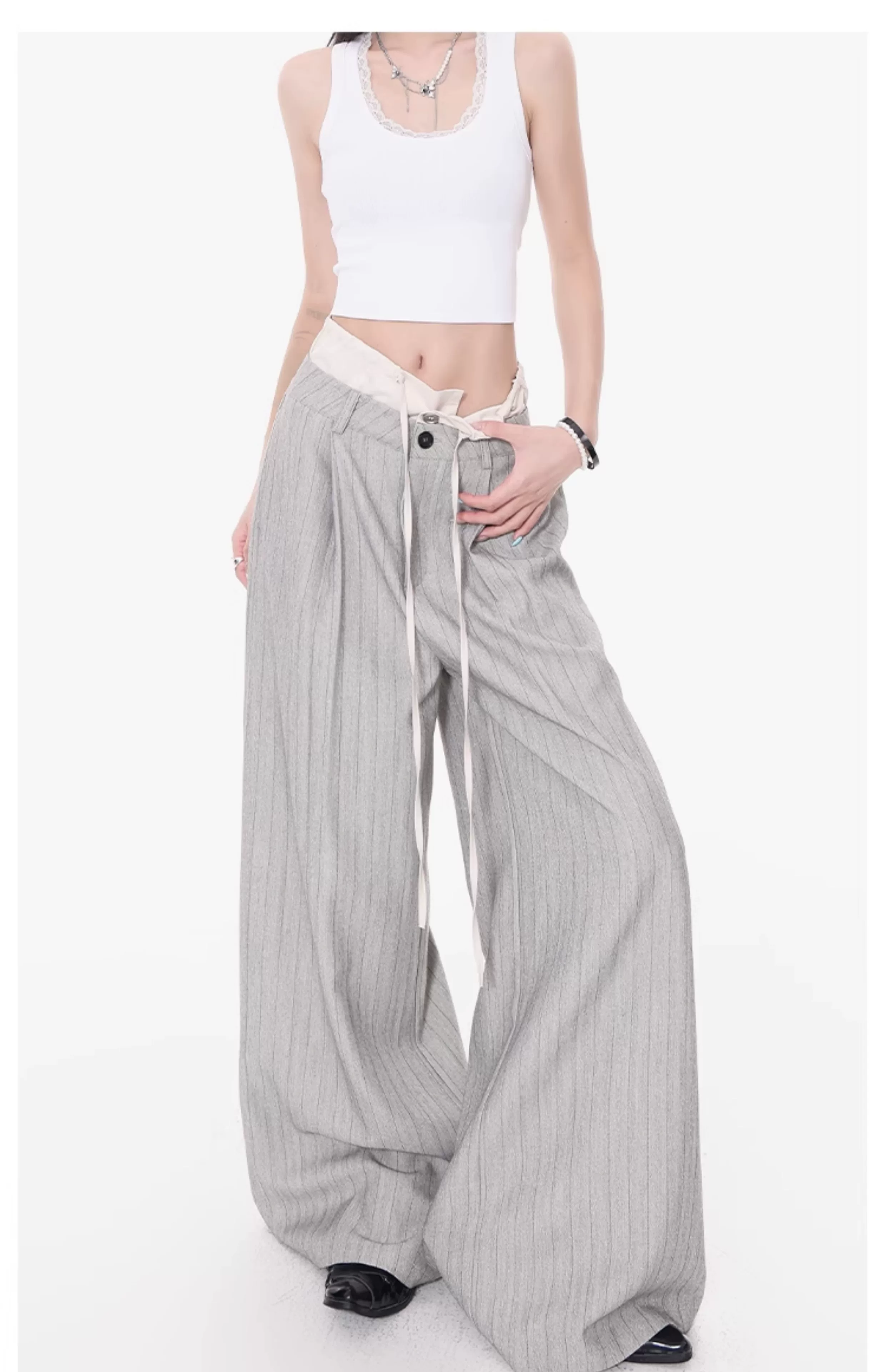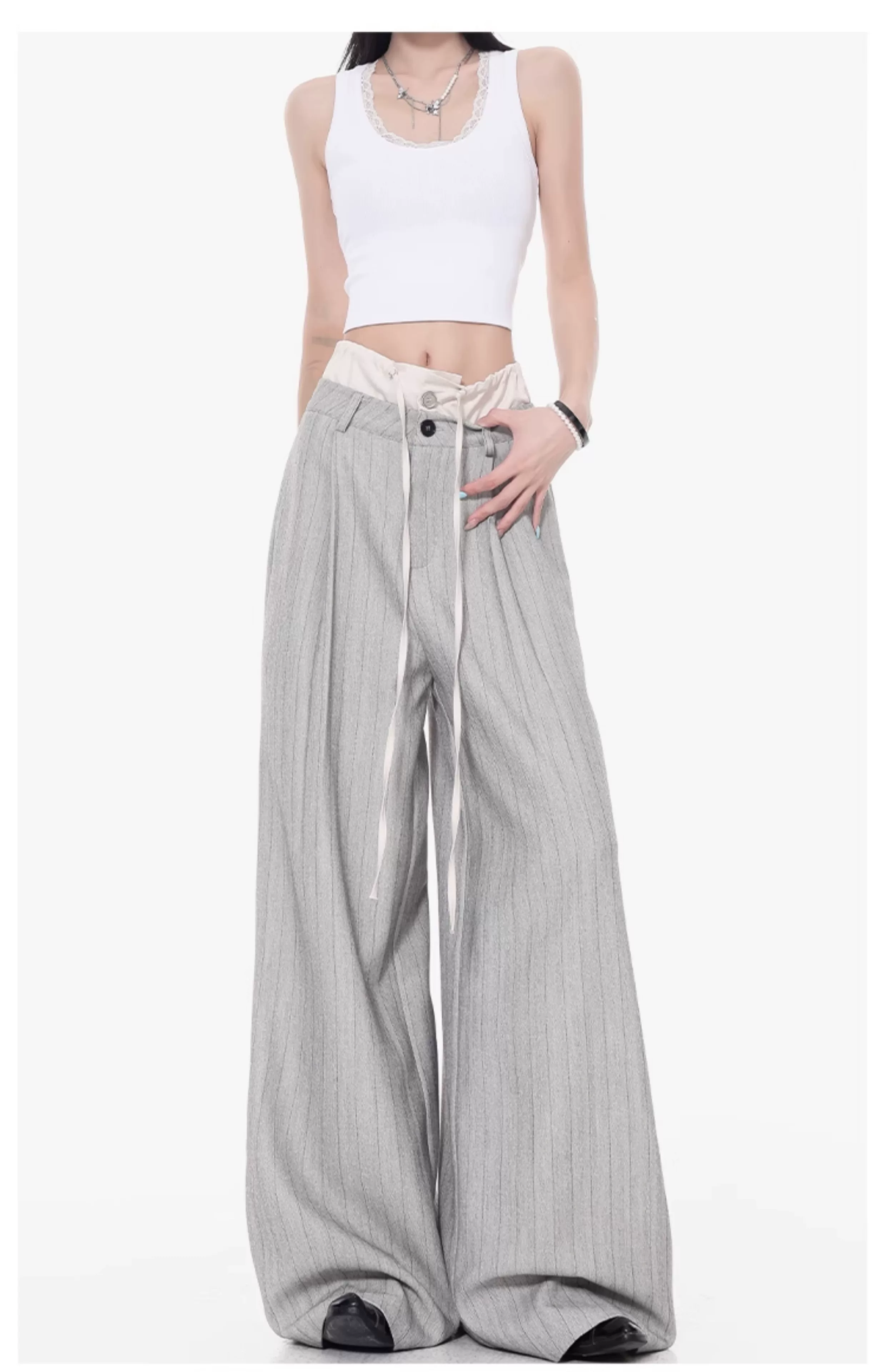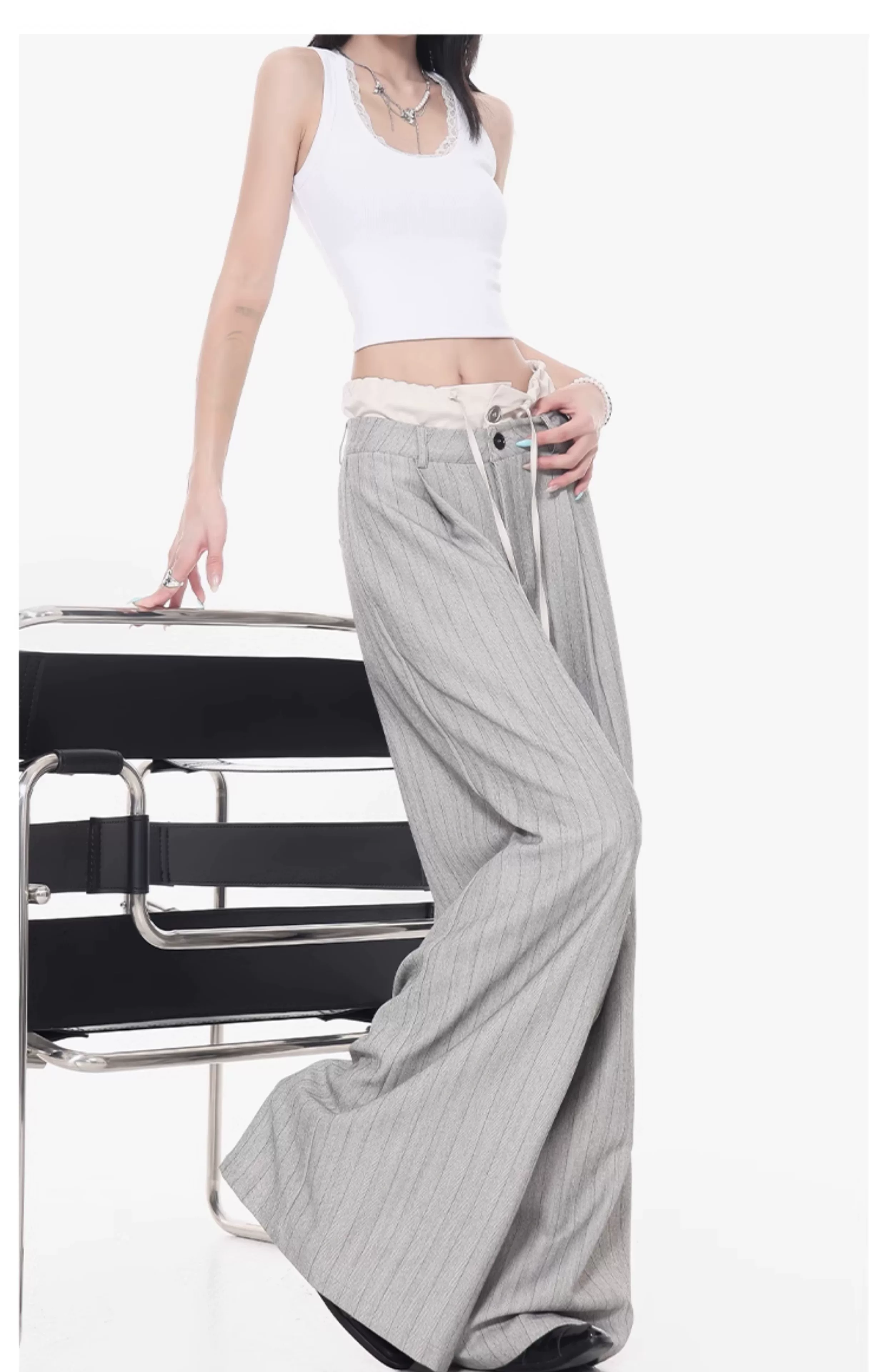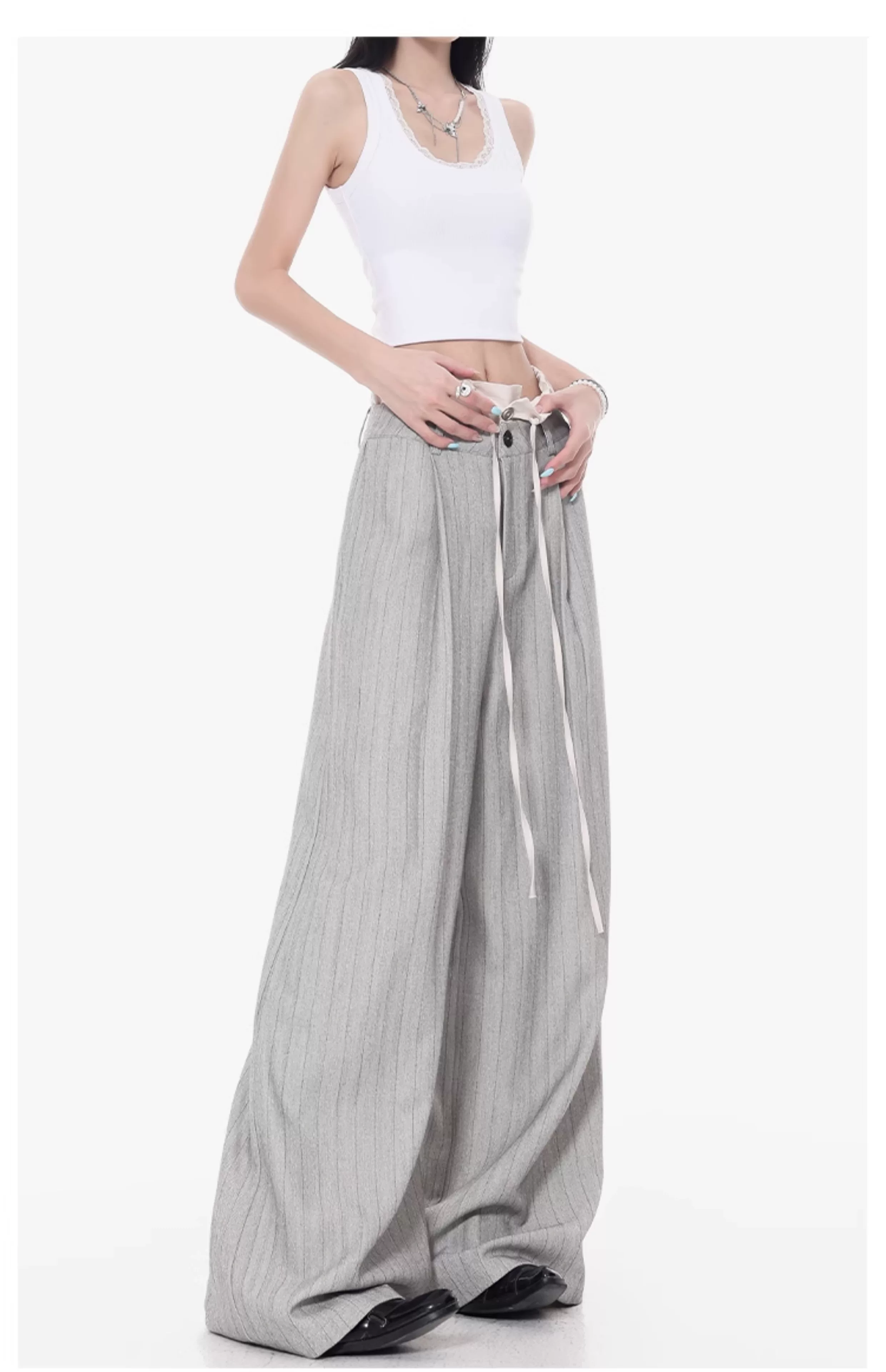 - KEN STUDIO Quần tây sọc xám hai eo mới mùa thu dành cho nữ, quần ống rộng cao cấp, quần dài đến sàn