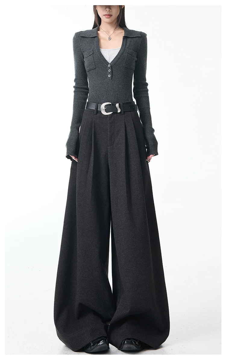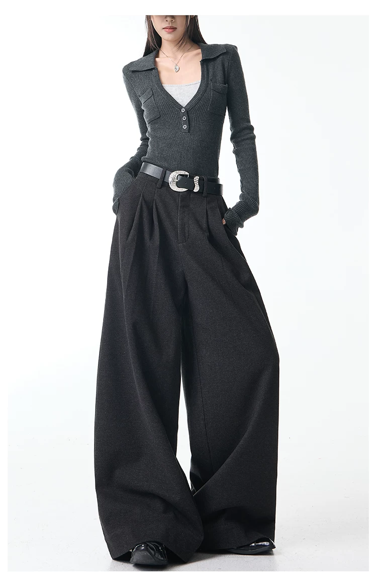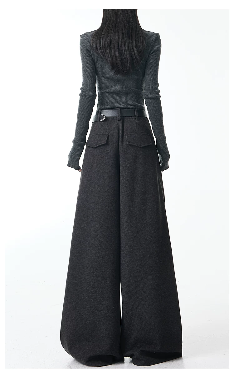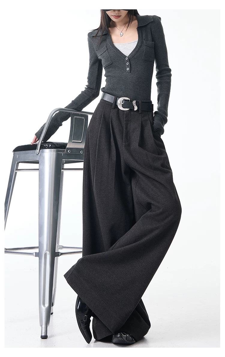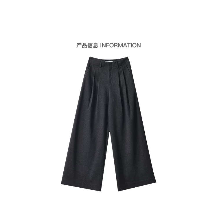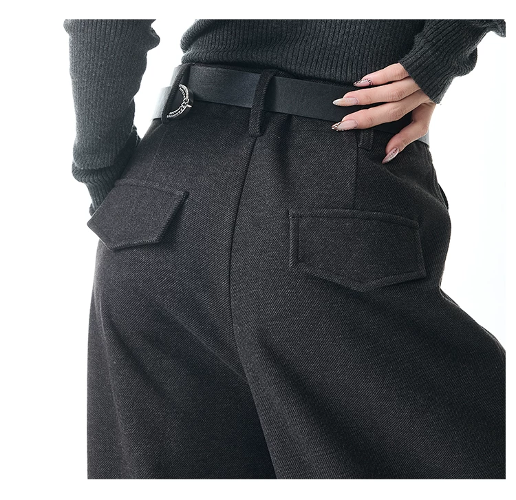 - KEN STUDIO Quần tây xếp ly len dày màu xám thu đông mới dành cho nữ, quần cạp cao, dáng rộng và suôn mềm