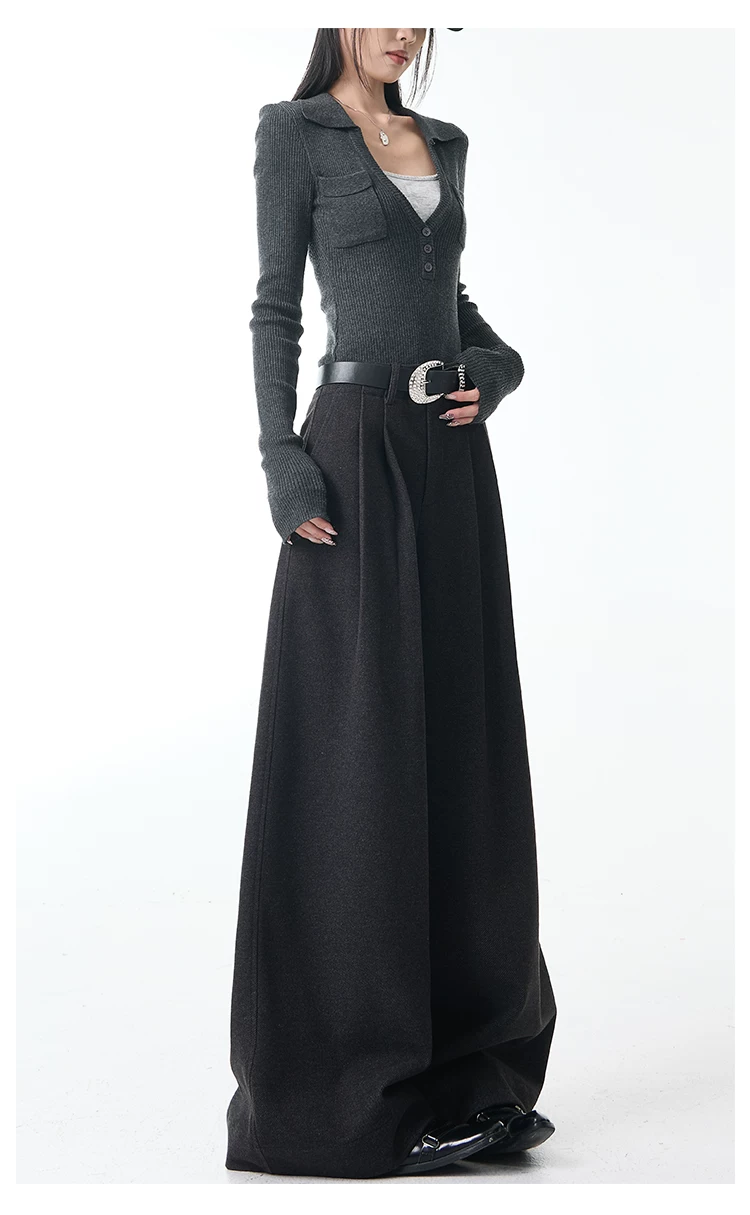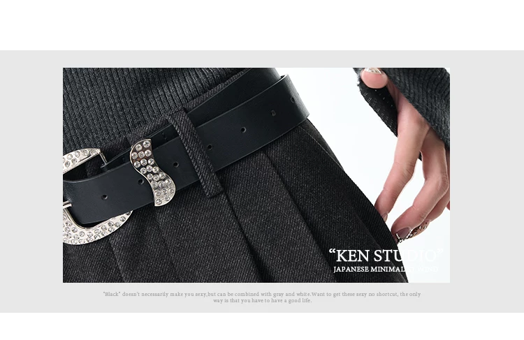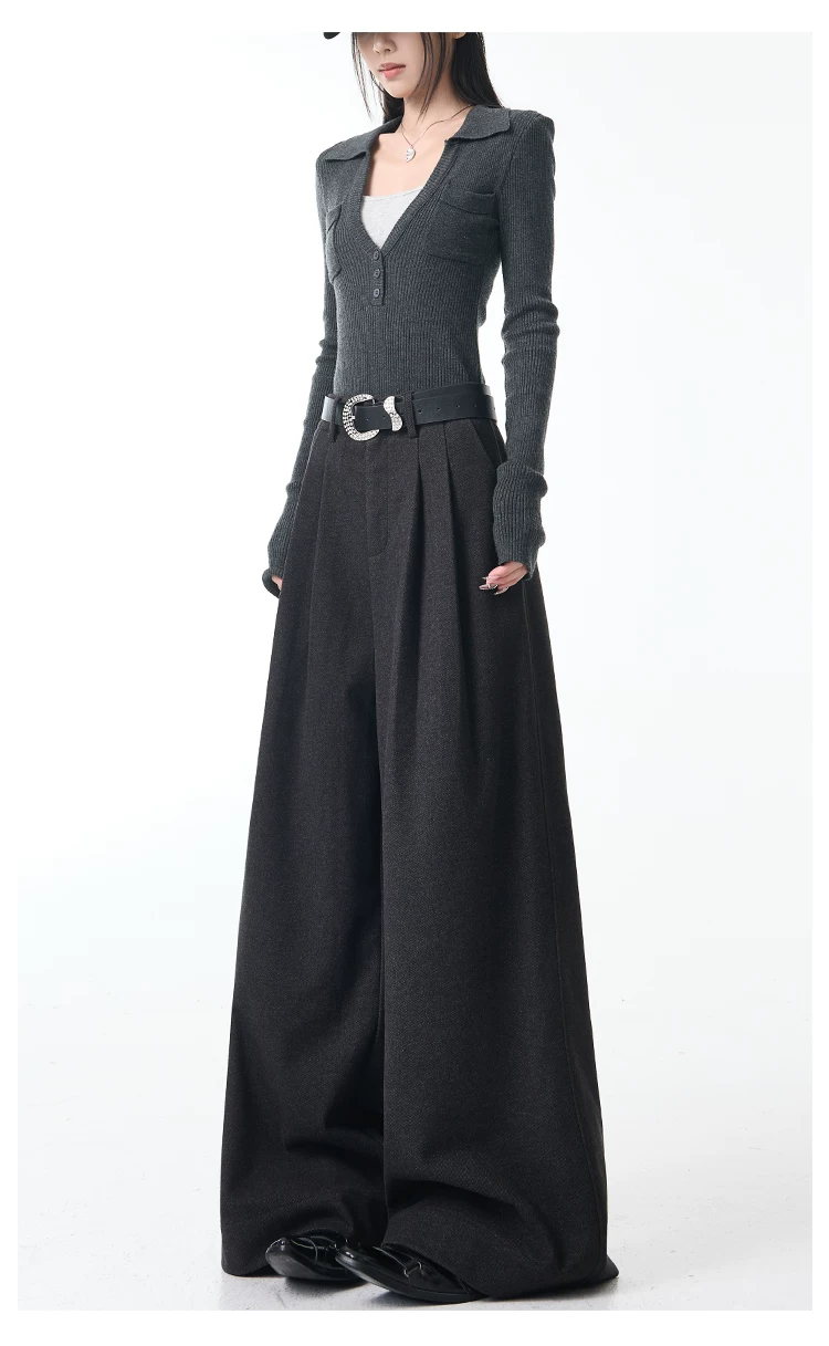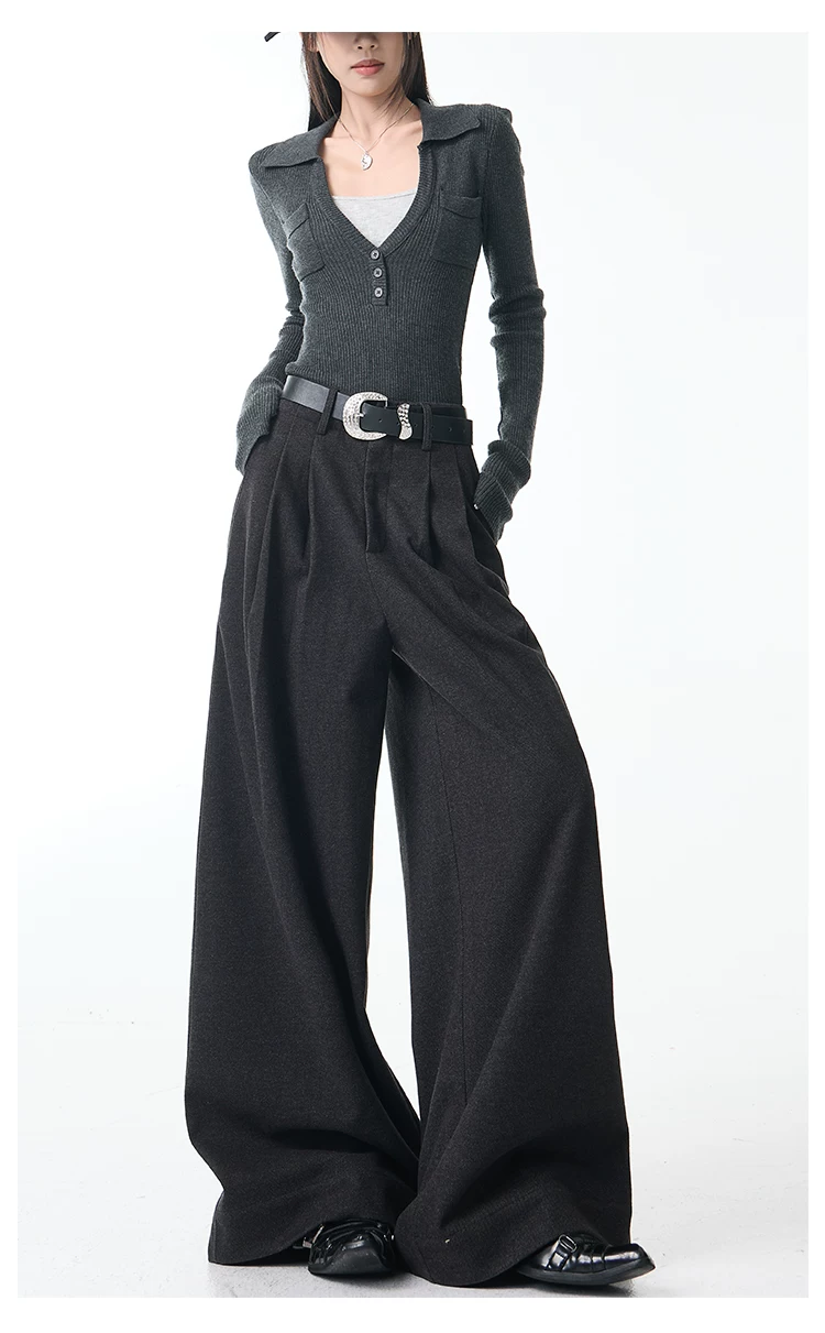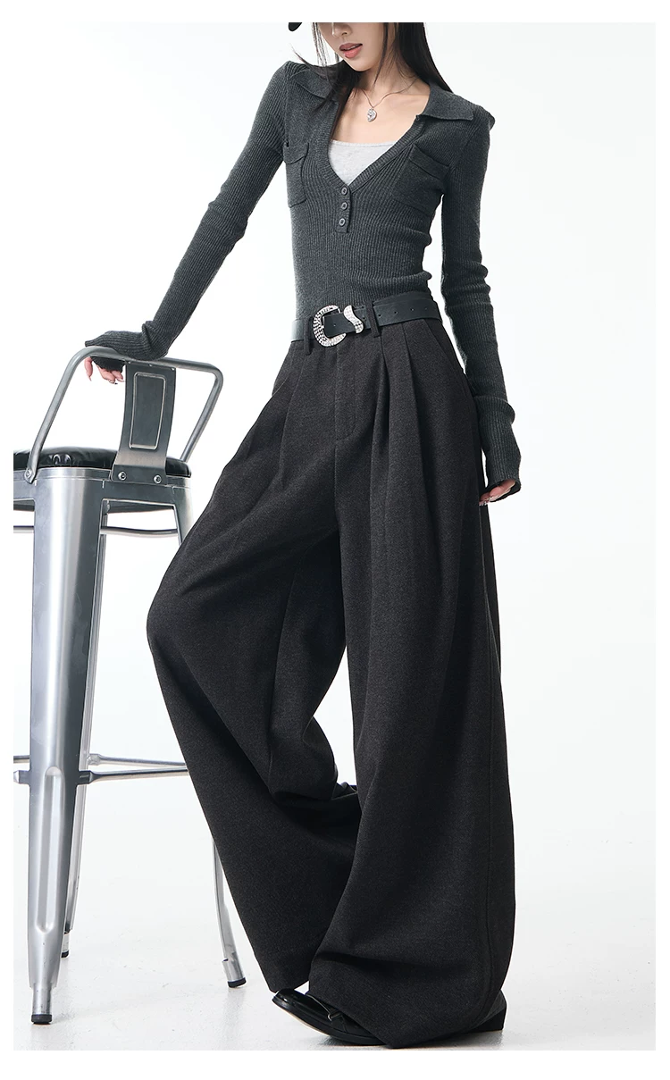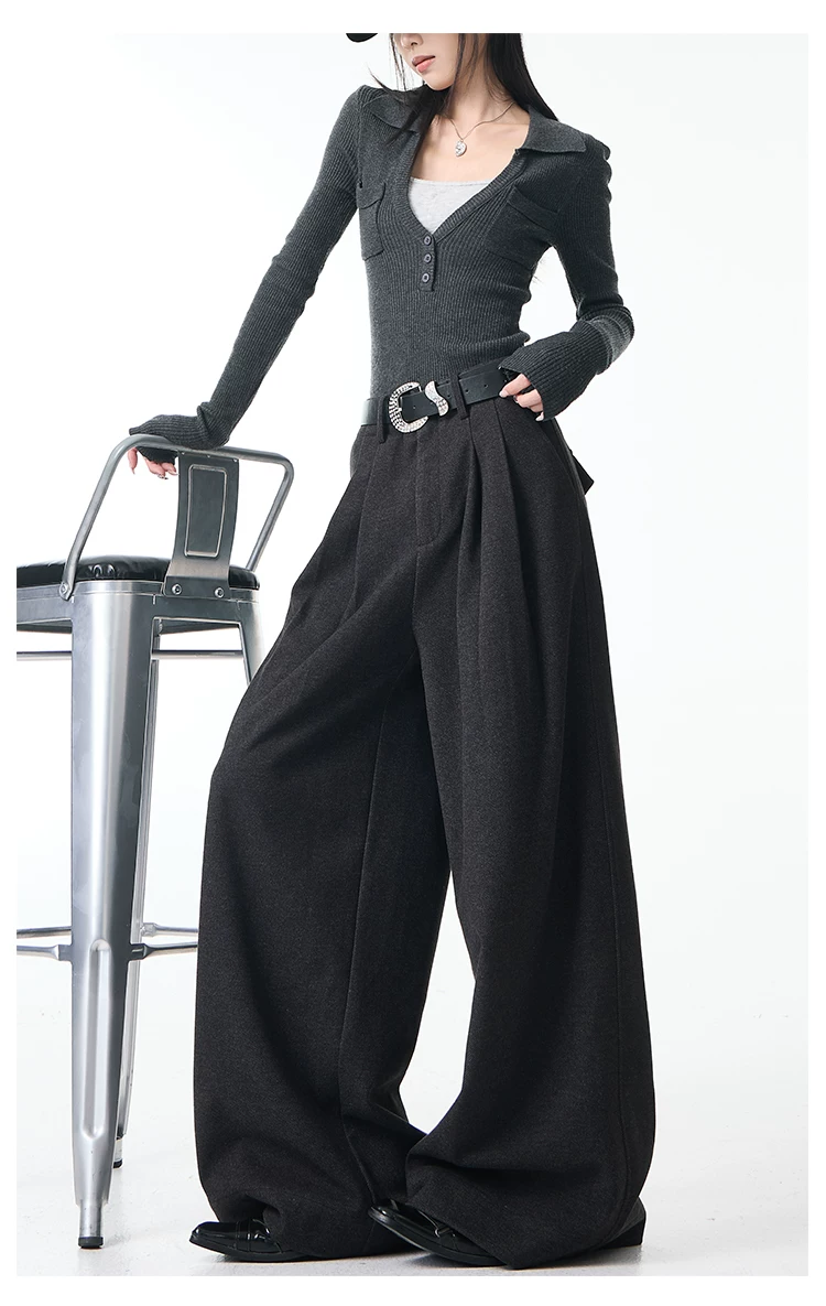 - KEN STUDIO Quần tây xếp ly len dày màu xám thu đông mới dành cho nữ, quần cạp cao, dáng rộng và suôn mềm
