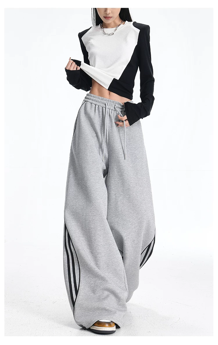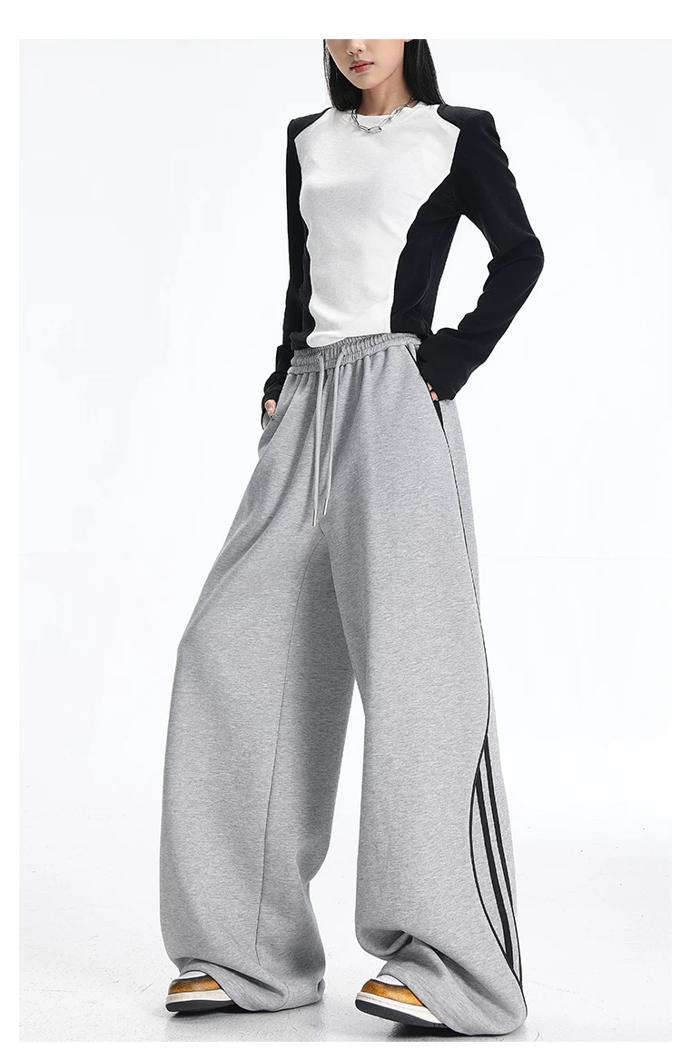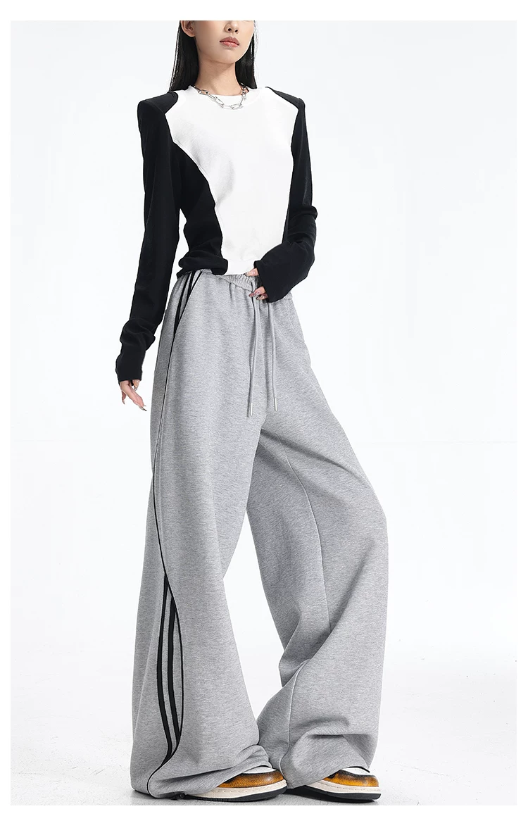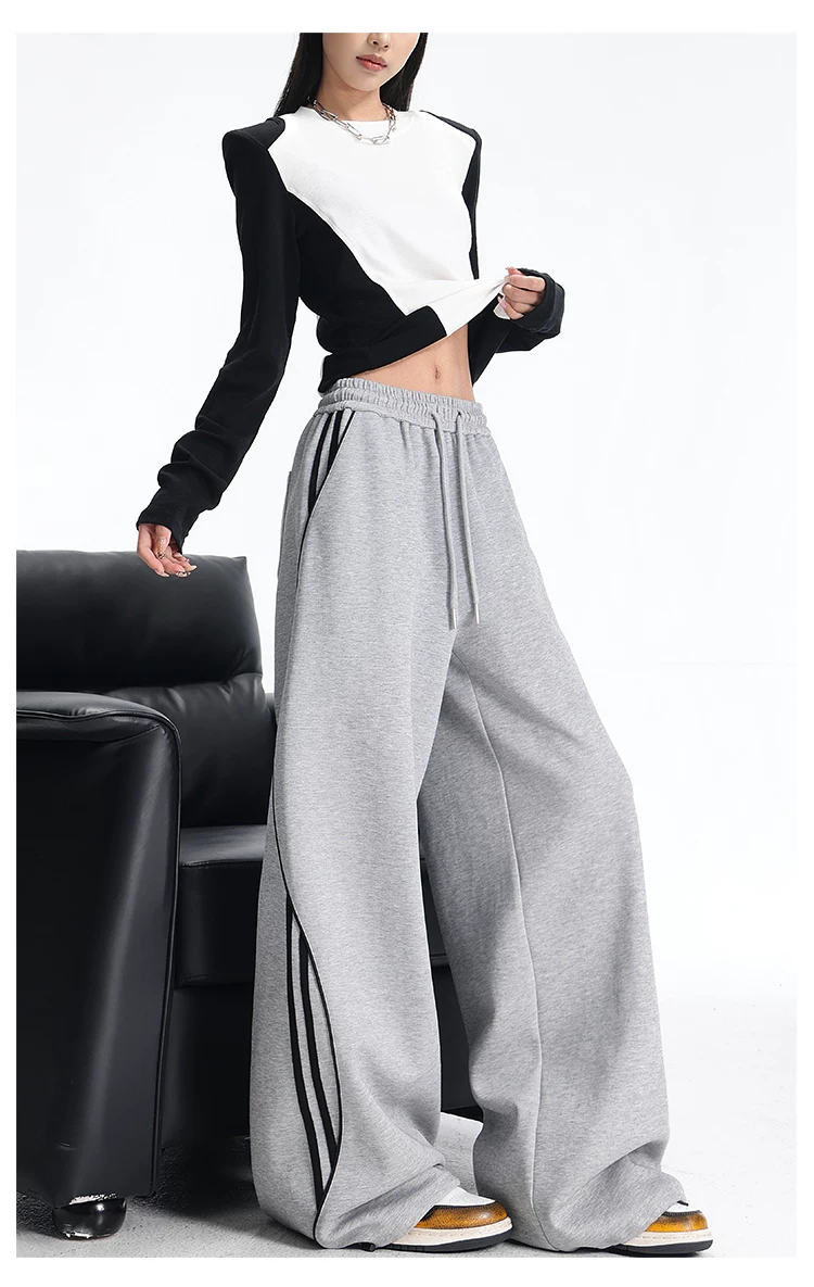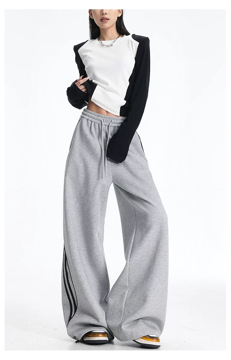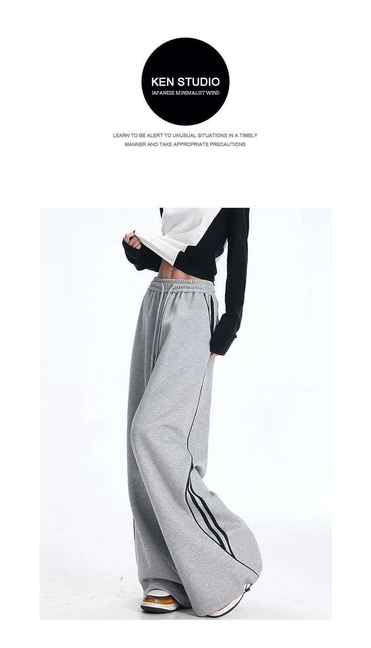 - KEN STUDIO quần thể thao ba sọc cổ điển mới của Mỹ mùa thu đông dành cho nữ, quần dáng rộng giảm béo thông thường