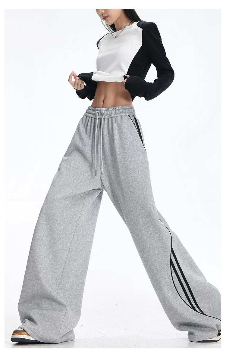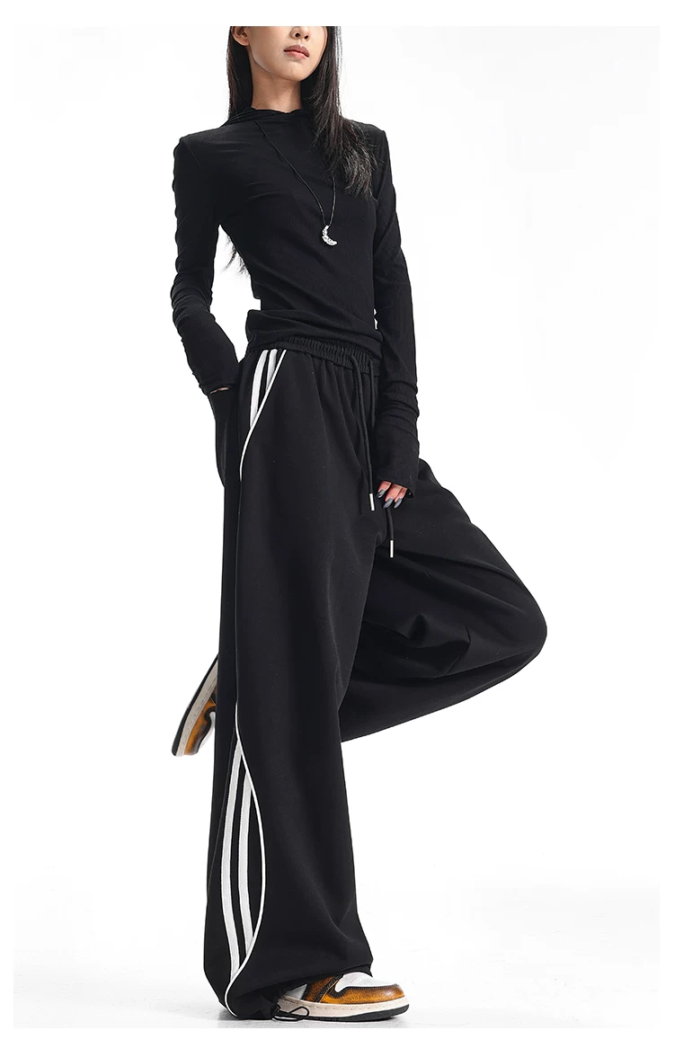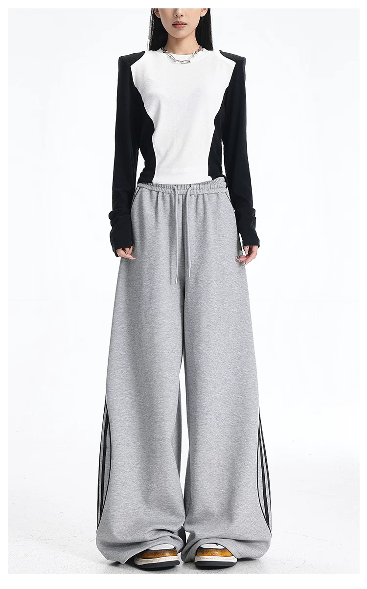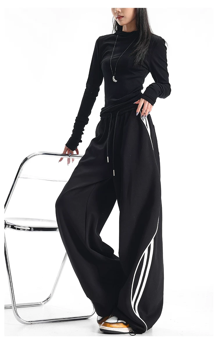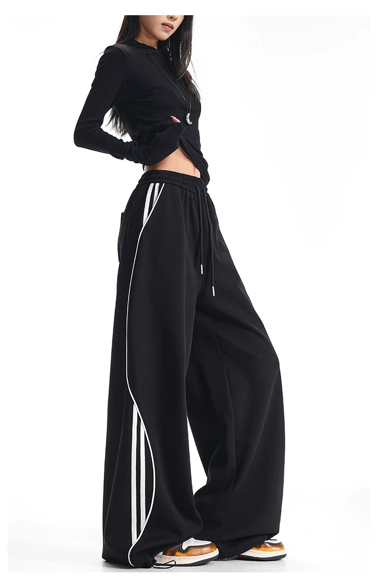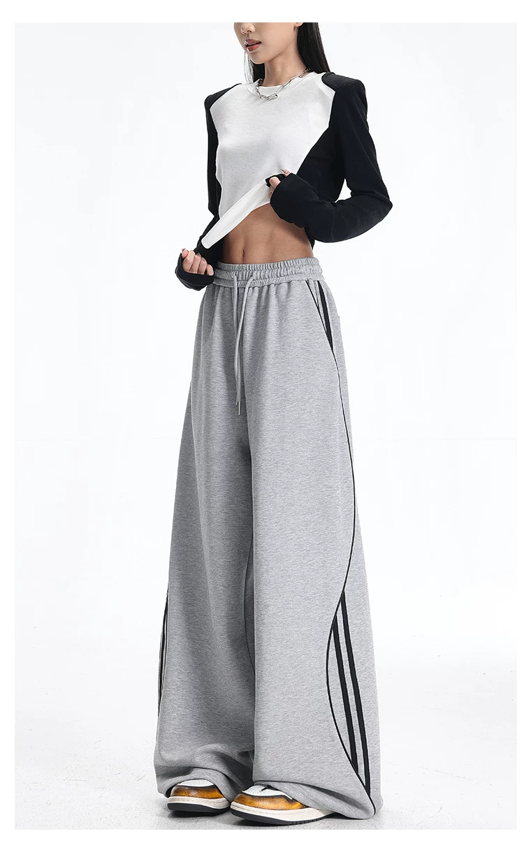 - KEN STUDIO quần thể thao ba sọc cổ điển mới của Mỹ mùa thu đông dành cho nữ, quần dáng rộng giảm béo thông thường