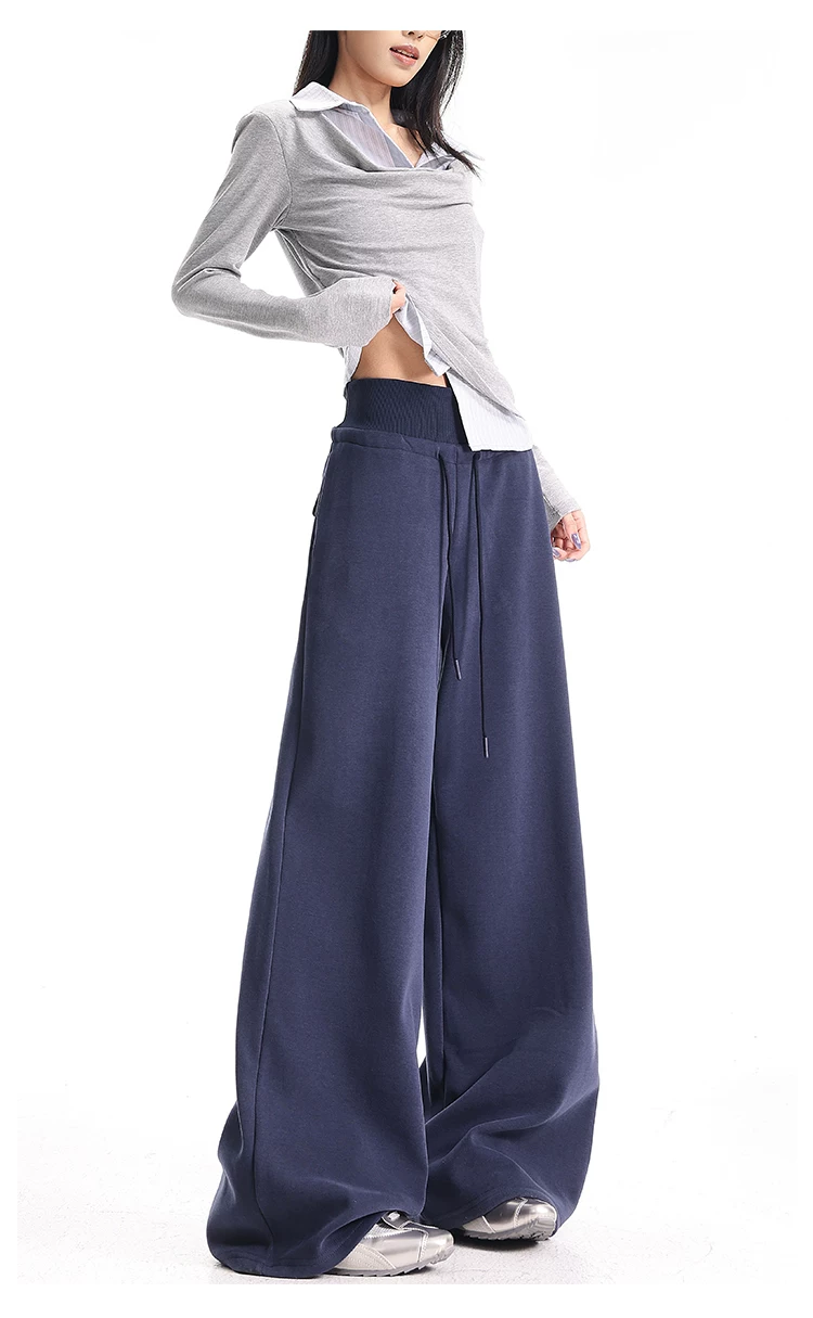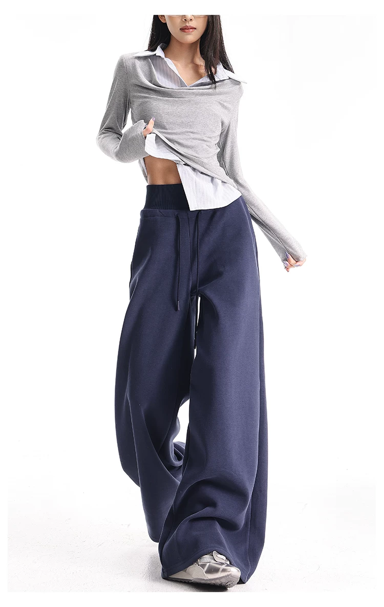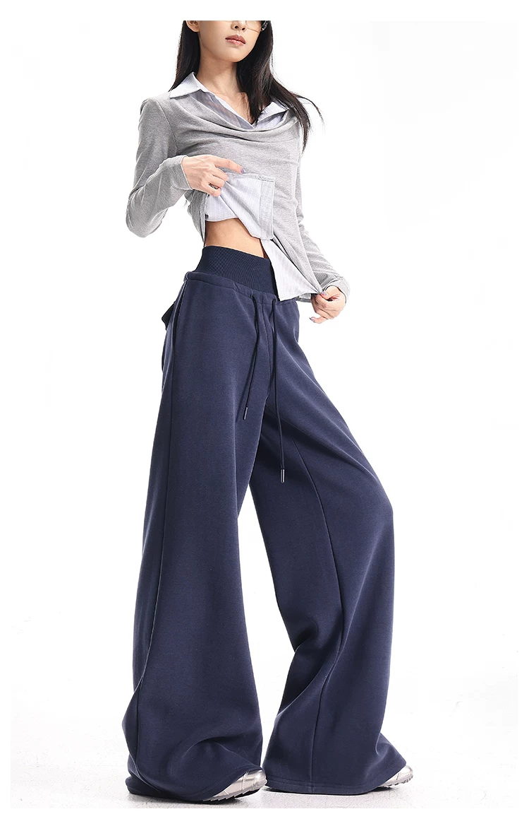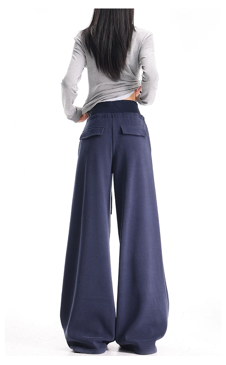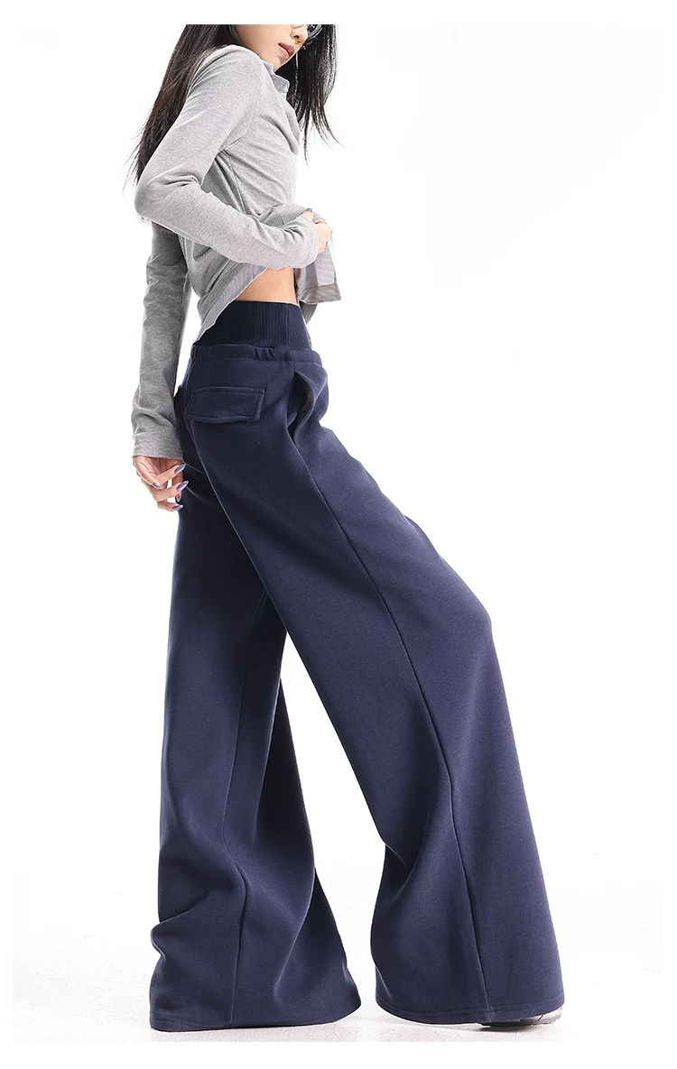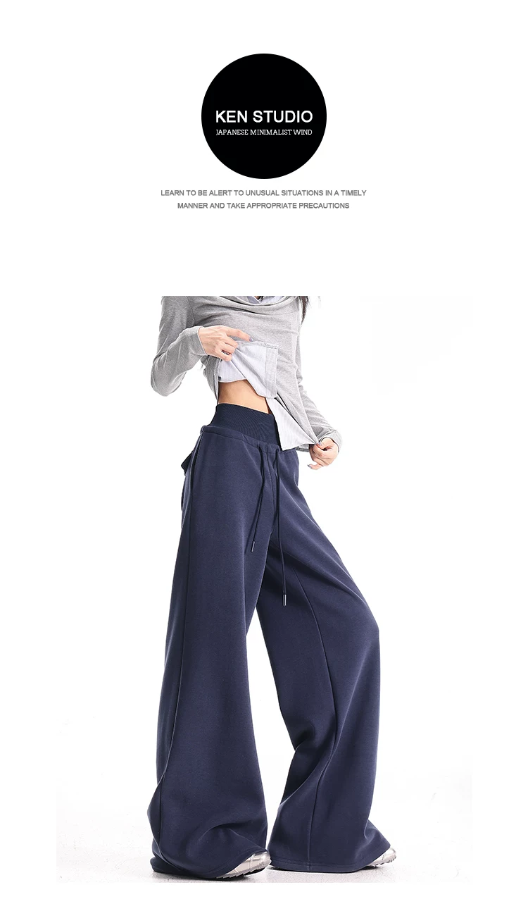 - KEN STUDIO Quần thể thao dáng rộng màu xanh lam phong cách Mỹ mới dành cho nữ, có lót lông cừu, dày dặn, quần thể thao ống rộng