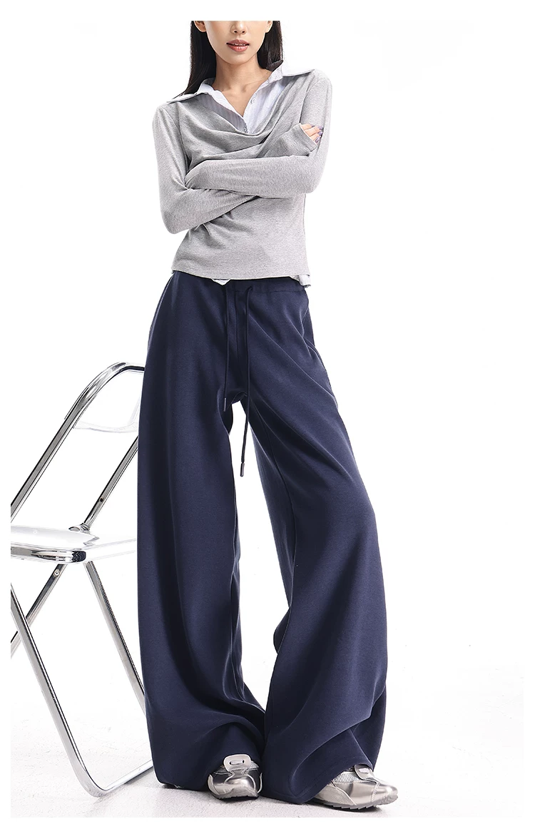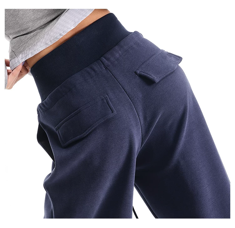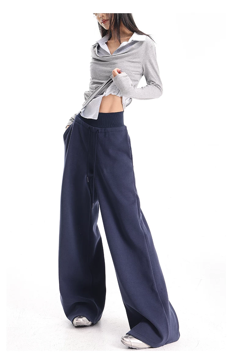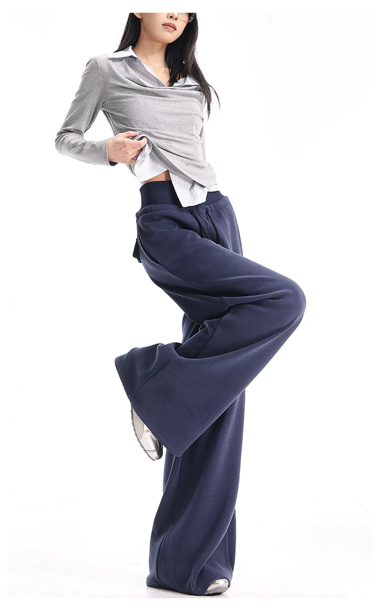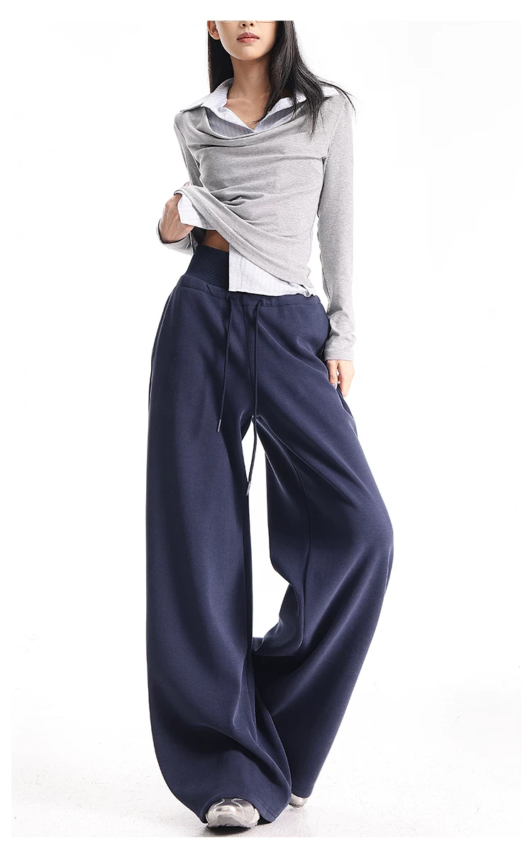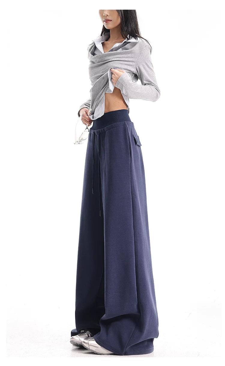 - KEN STUDIO Quần thể thao dáng rộng màu xanh lam phong cách Mỹ mới dành cho nữ, có lót lông cừu, dày dặn, quần thể thao ống rộng