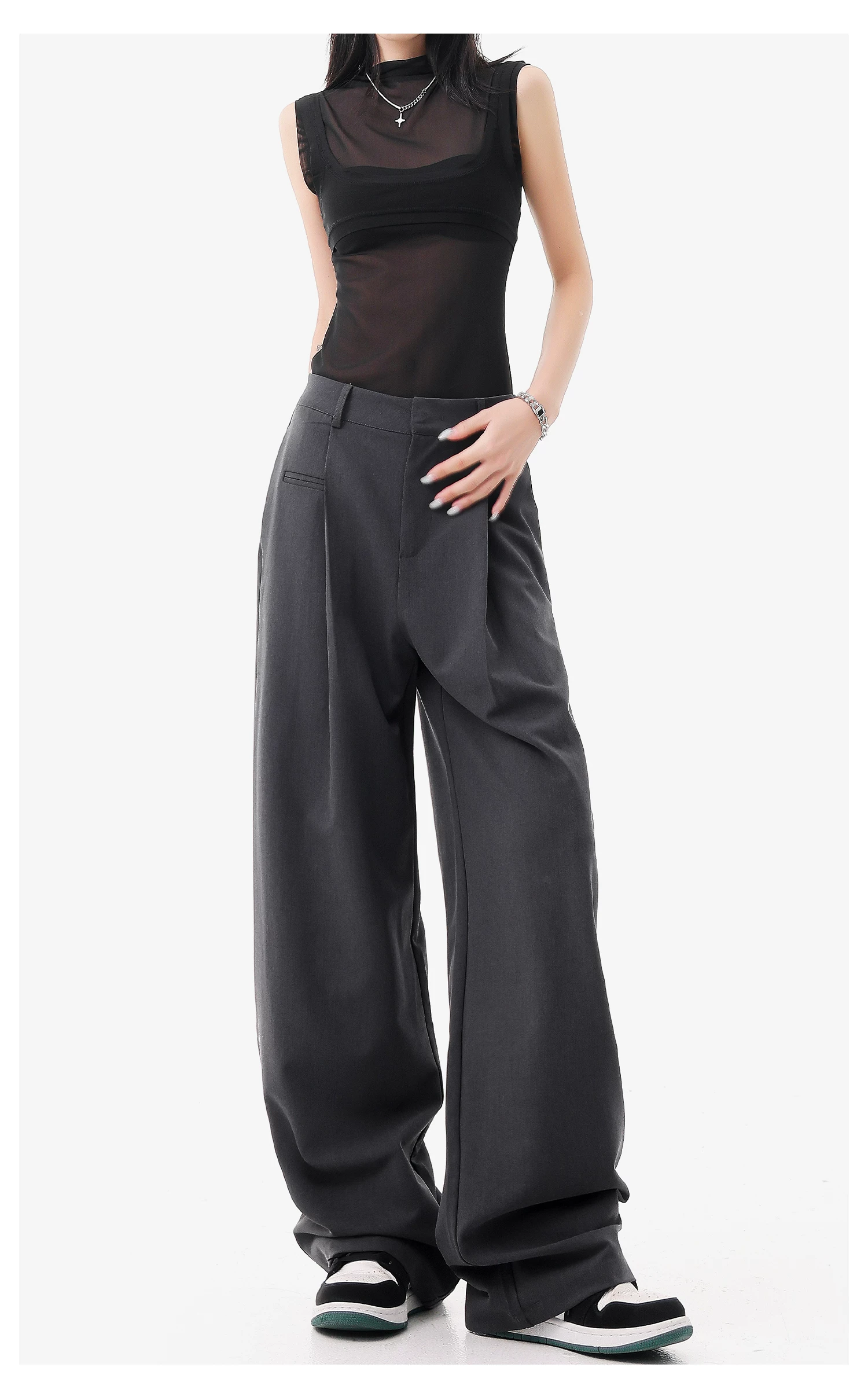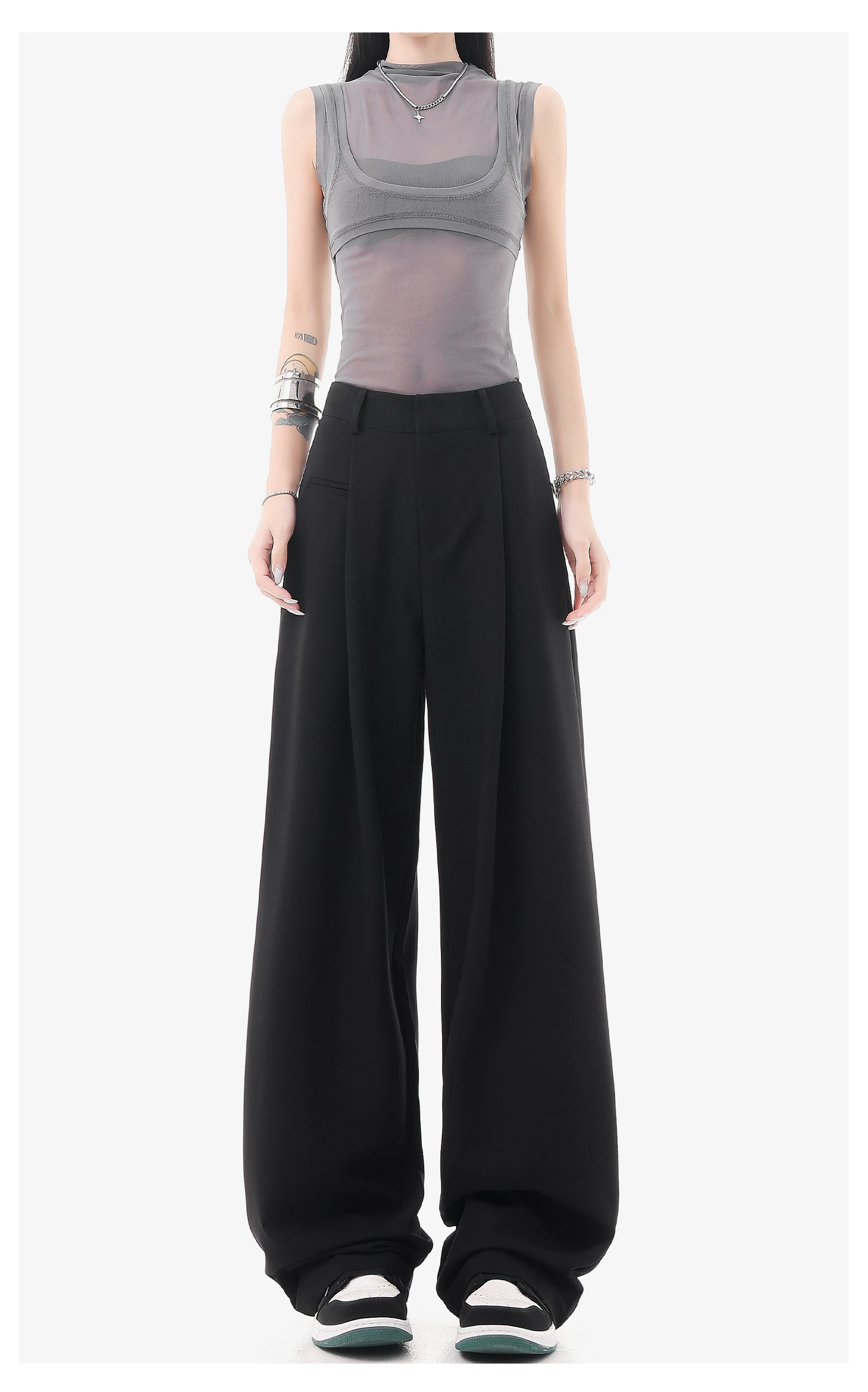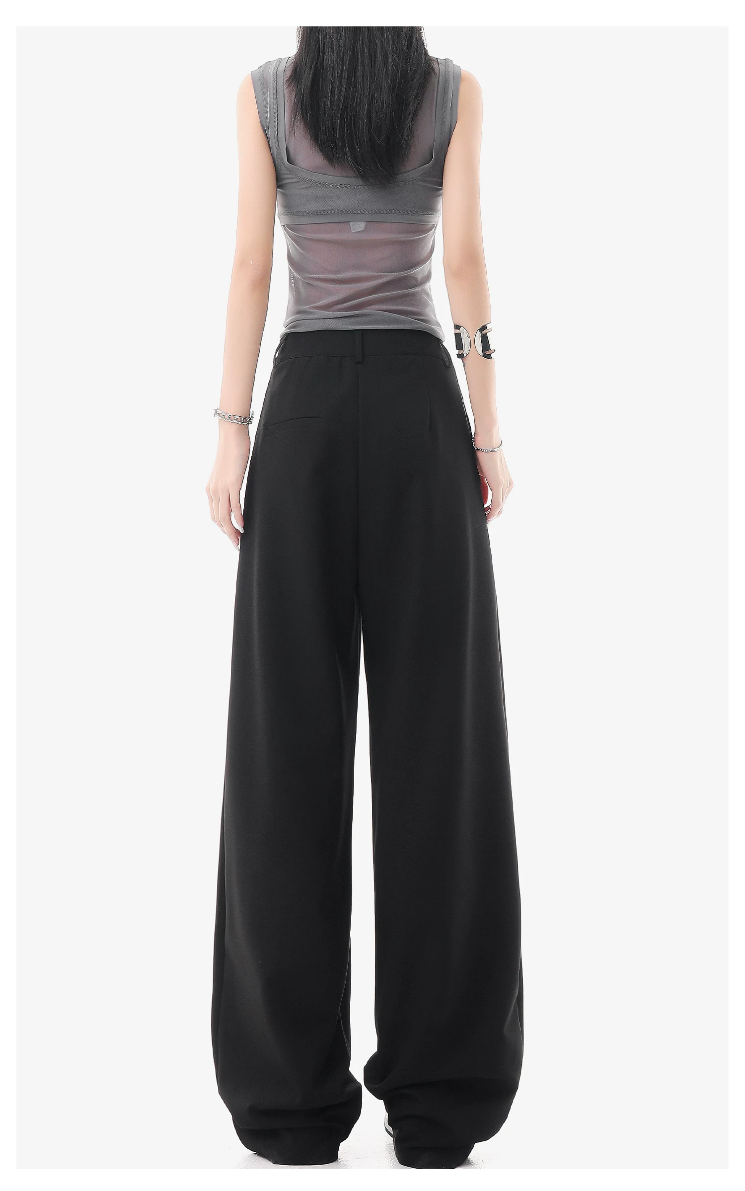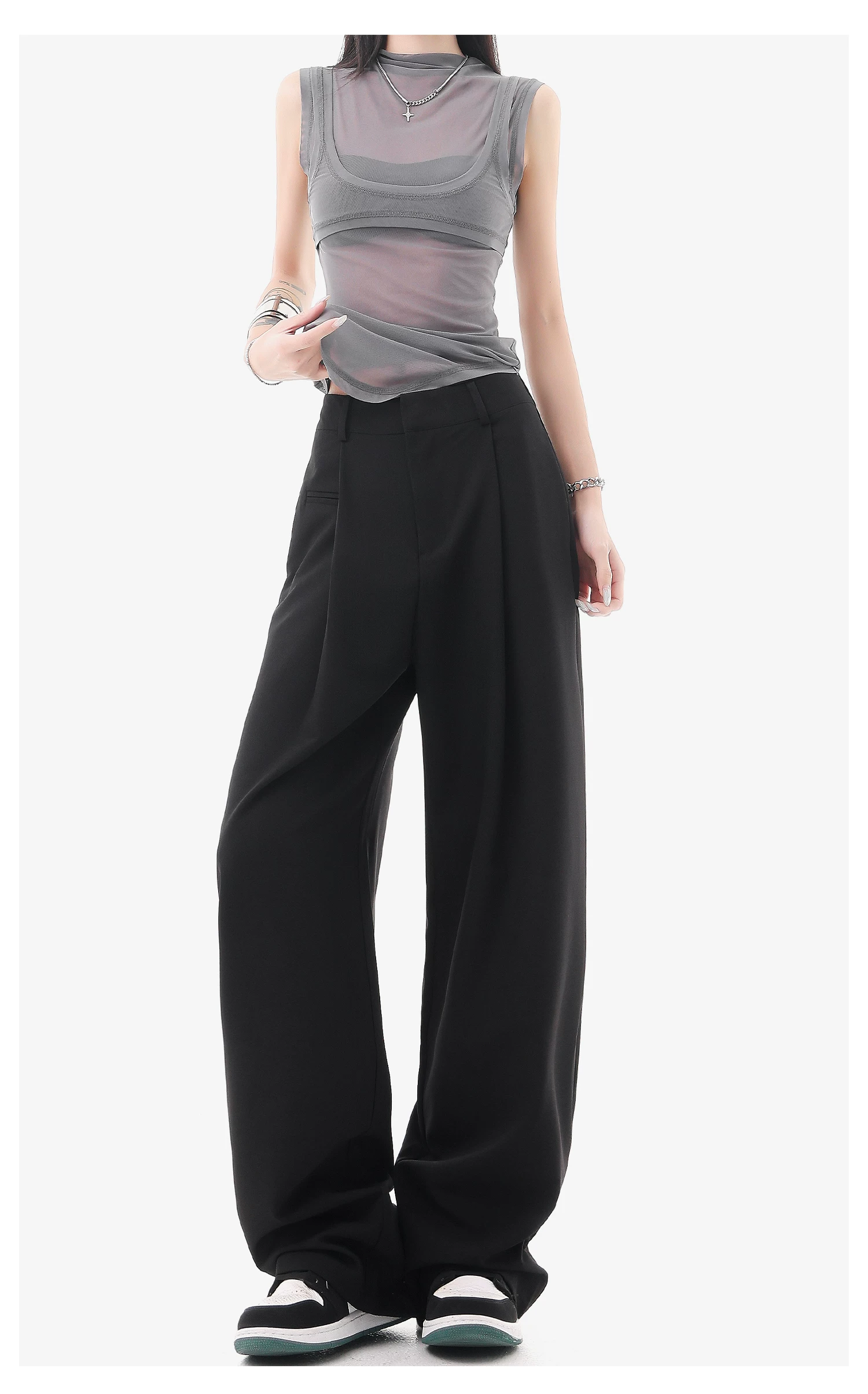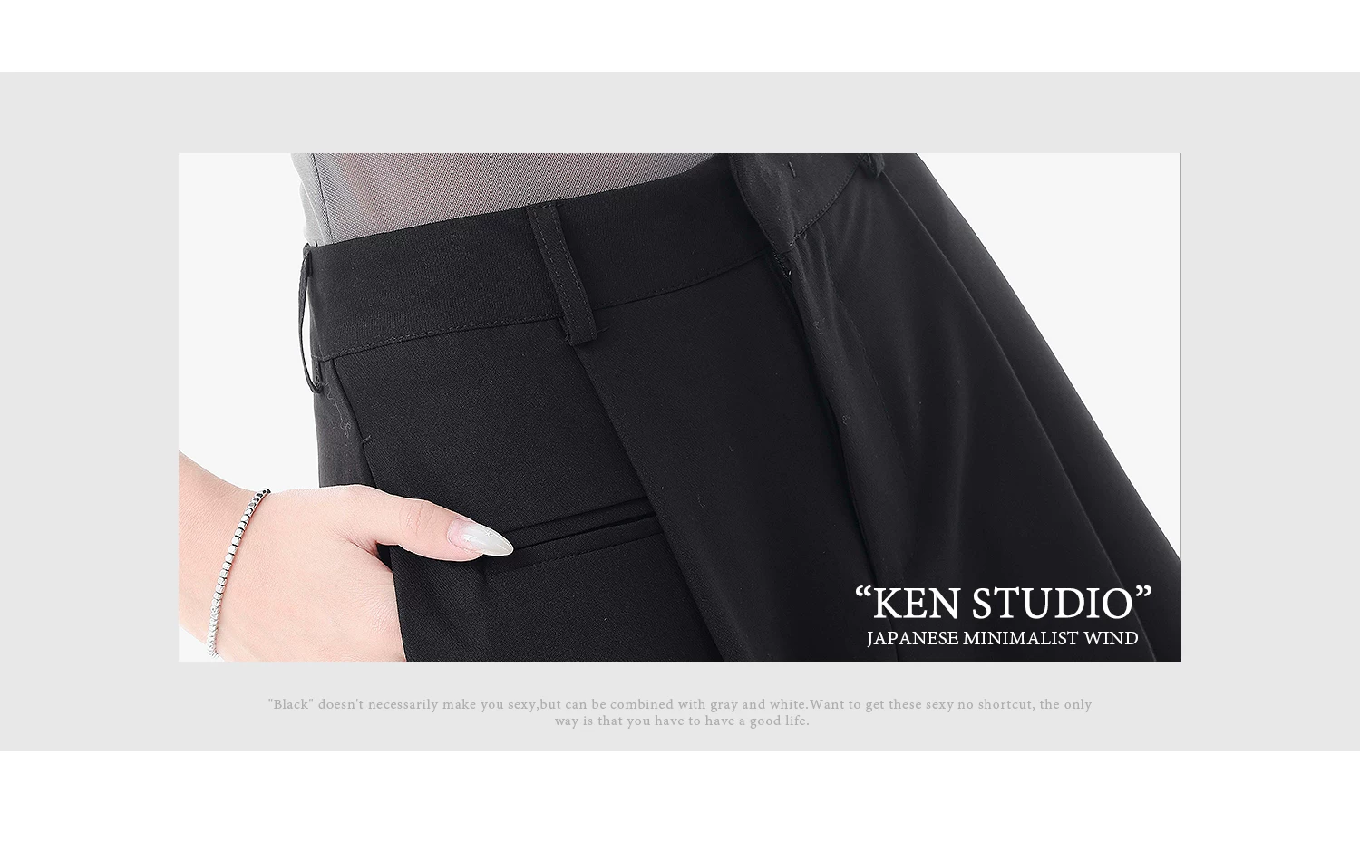 - KEN STUDIO quần vest đen mới mùa hè dành cho nữ với thiết kế xếp nếp, quần ống đứng thông thường, quần âu.