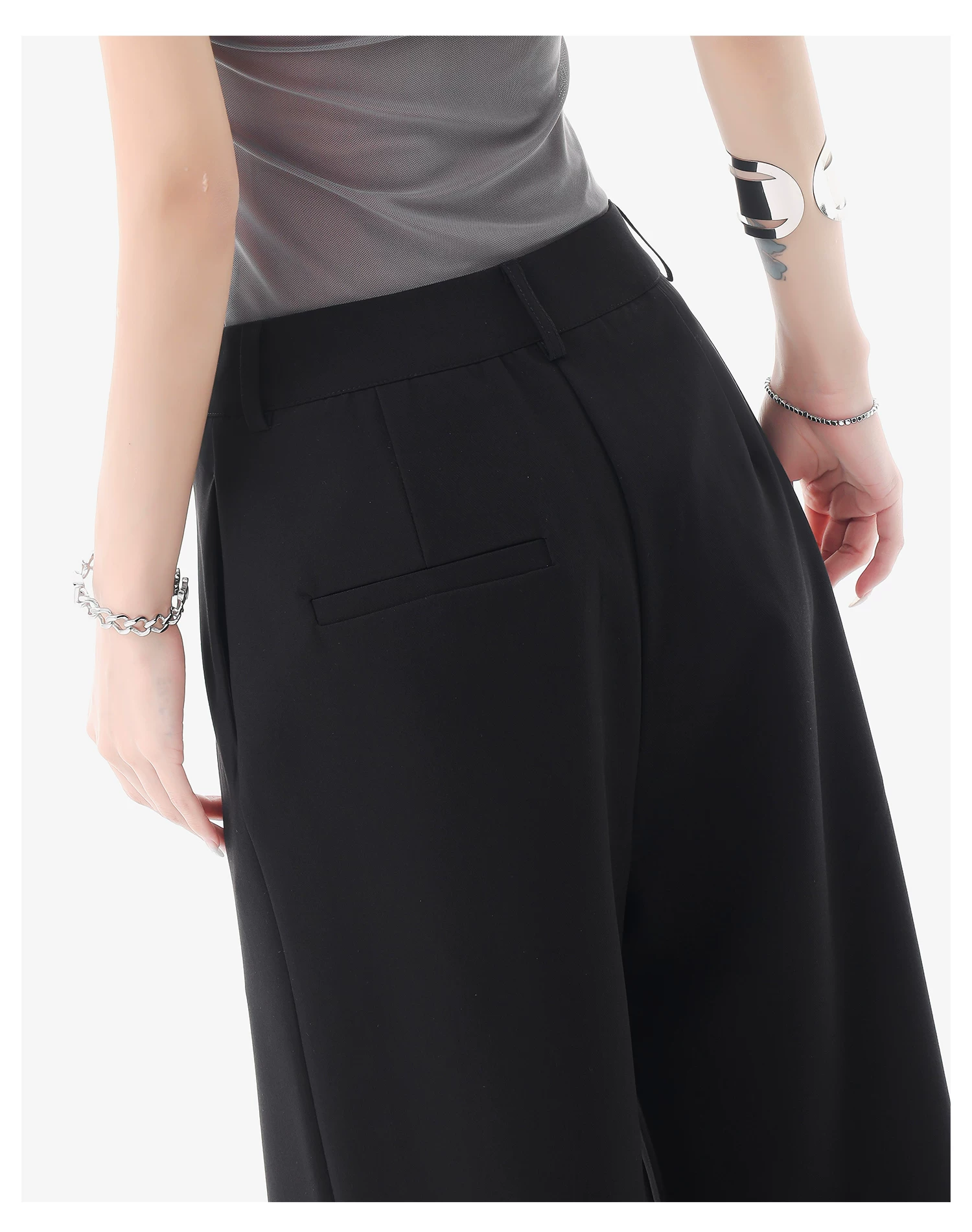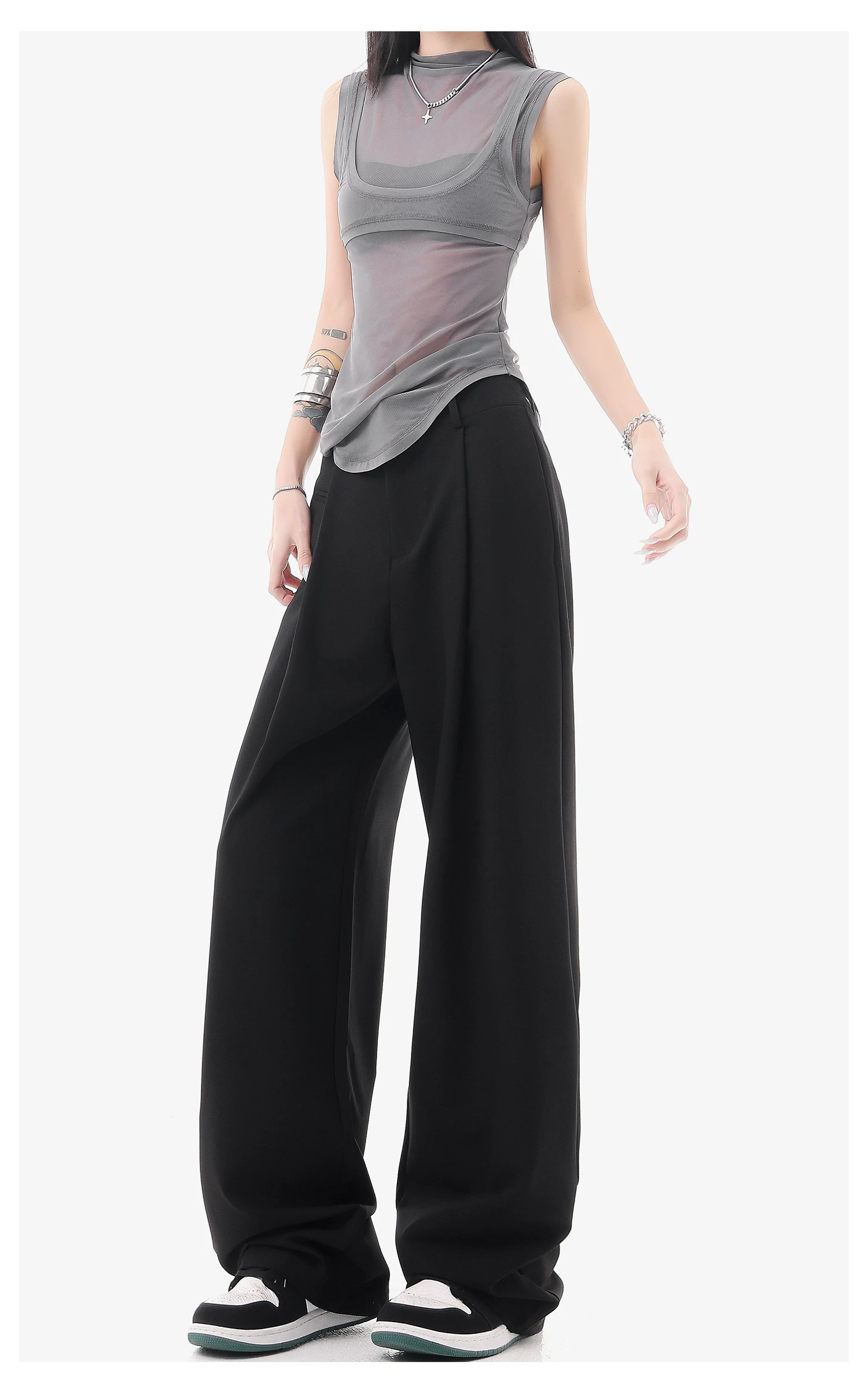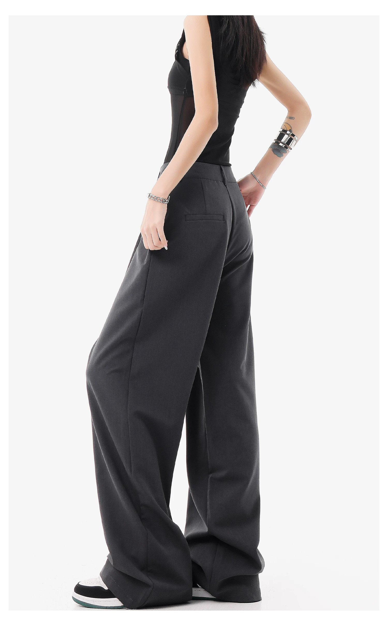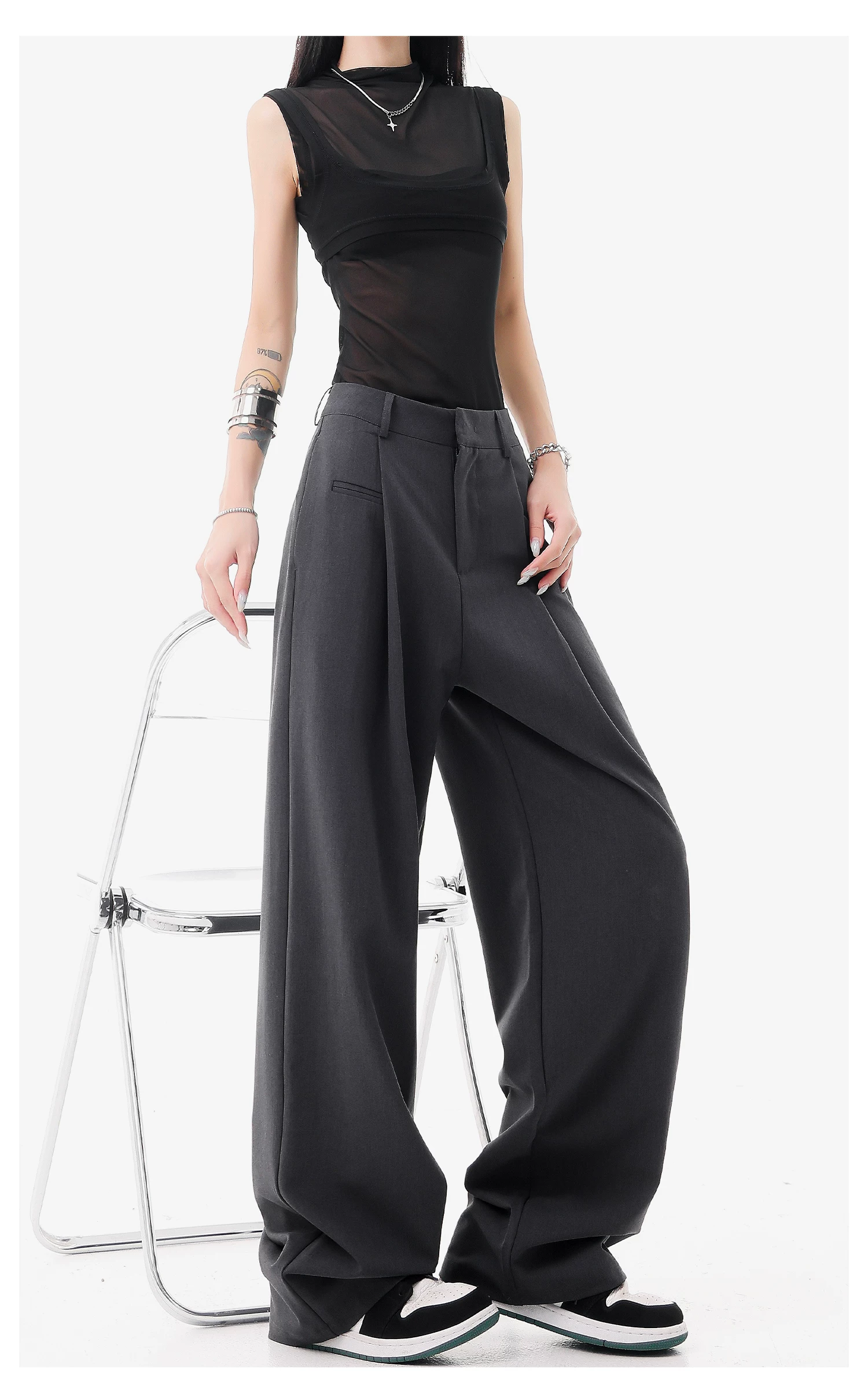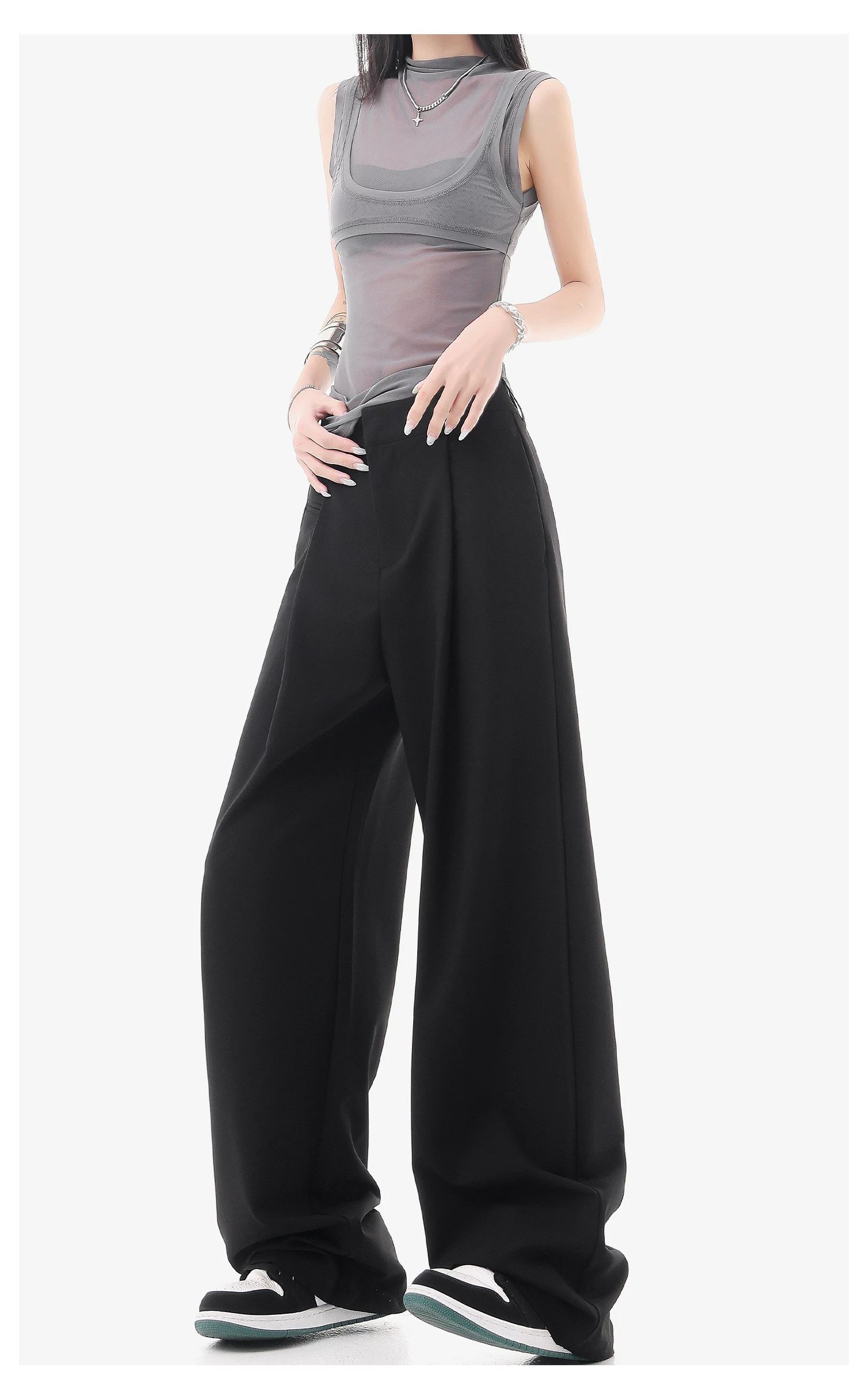 - KEN STUDIO quần vest đen mới mùa hè dành cho nữ với thiết kế xếp nếp, quần ống đứng thông thường, quần âu.