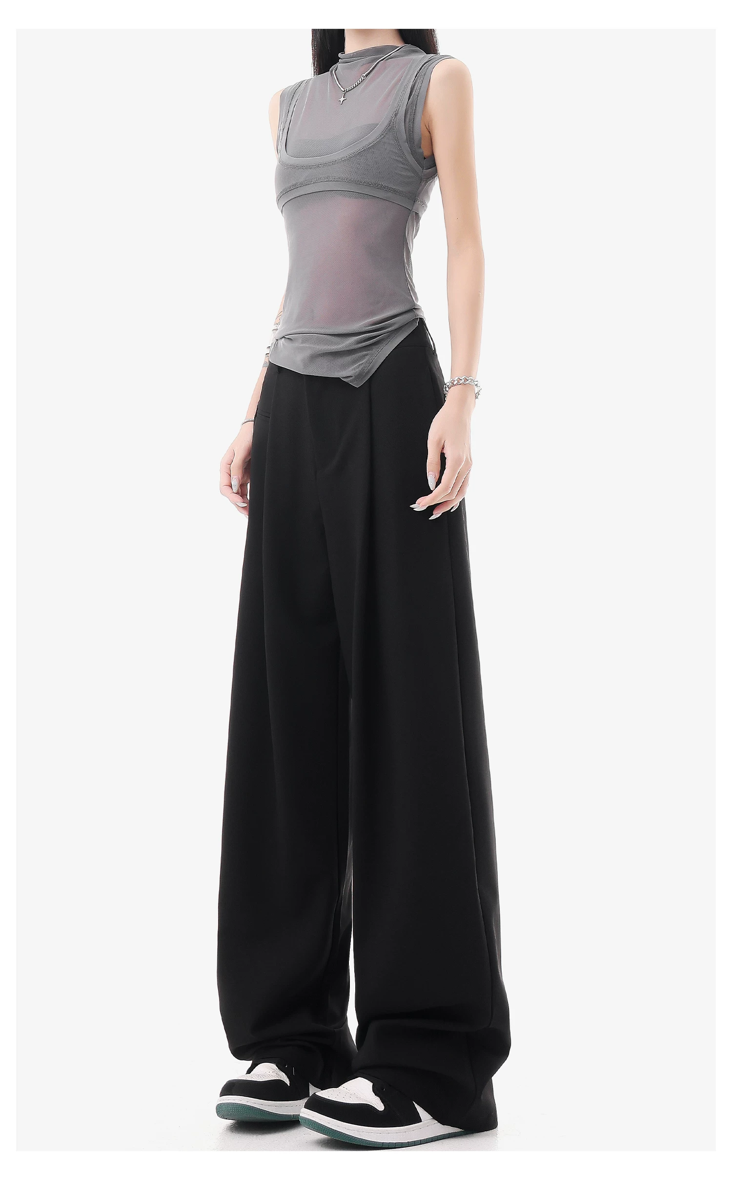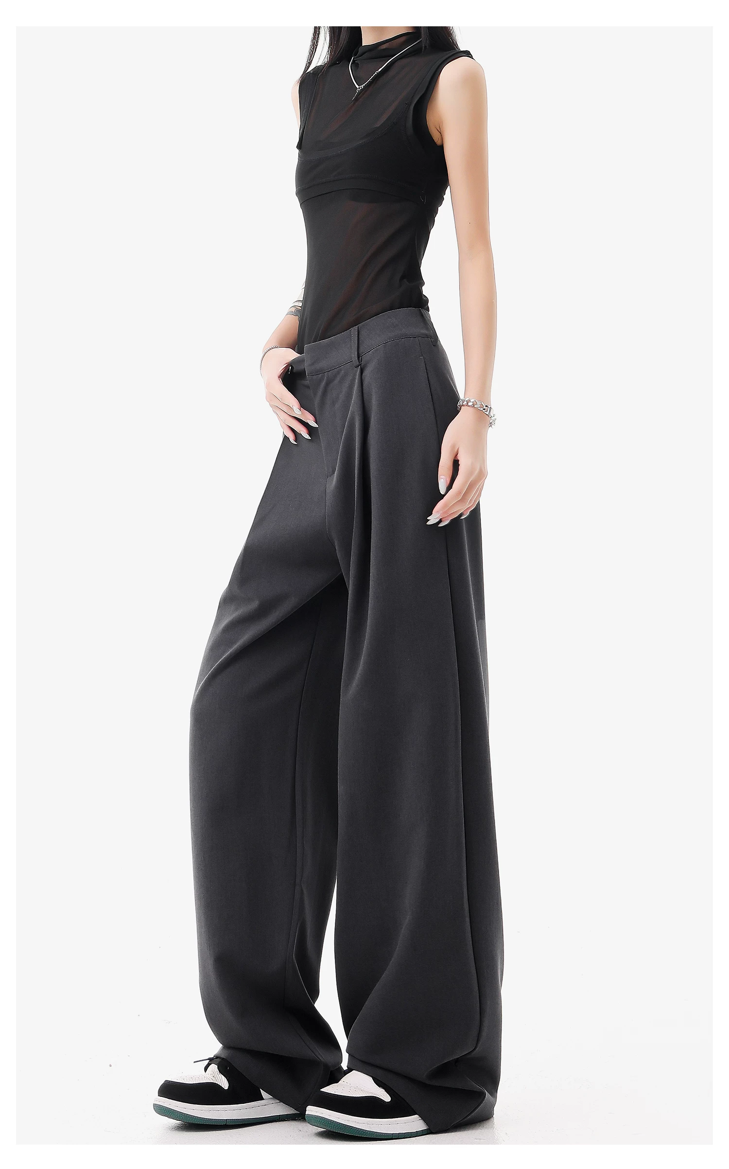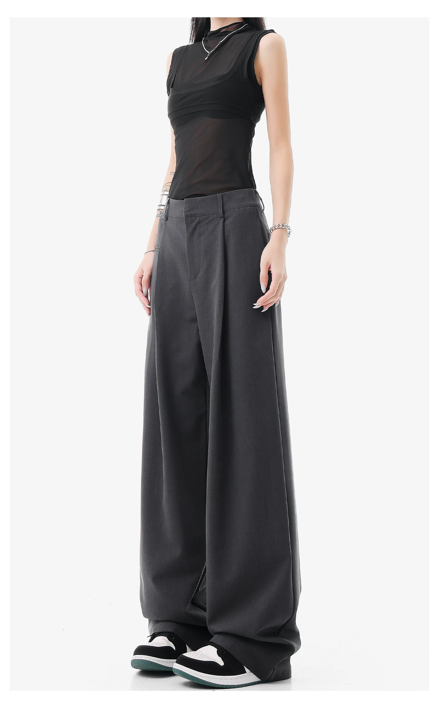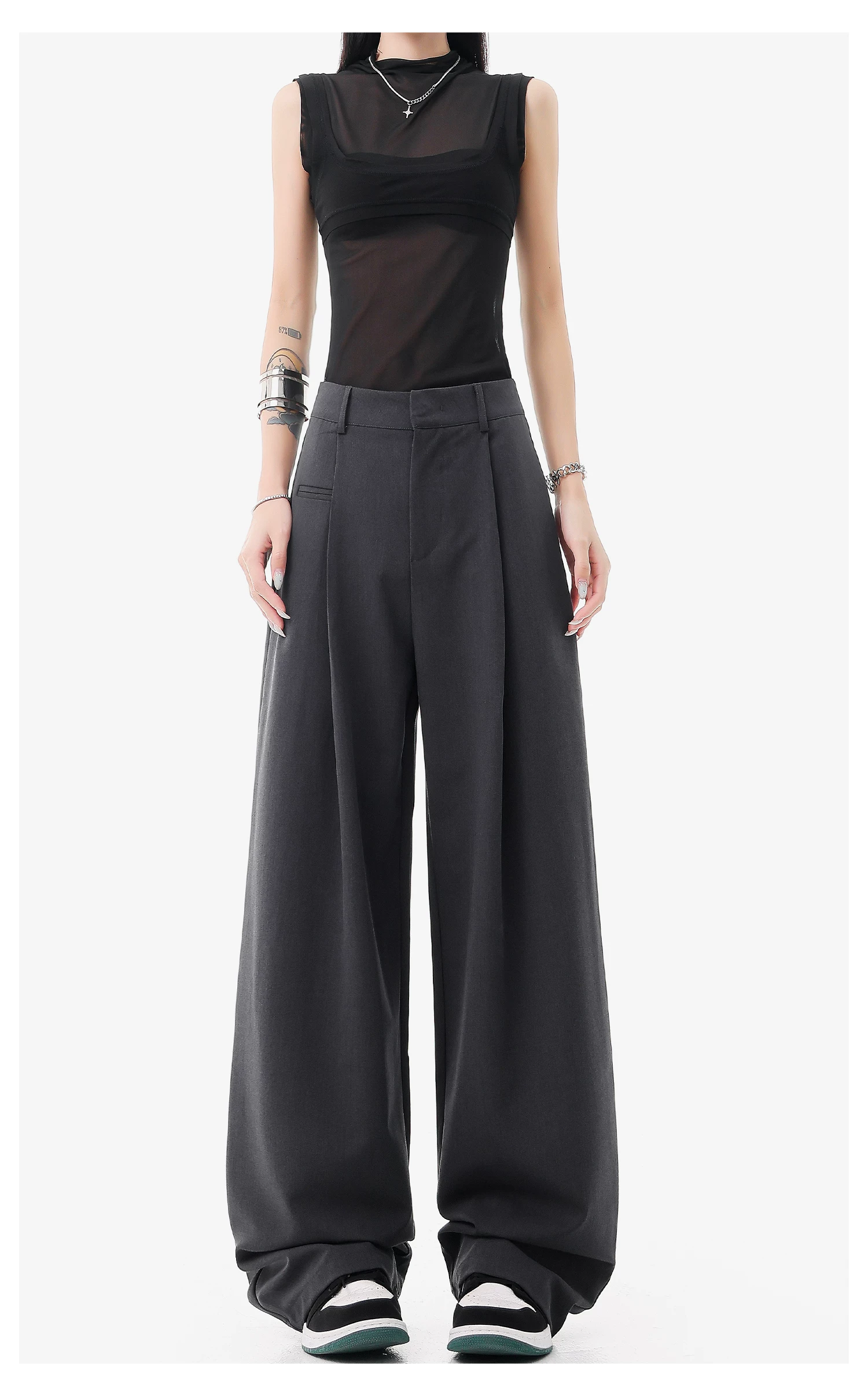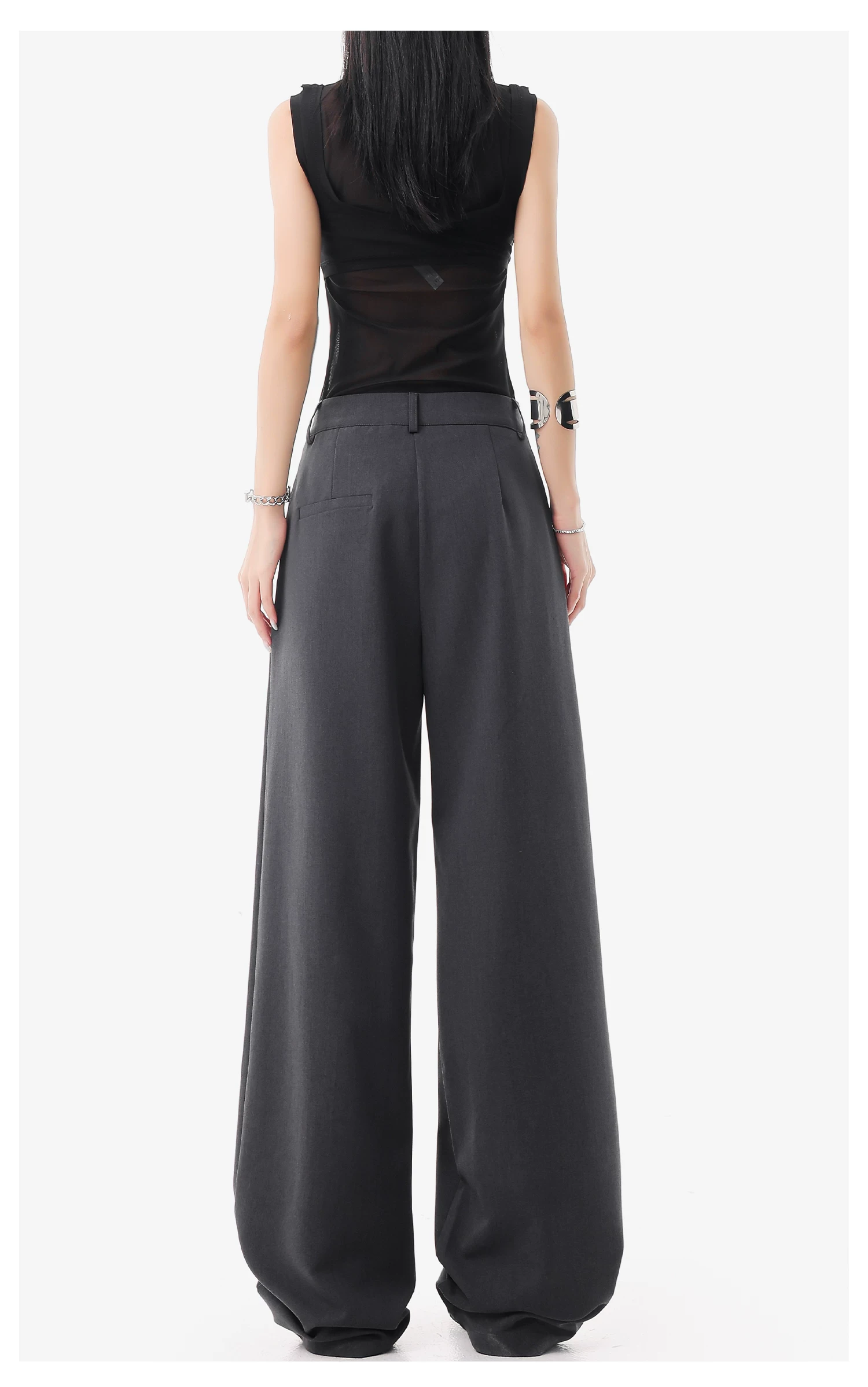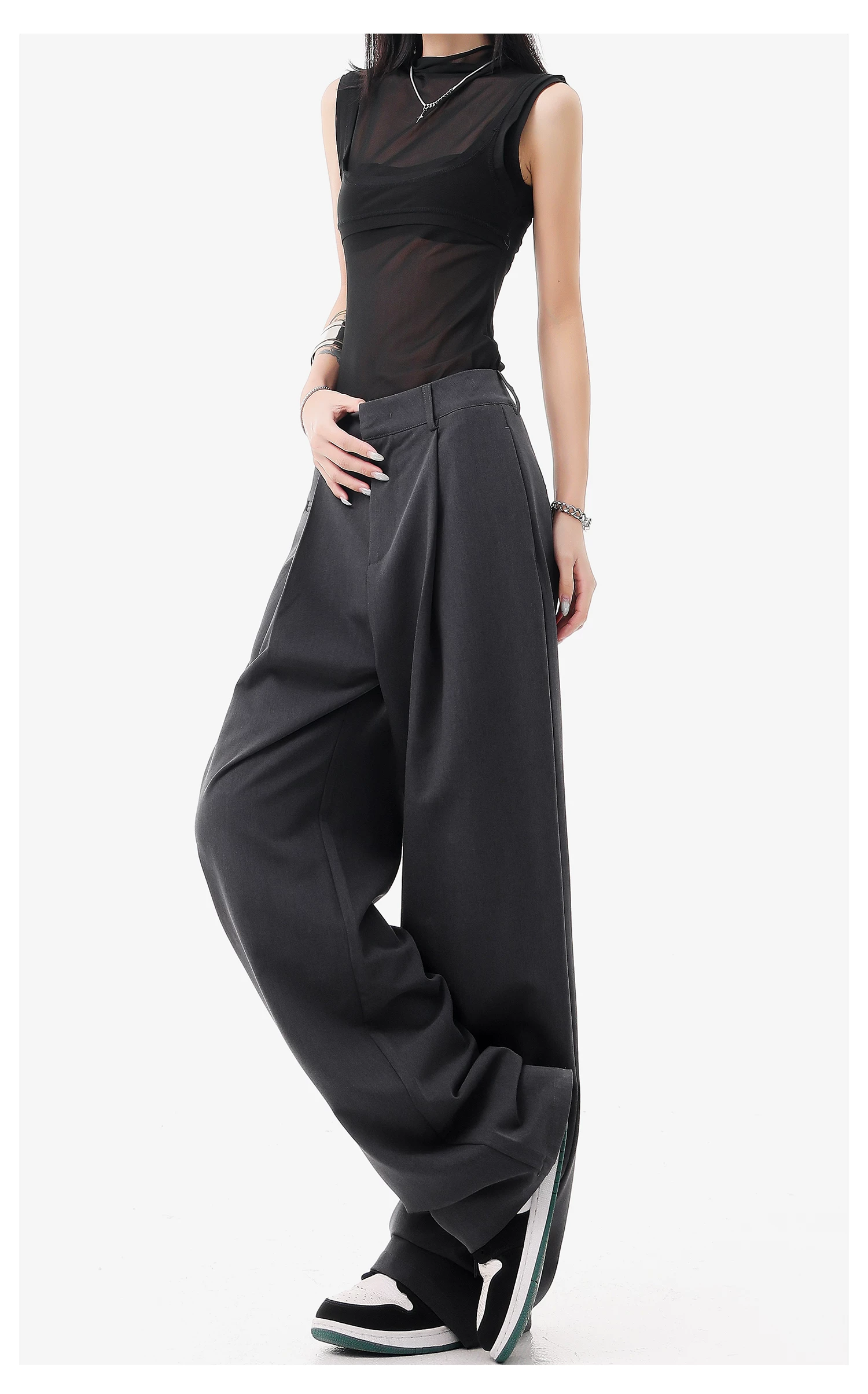 - KEN STUDIO quần vest đen mới mùa hè dành cho nữ với thiết kế xếp nếp, quần ống đứng thông thường, quần âu.