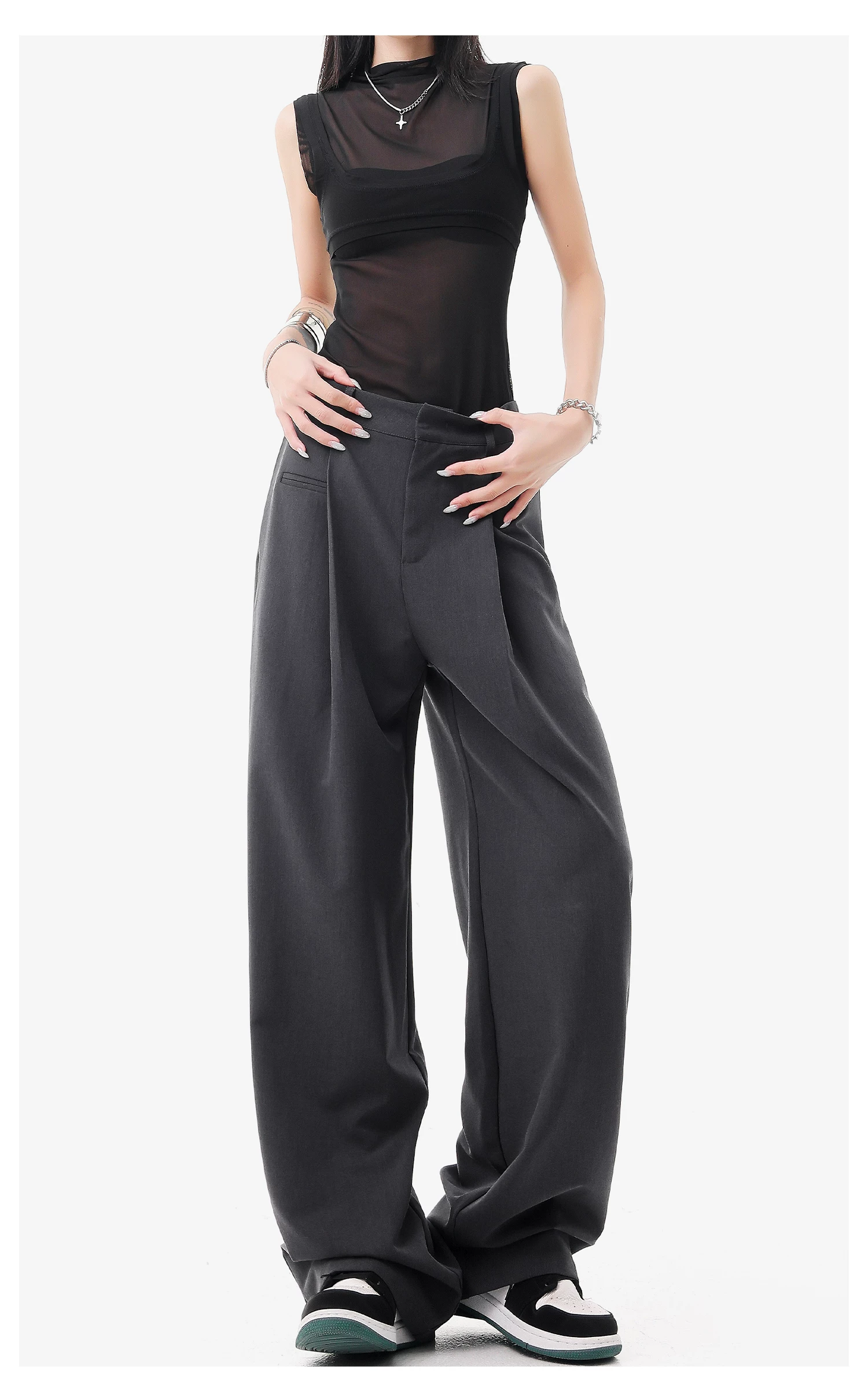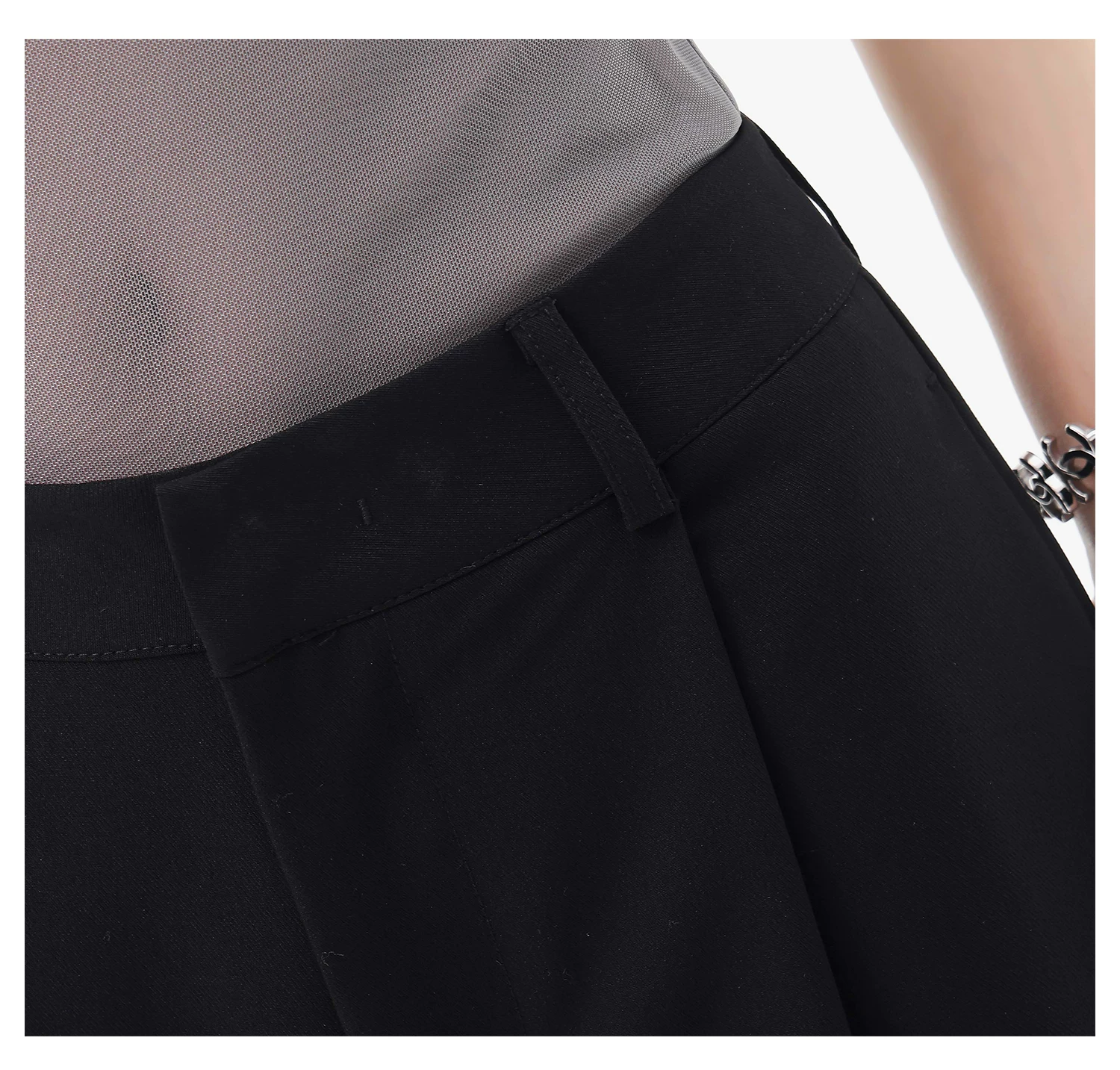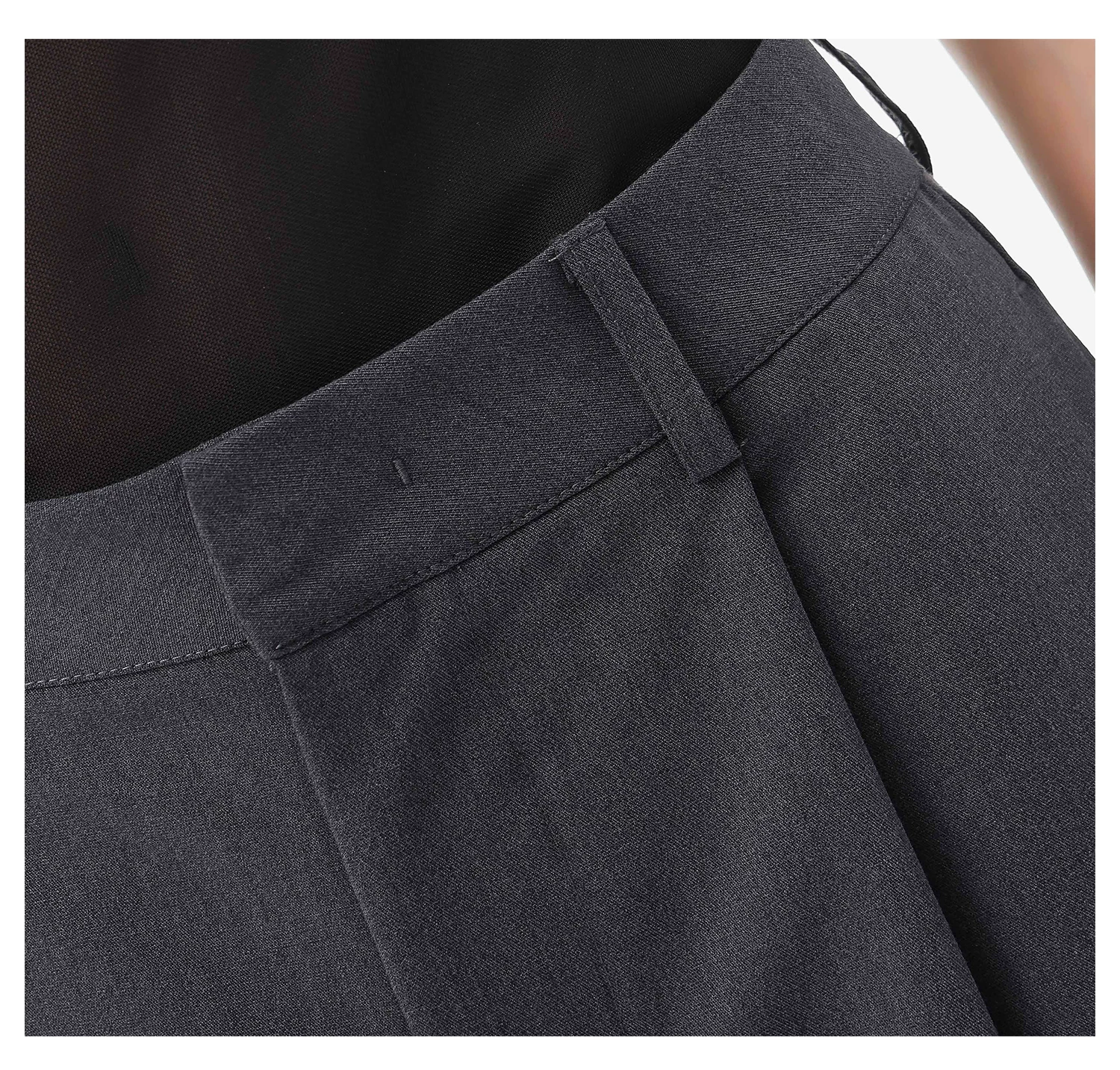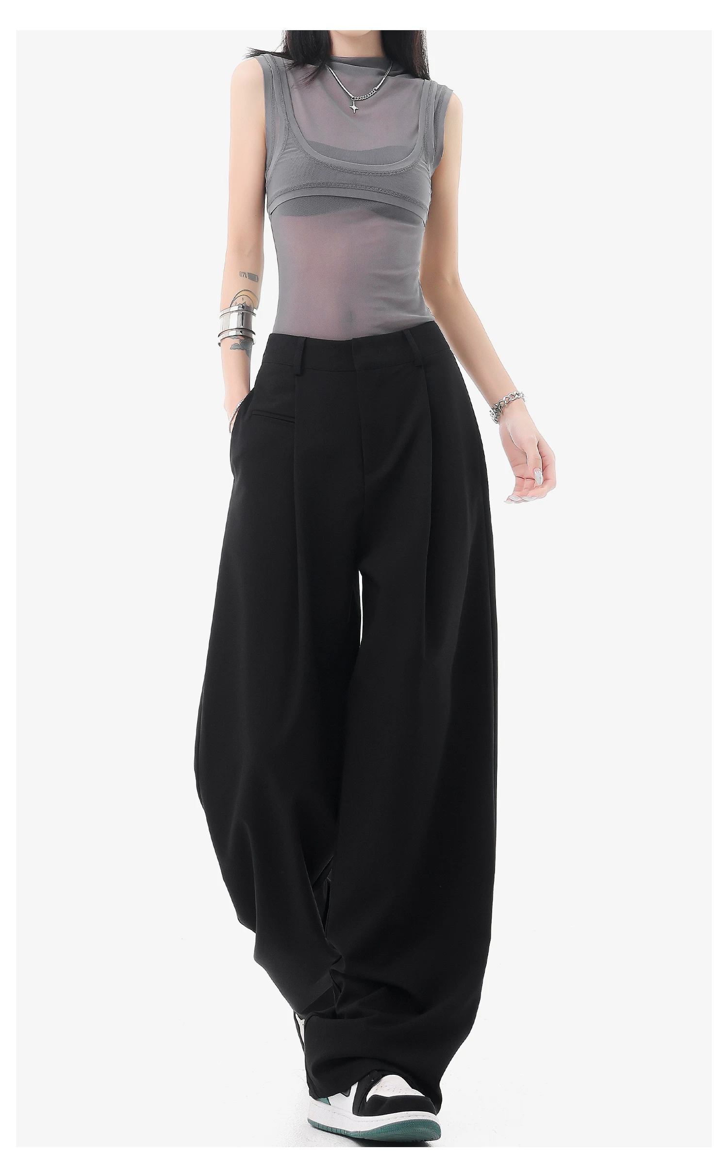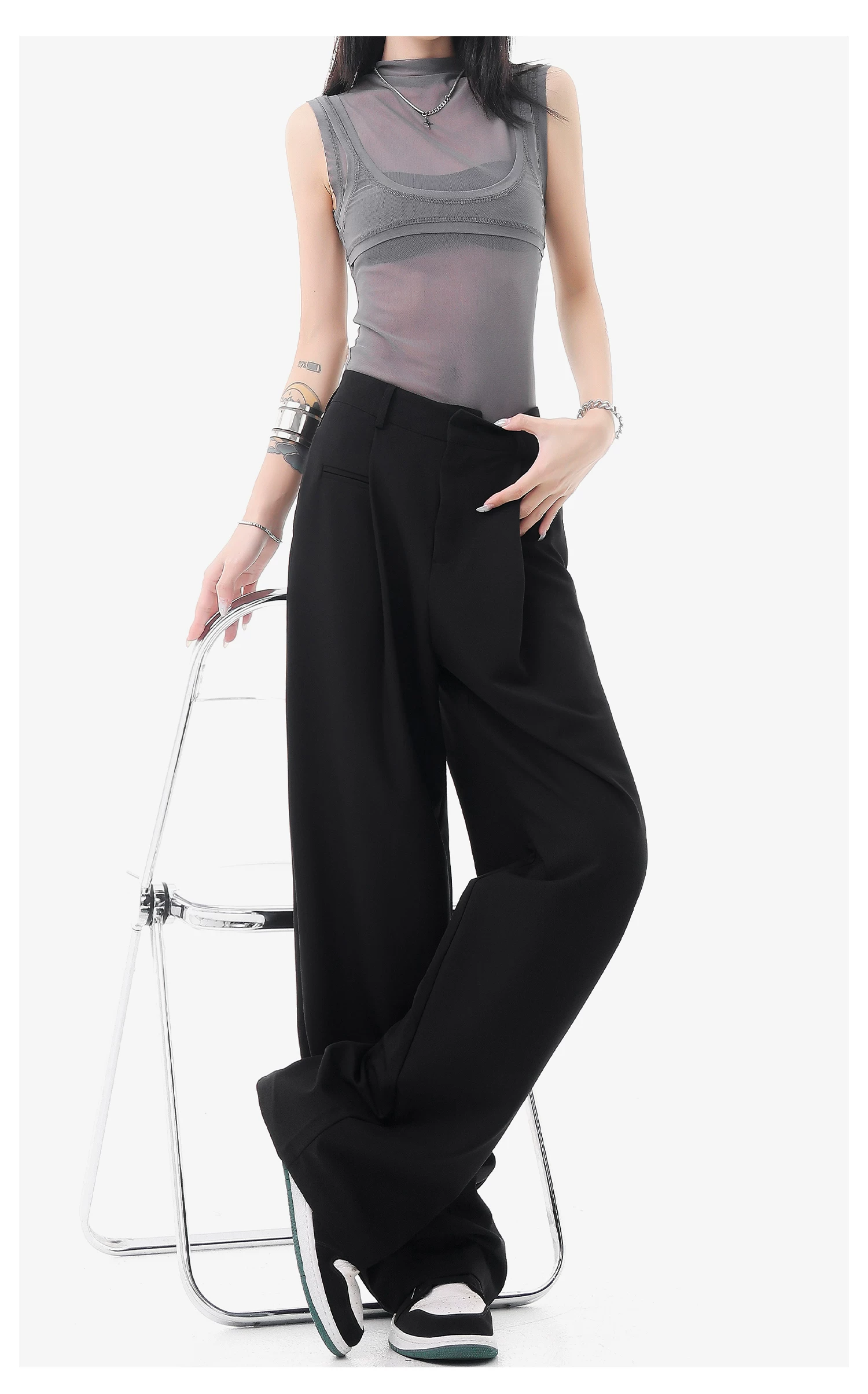 - KEN STUDIO quần vest đen mới mùa hè dành cho nữ với thiết kế xếp nếp, quần ống đứng thông thường, quần âu.