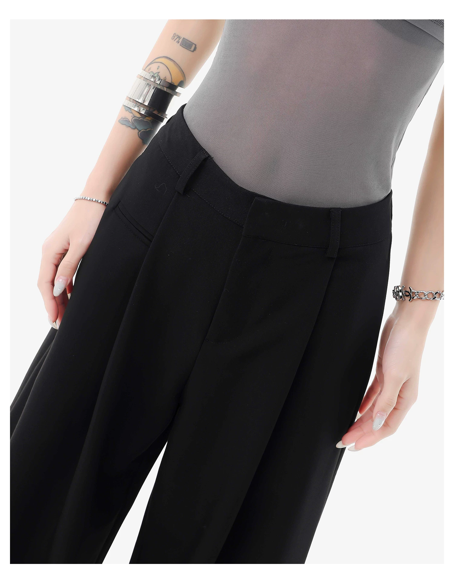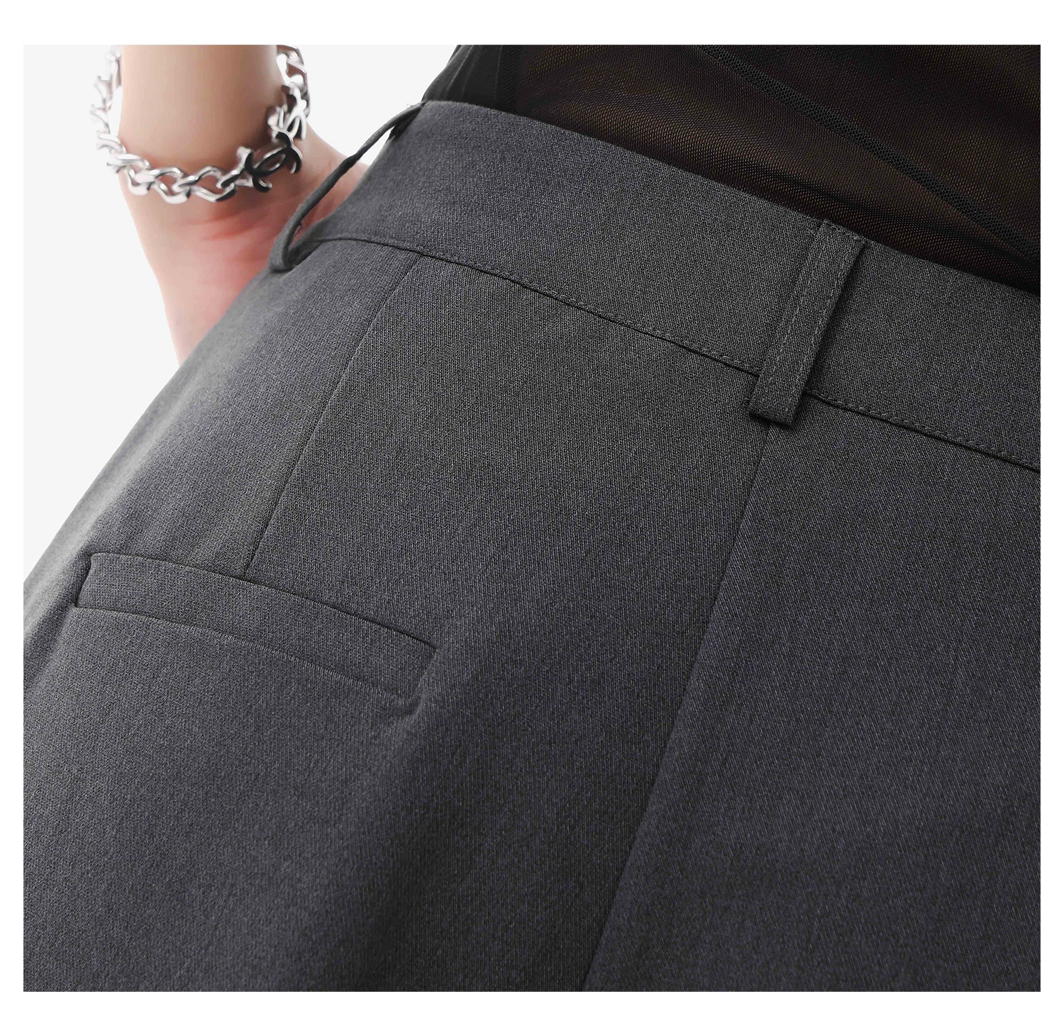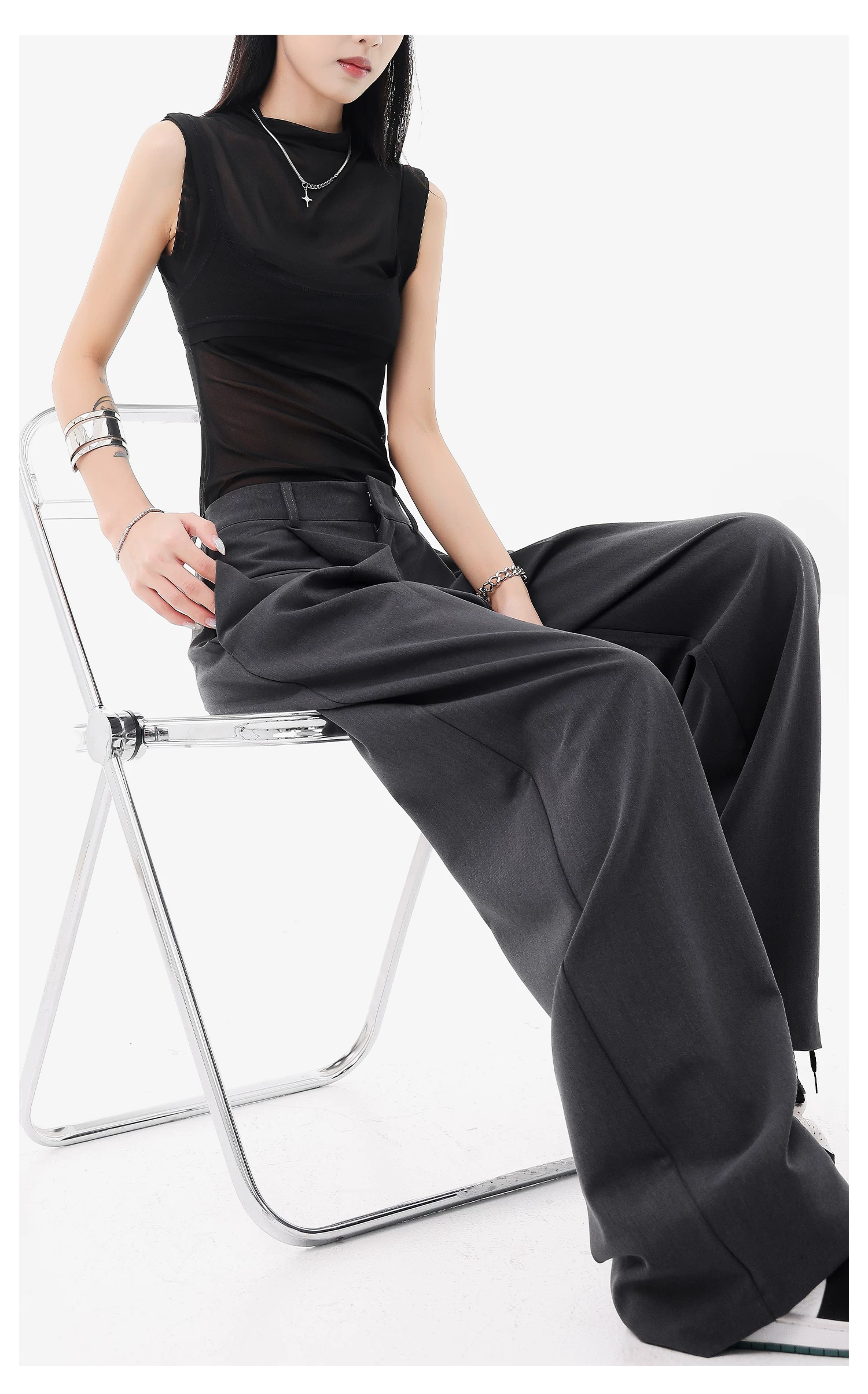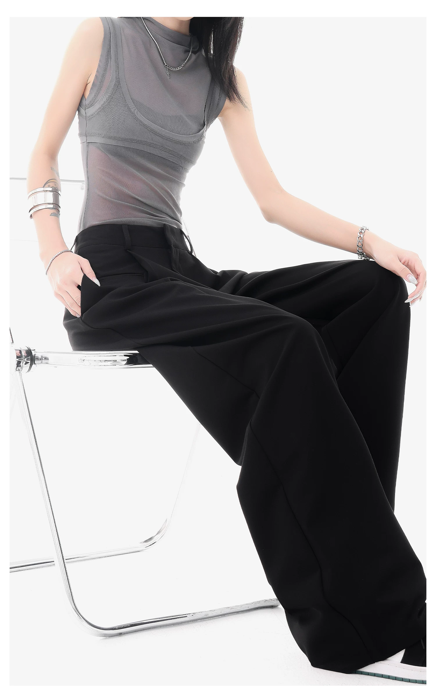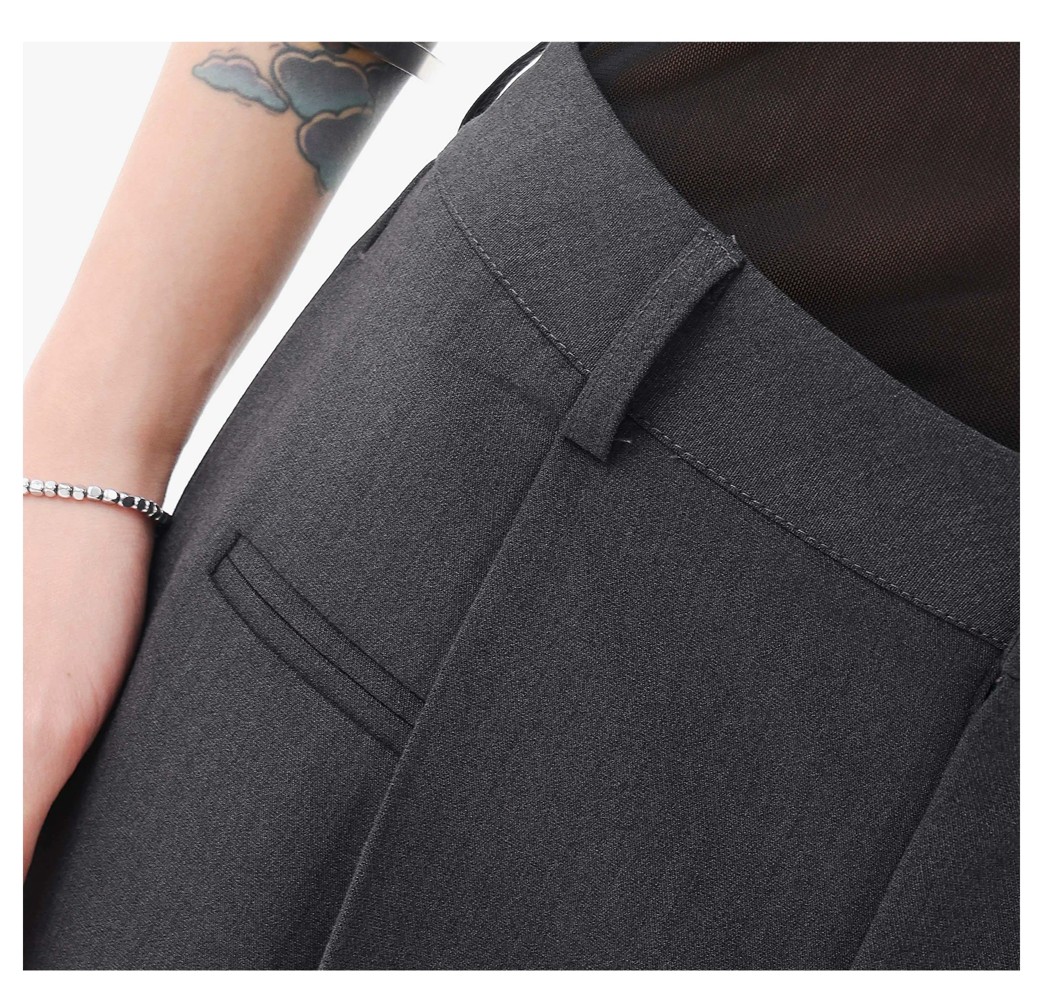 - KEN STUDIO quần vest đen mới mùa hè dành cho nữ với thiết kế xếp nếp, quần ống đứng thông thường, quần âu.