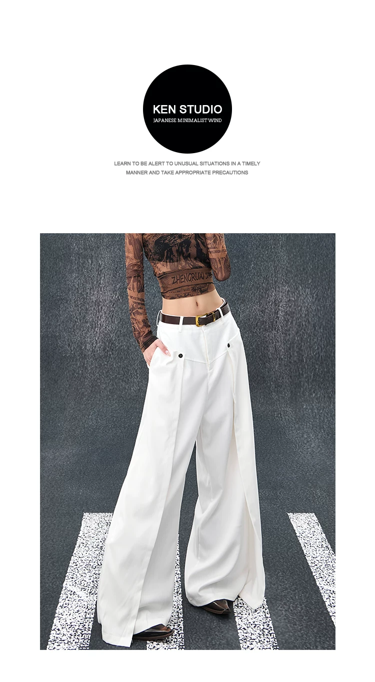 KEN STUDIO thiết kế mới mùa hè và mùa thu quần âu ống rộng màu trắng dành cho nữ, quần cạp cao, thon gọn, mềm mại, quần dài đến sàn