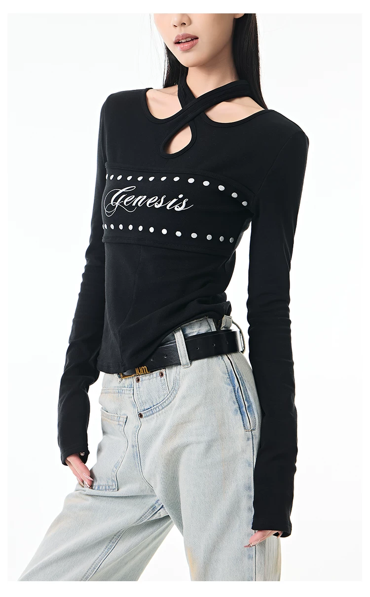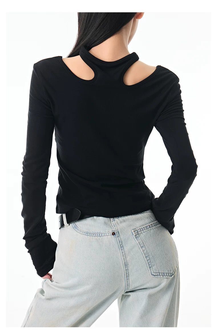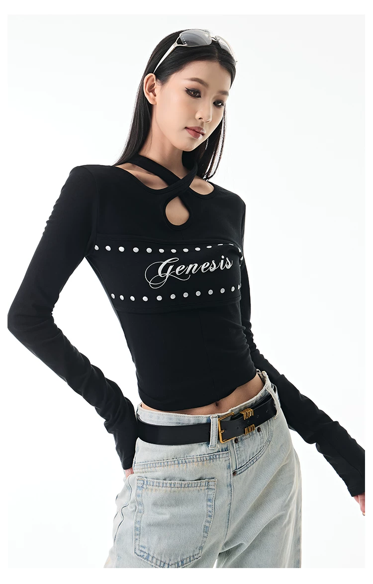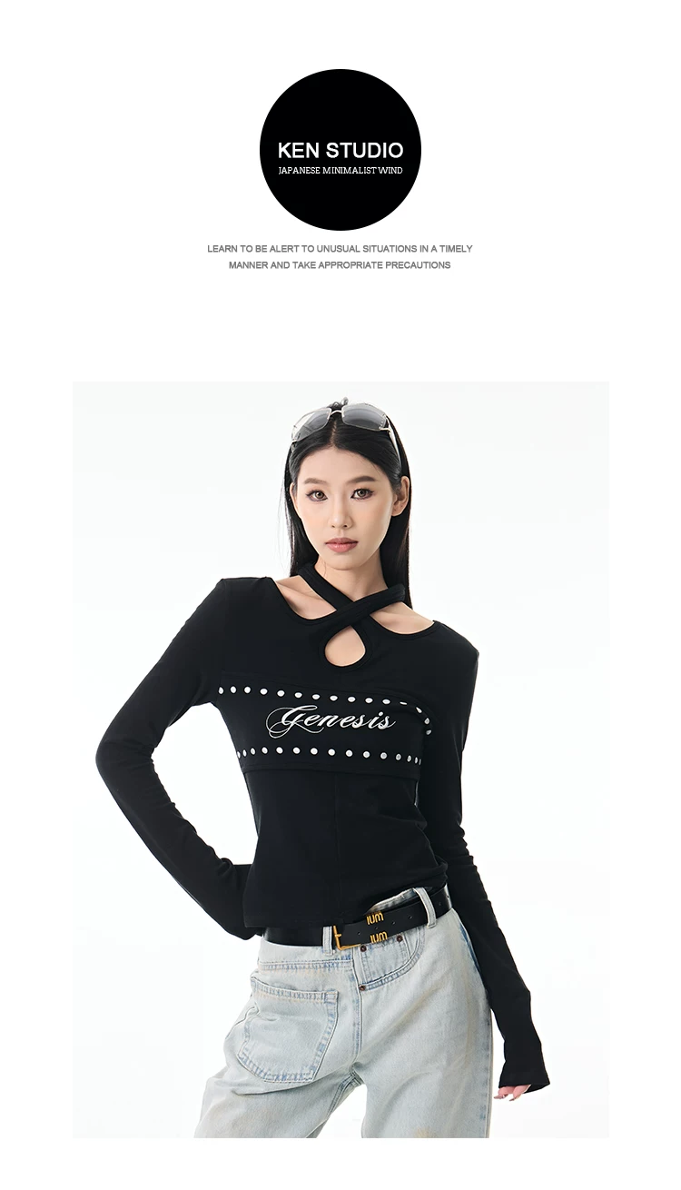 - KEN STUDIO Thu Đông Mới Hot Girl Phong Cách Đen Dây Cổ Áo Dài Tay Nữ Slim Fit Đế Áo Sơ Mi Hàng Đầu