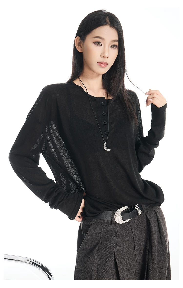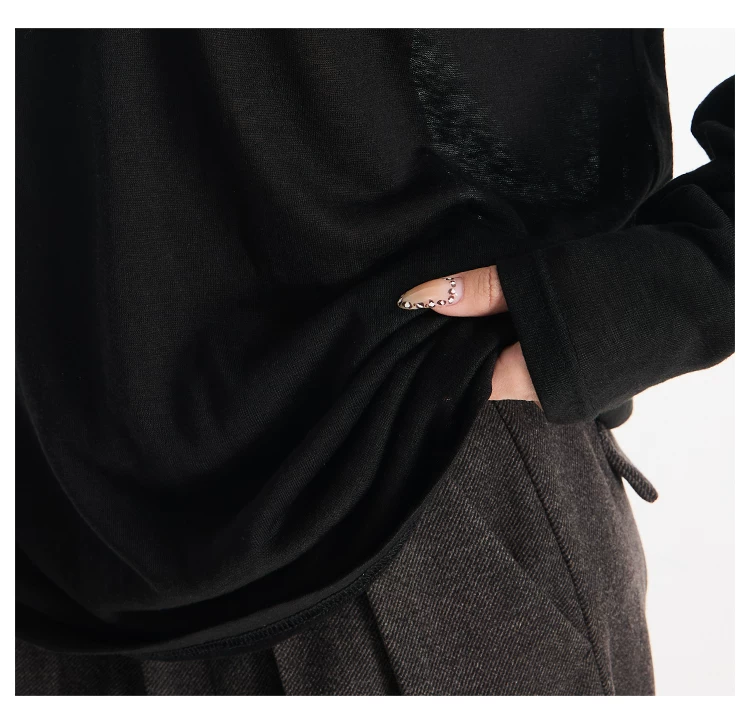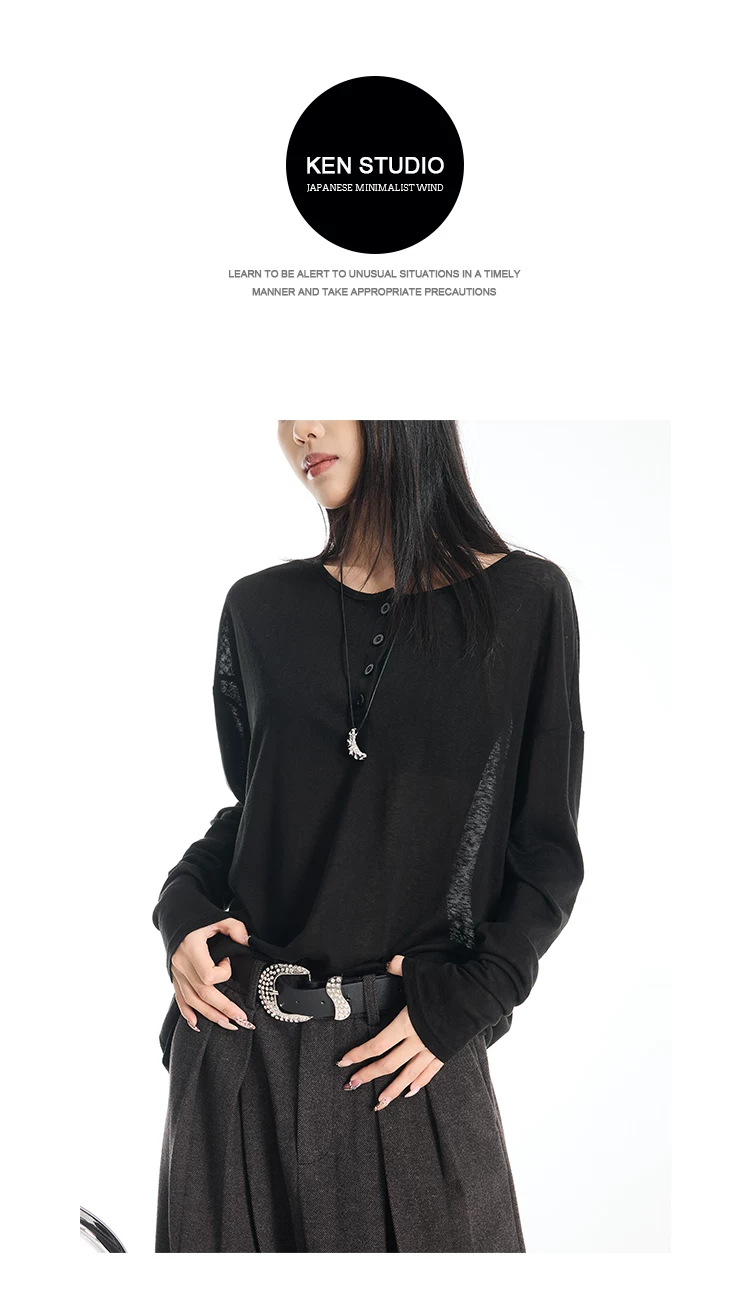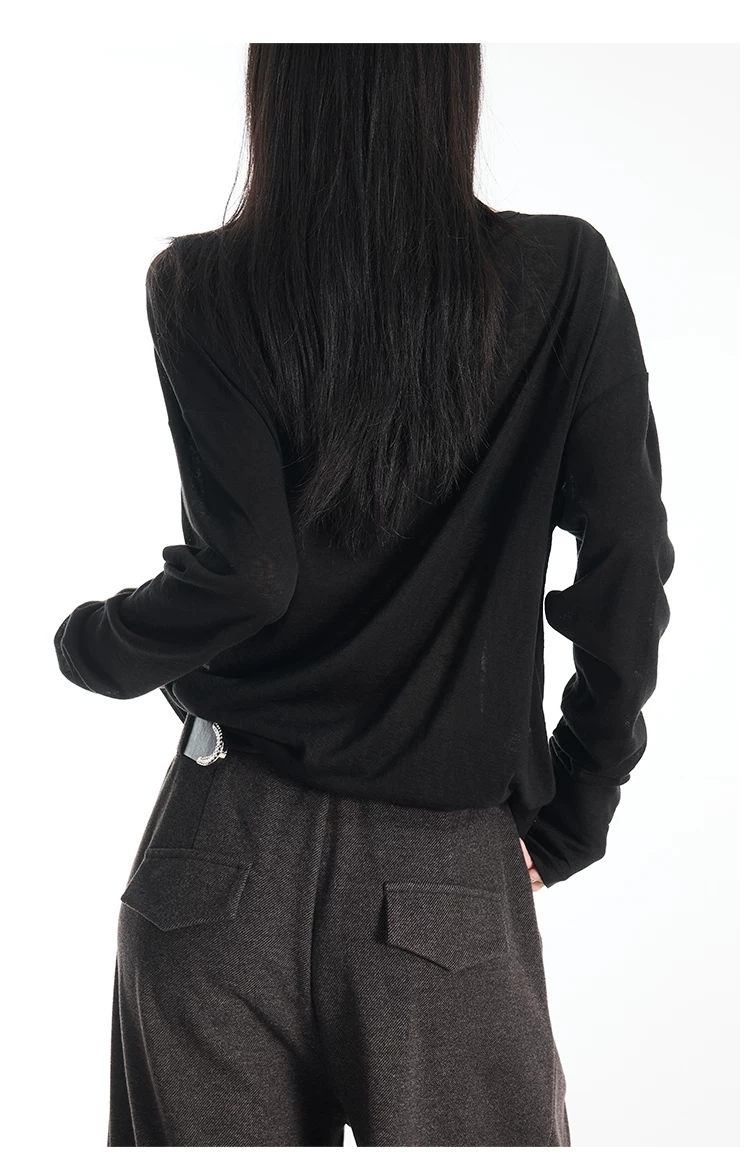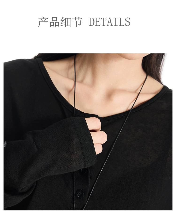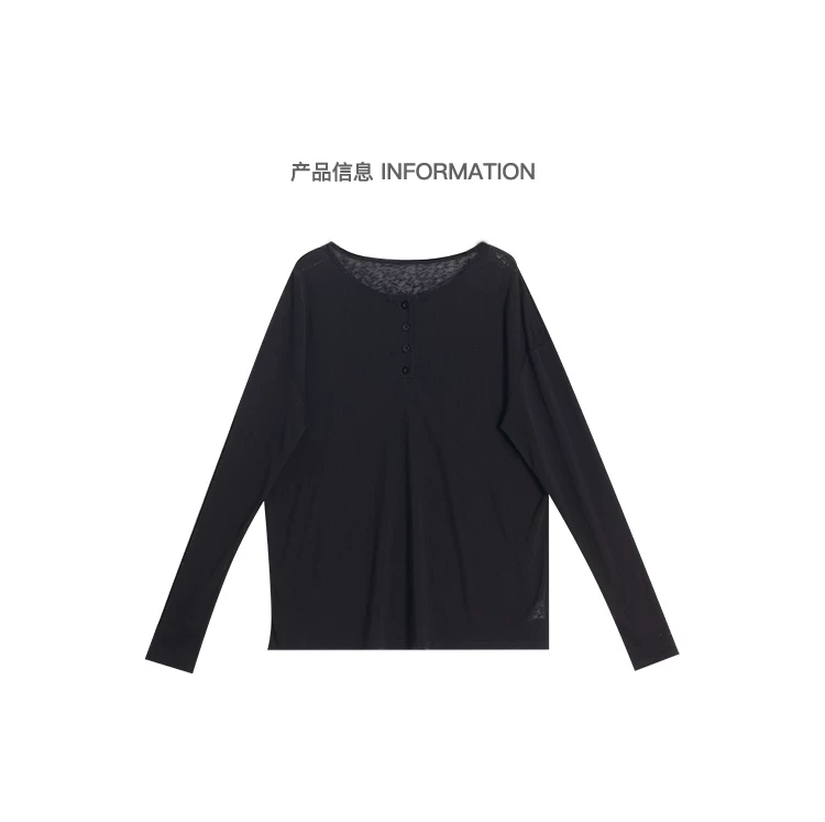 - KEN STUDIO Xuân Thu Mới Màu Đen Cổ Henry Áo thun dài tay hơi lộn trộn Áo thun nữ dáng ôm vừa vặn Áo sơ mi cơ bản
