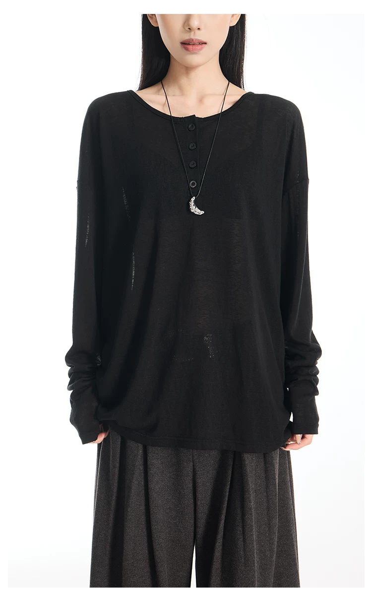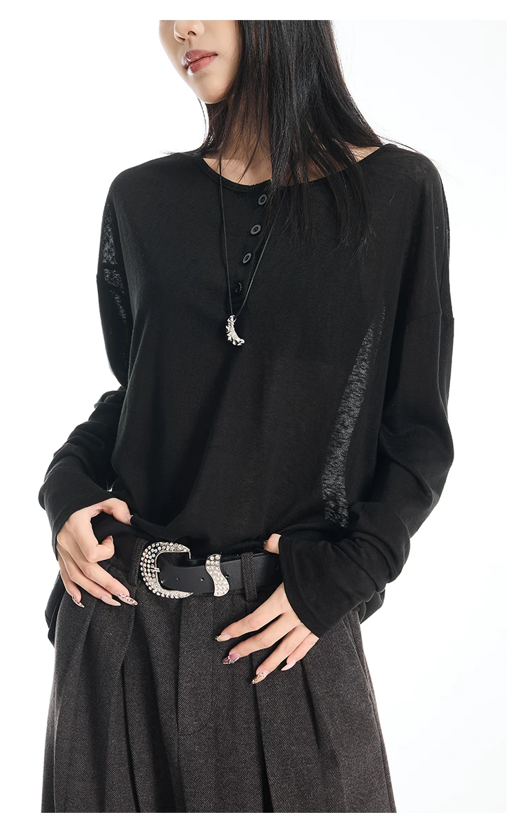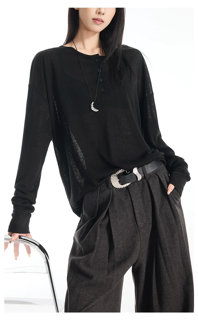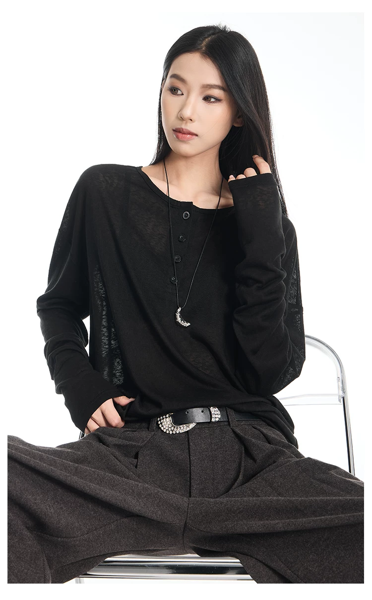 - KEN STUDIO Xuân Thu Mới Màu Đen Cổ Henry Áo thun dài tay hơi lộn trộn Áo thun nữ dáng ôm vừa vặn Áo sơ mi cơ bản