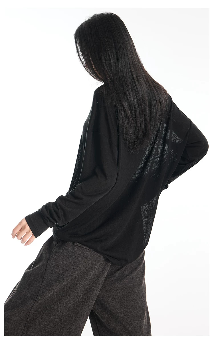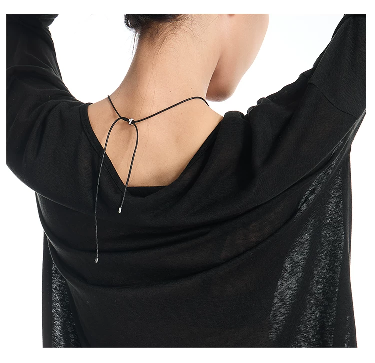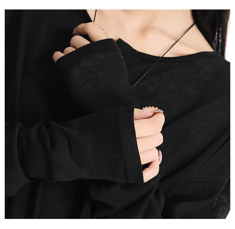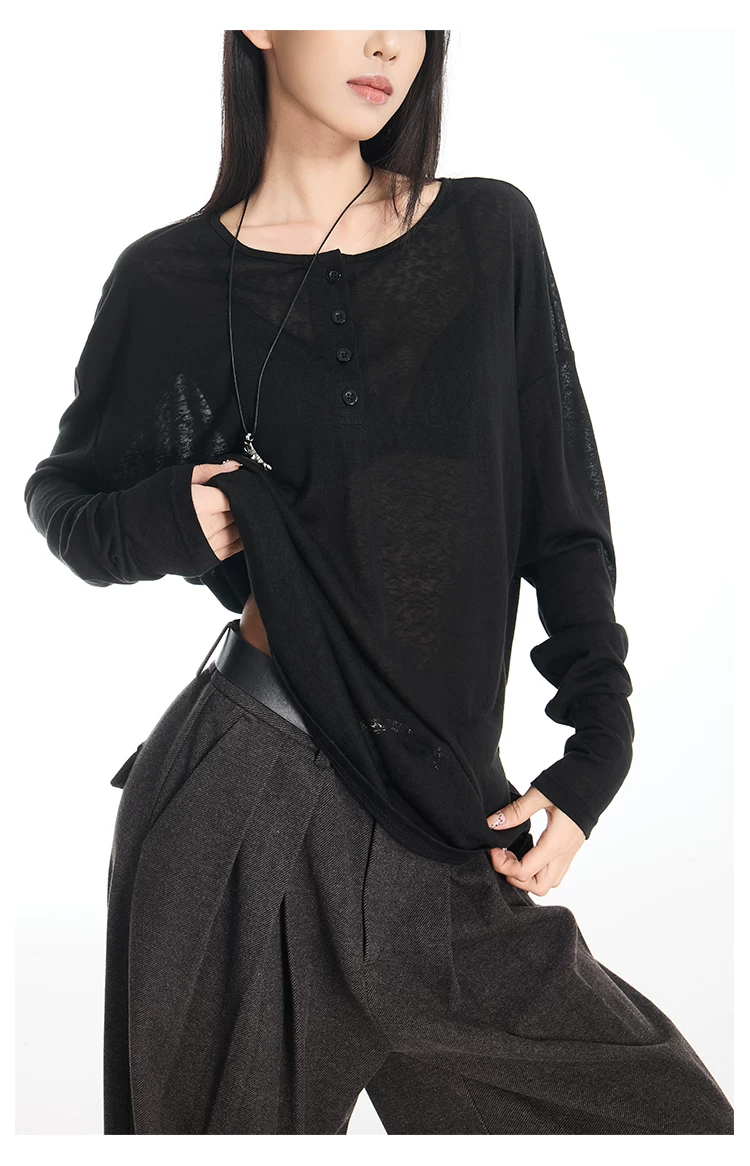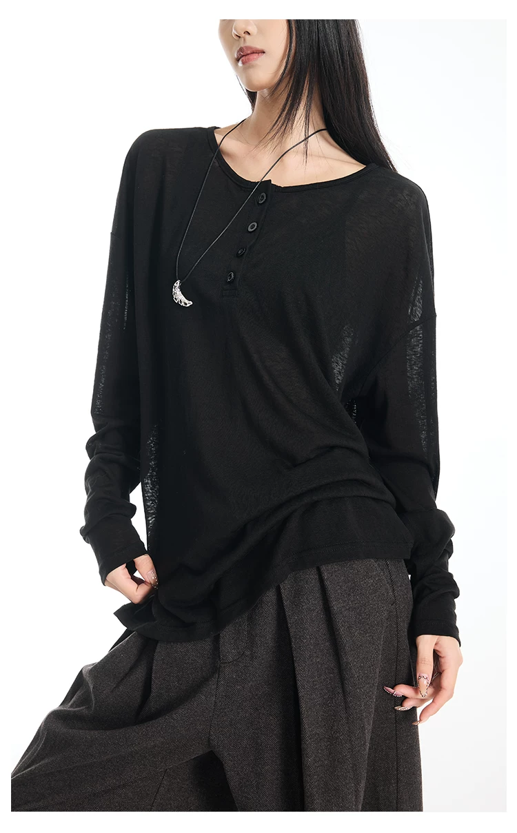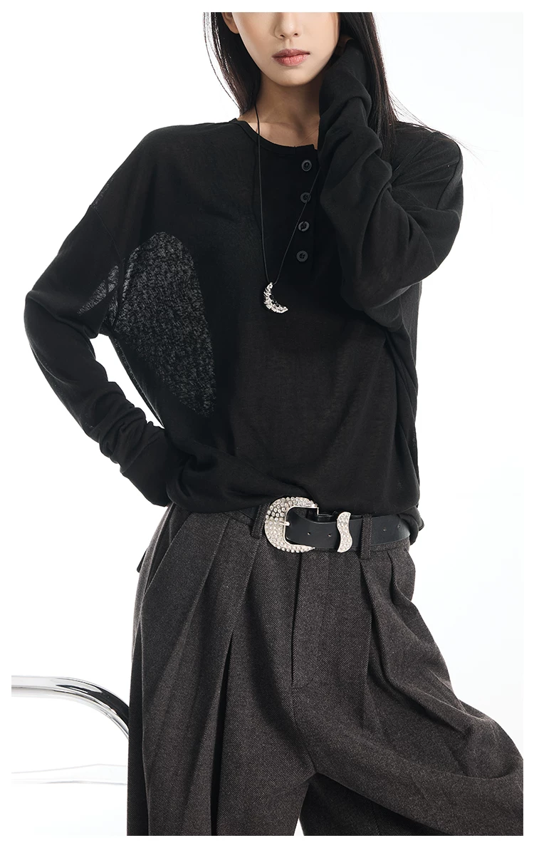 - KEN STUDIO Xuân Thu Mới Màu Đen Cổ Henry Áo thun dài tay hơi lộn trộn Áo thun nữ dáng ôm vừa vặn Áo sơ mi cơ bản