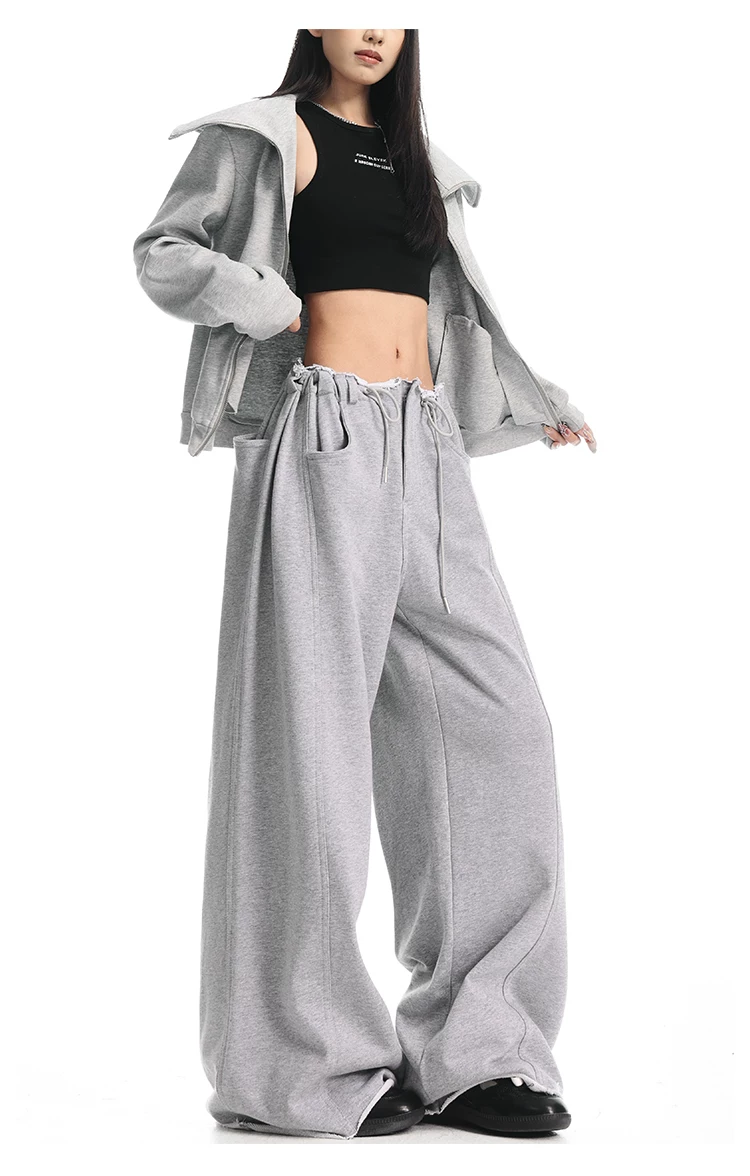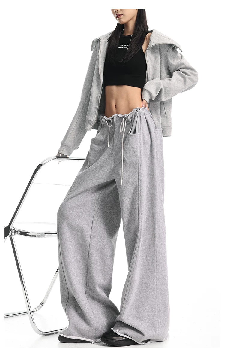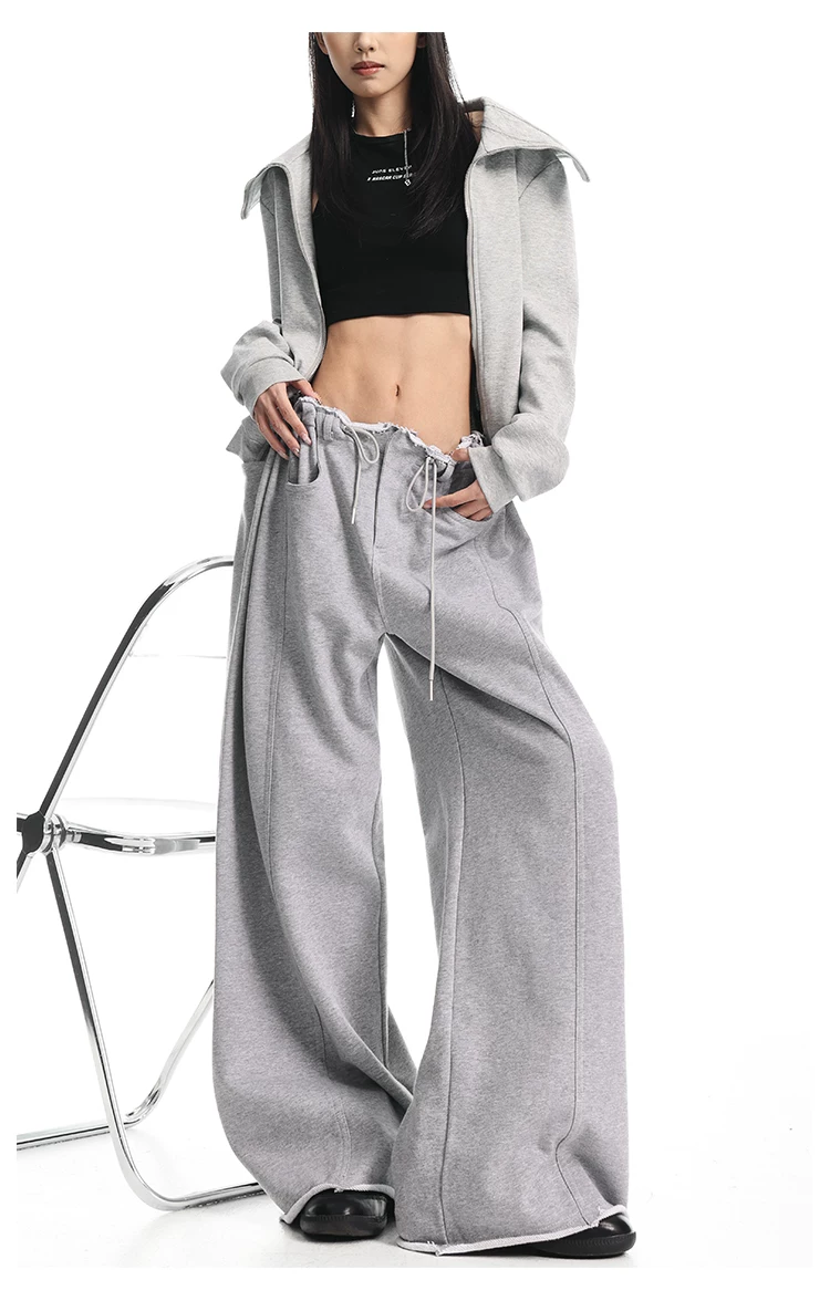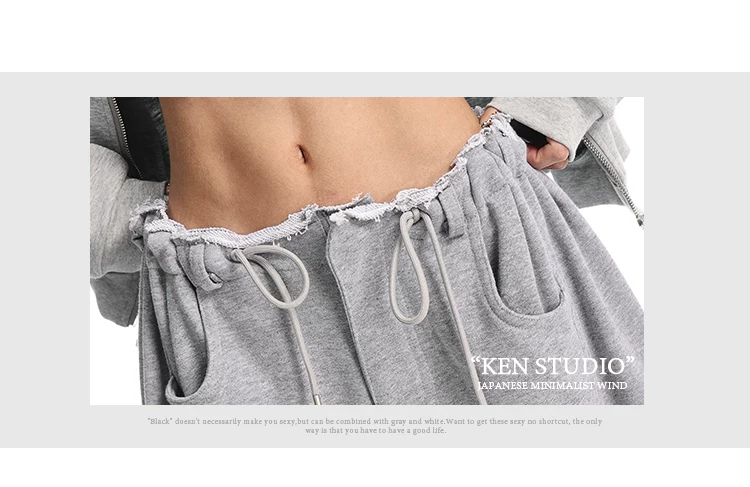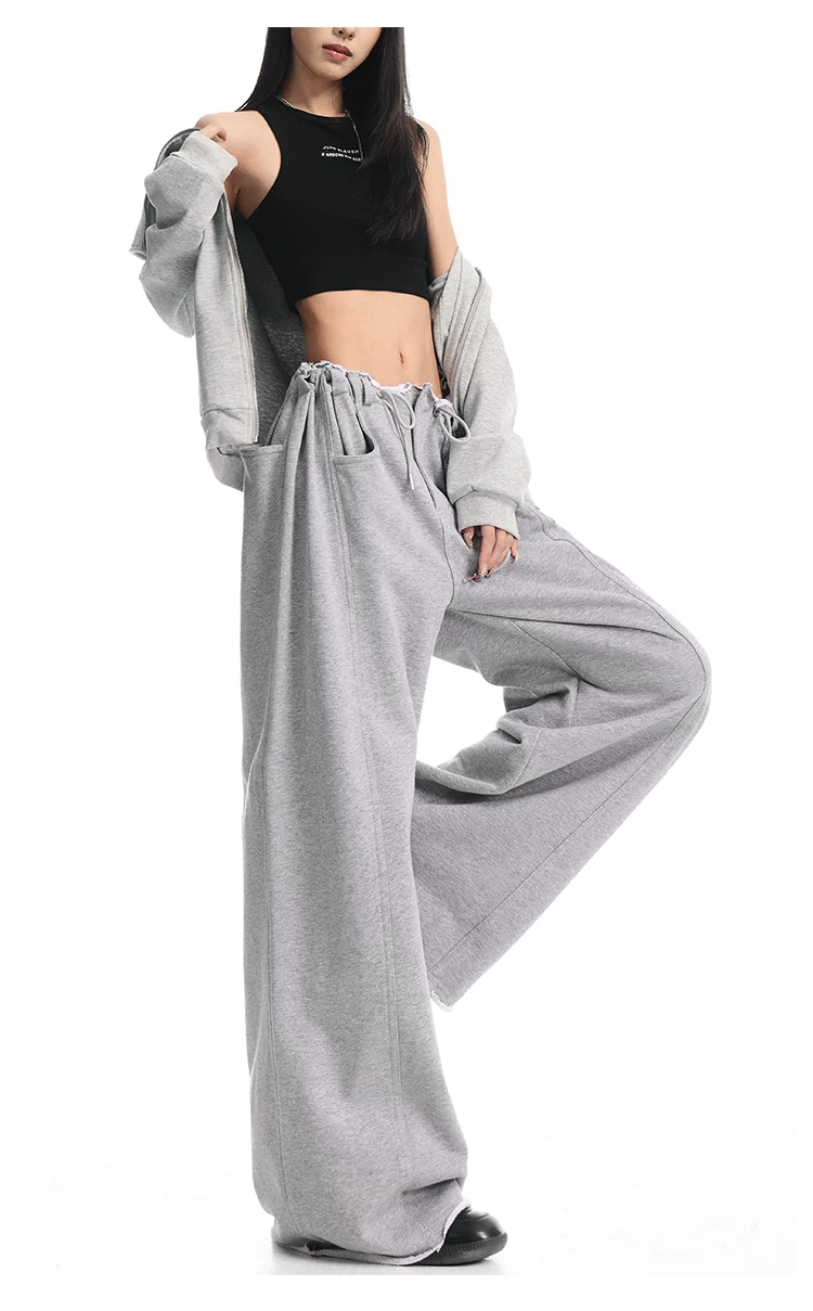 - KEN STUDIO Xuân Thu Mới Màu Xám Dây Rút Quần Âu Nữ Cao Cấp Quần Ống Rộng Quần Dài Tới Chân