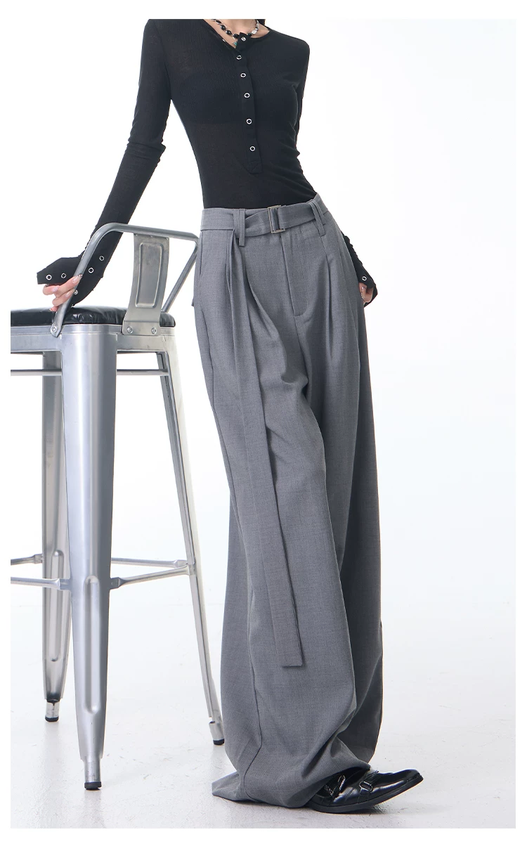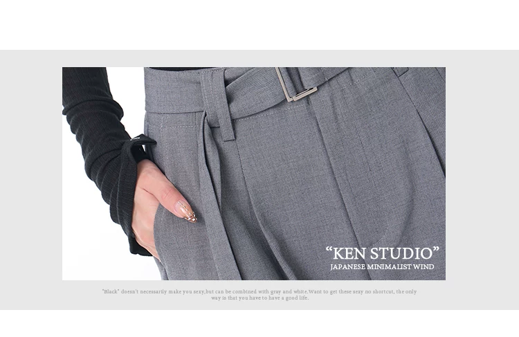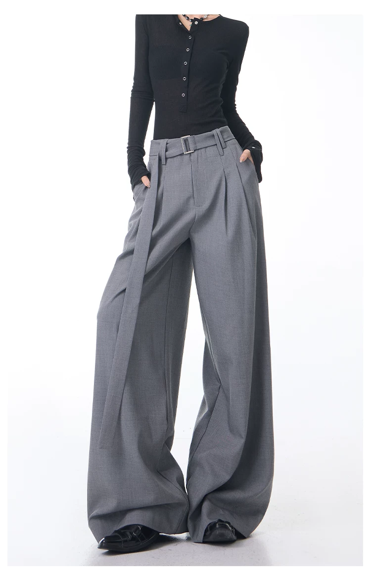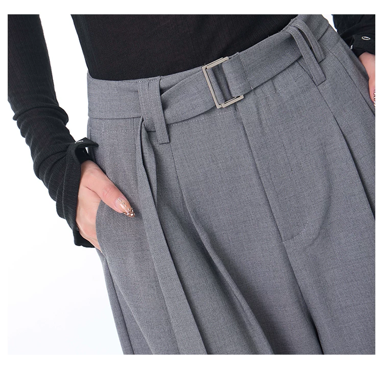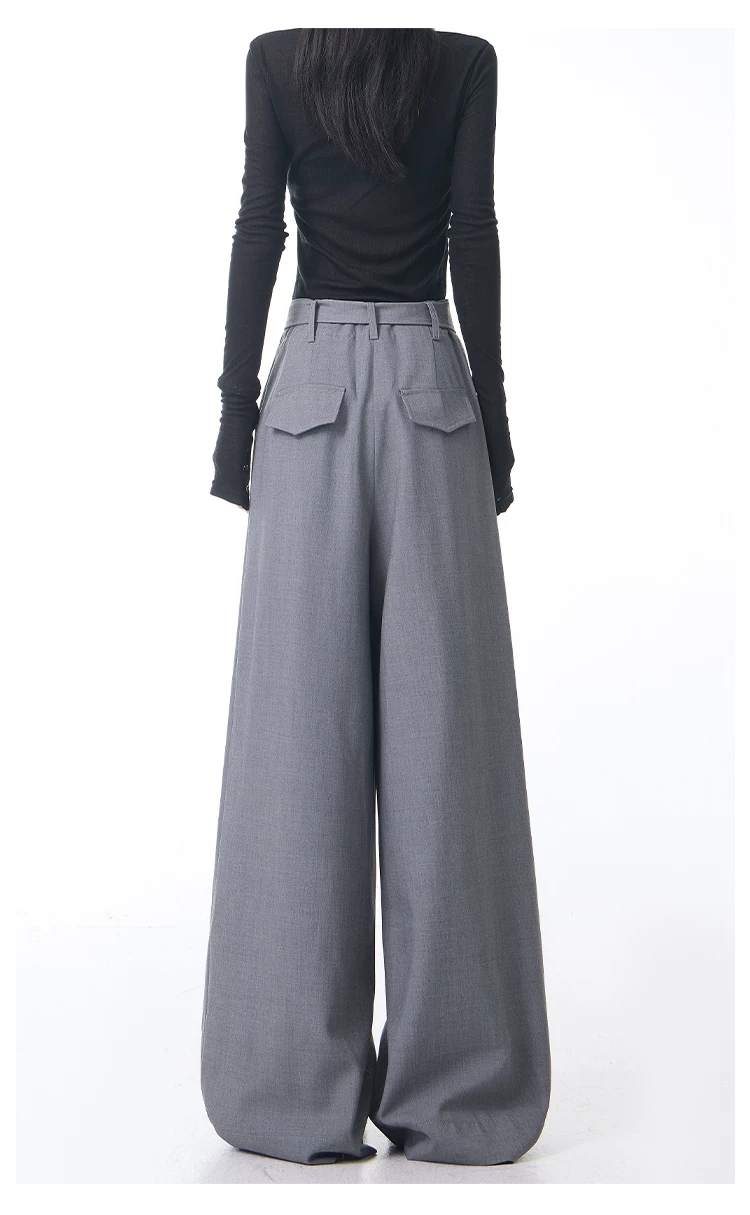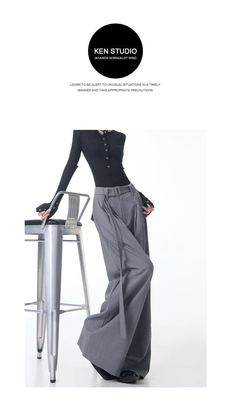 - KEN STUDIO Xuân Thu Mới Màu Xám Xếp Ly Quần Tây Nữ Cao Cấp Dáng Rộng Giảm Béo Quần Dài Đến Tầng