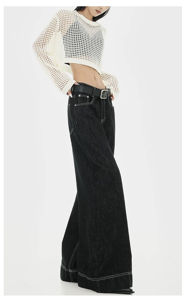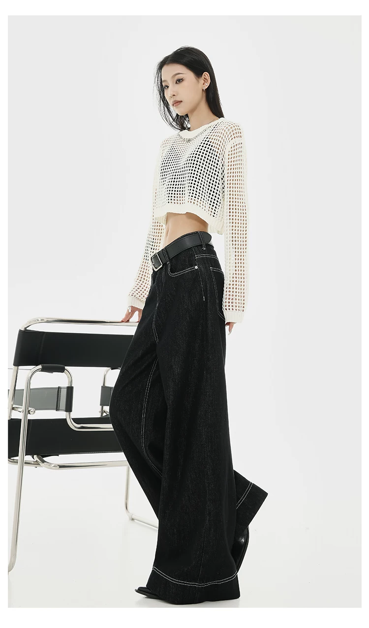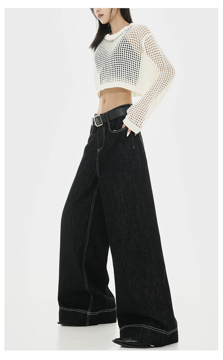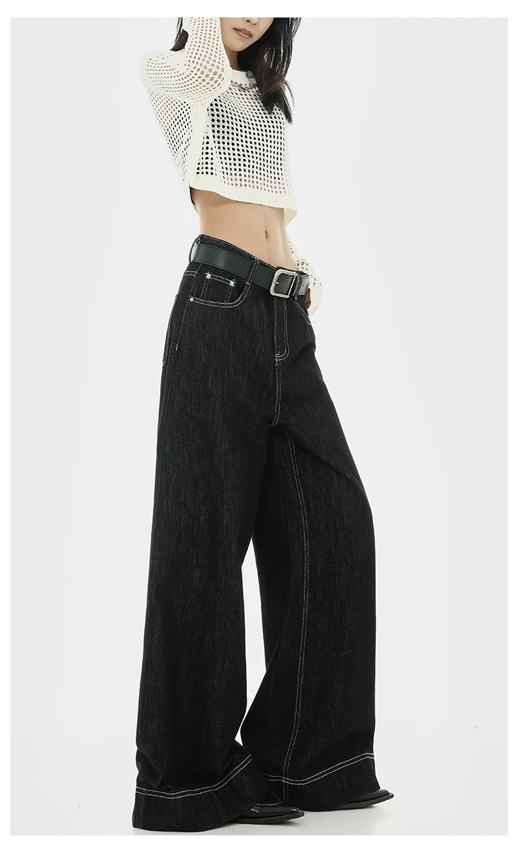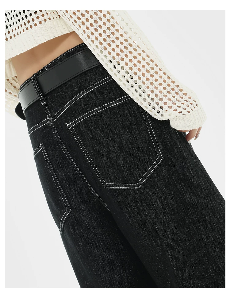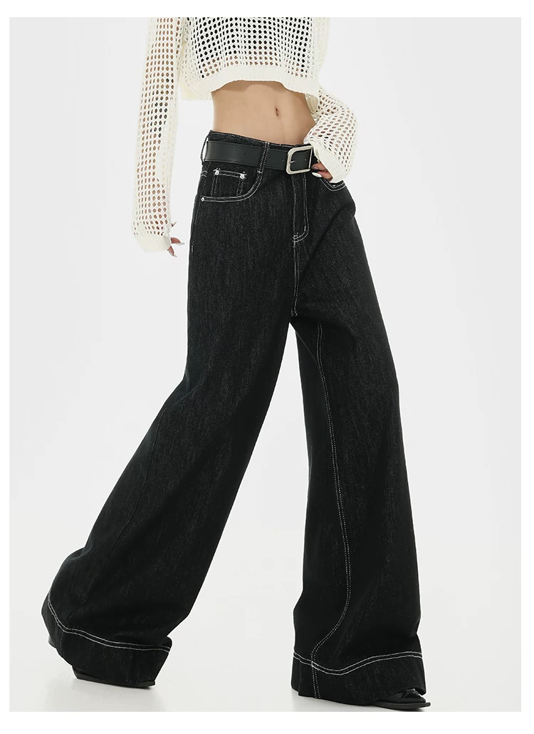 - KEN STUDIO Xuân Thu Mới Phong Cách Retro Mỹ Thiết Kế Đường May Đen Quần Jean Ống Thẳng Quần Ống Rộng Cao Cho Nữ