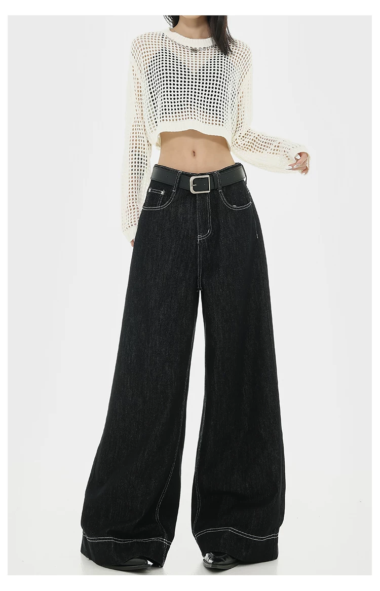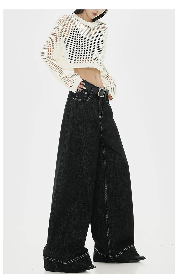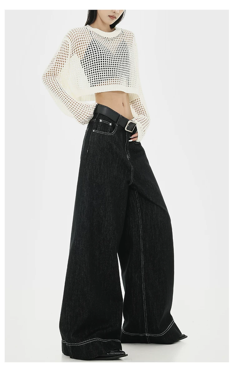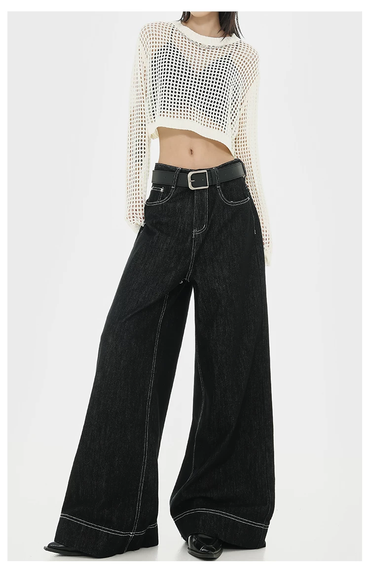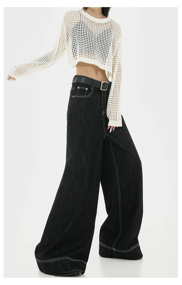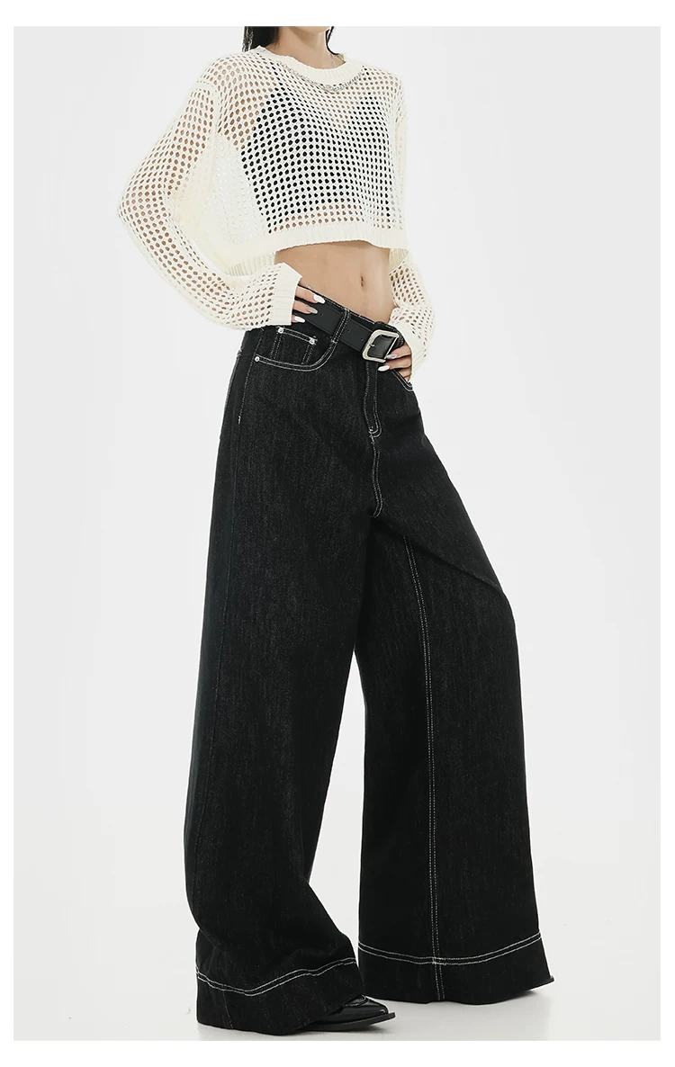 - KEN STUDIO Xuân Thu Mới Phong Cách Retro Mỹ Thiết Kế Đường May Đen Quần Jean Ống Thẳng Quần Ống Rộng Cao Cho Nữ
