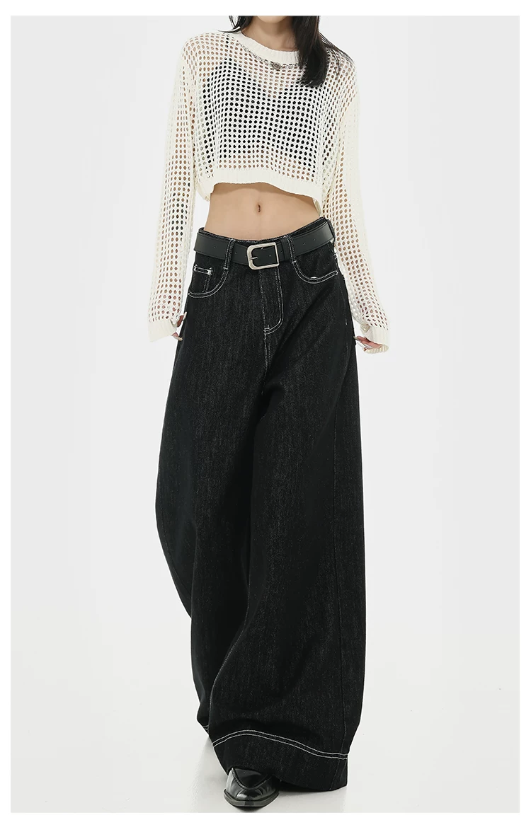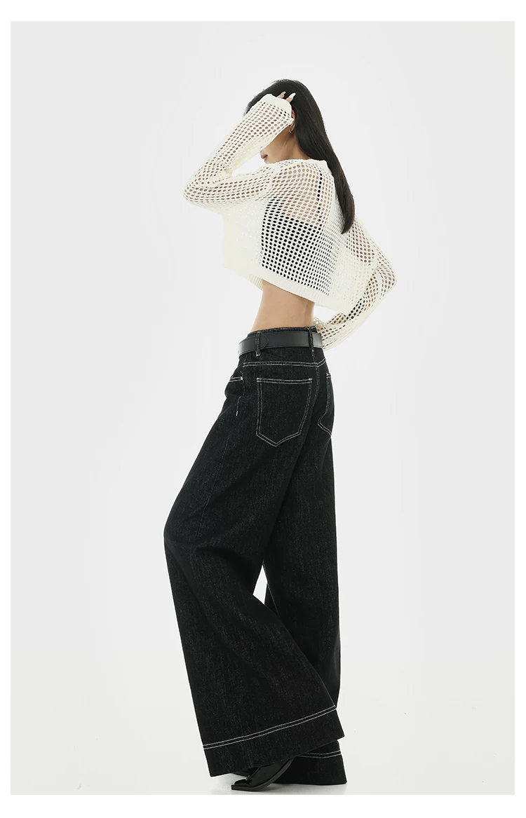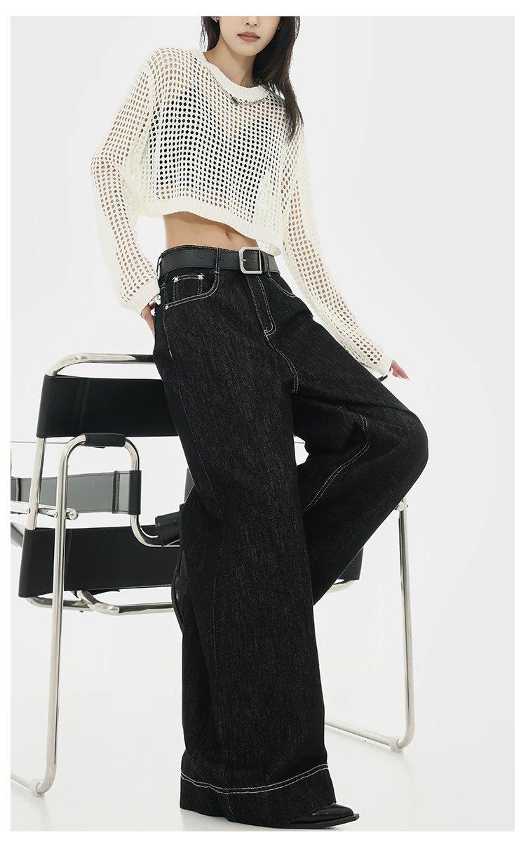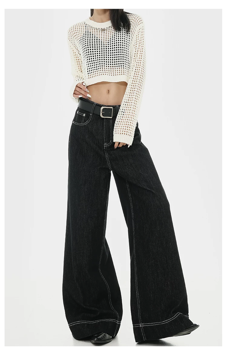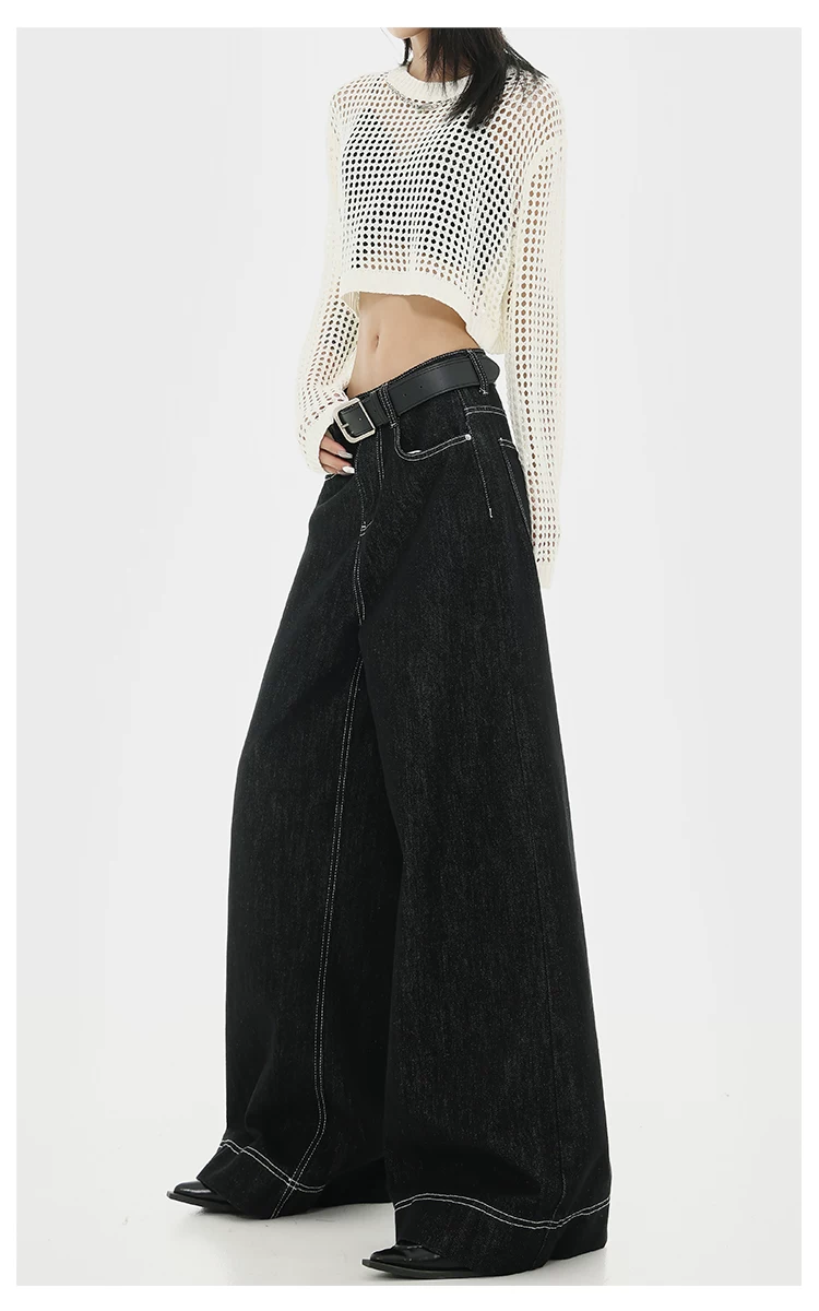 - KEN STUDIO Xuân Thu Mới Phong Cách Retro Mỹ Thiết Kế Đường May Đen Quần Jean Ống Thẳng Quần Ống Rộng Cao Cho Nữ