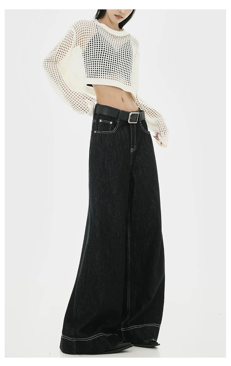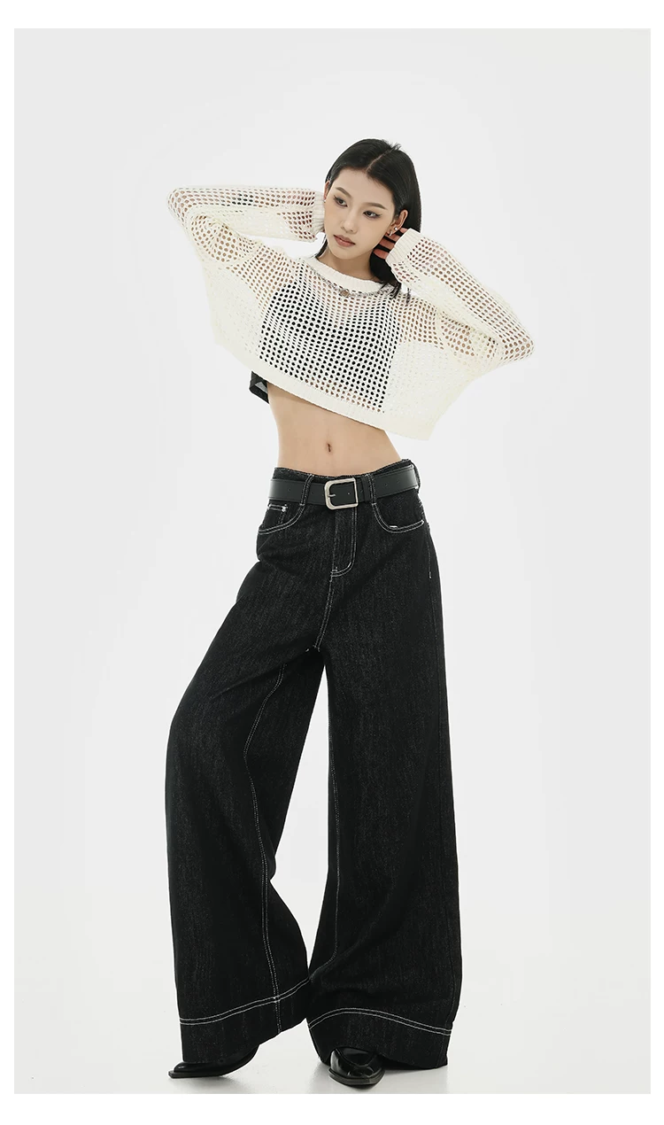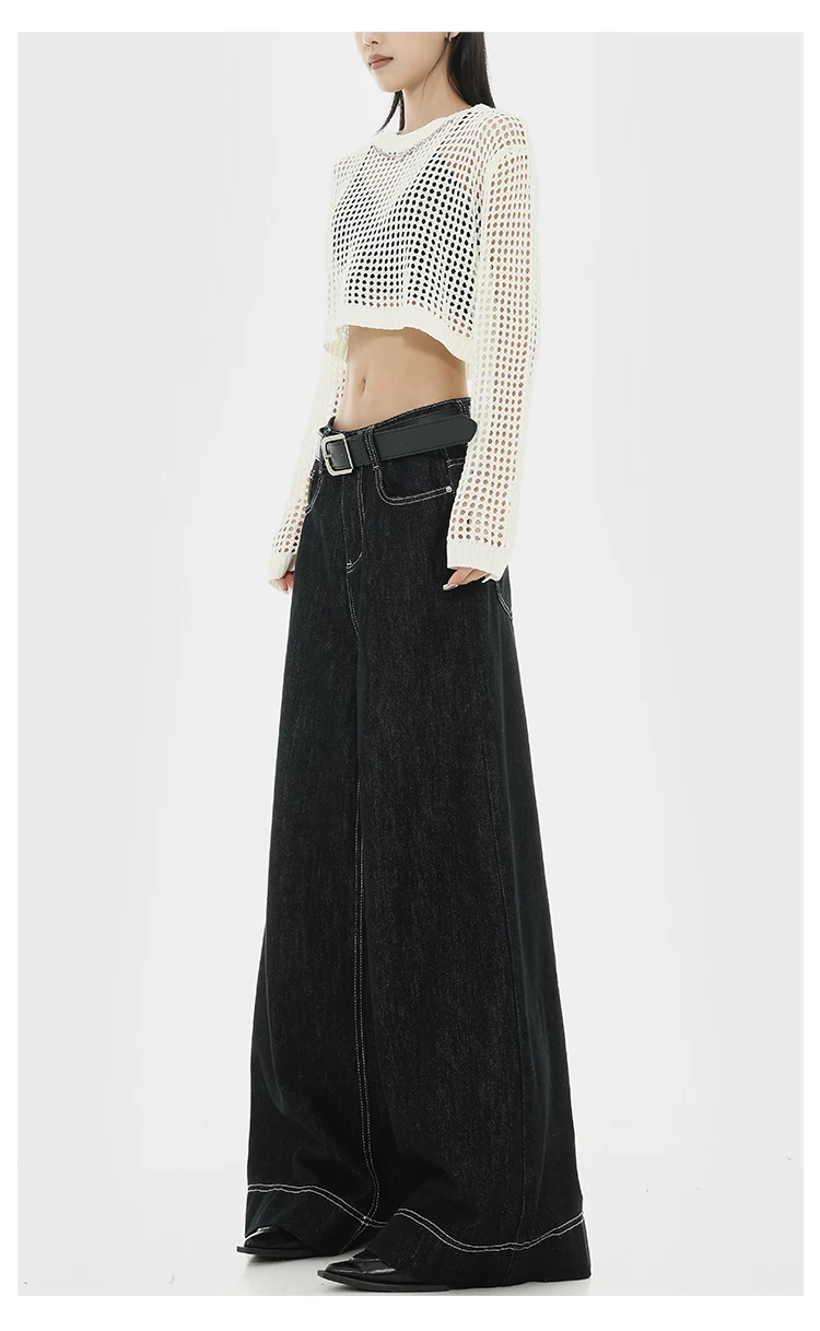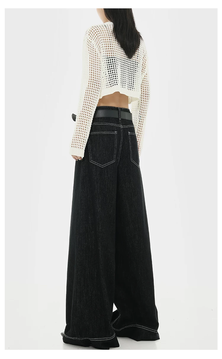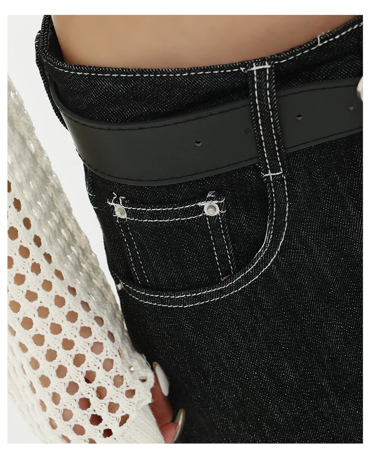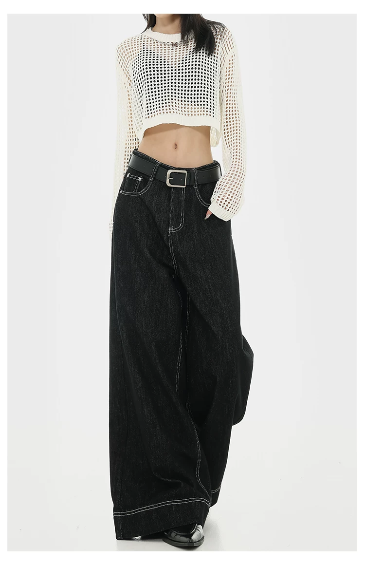 - KEN STUDIO Xuân Thu Mới Phong Cách Retro Mỹ Thiết Kế Đường May Đen Quần Jean Ống Thẳng Quần Ống Rộng Cao Cho Nữ