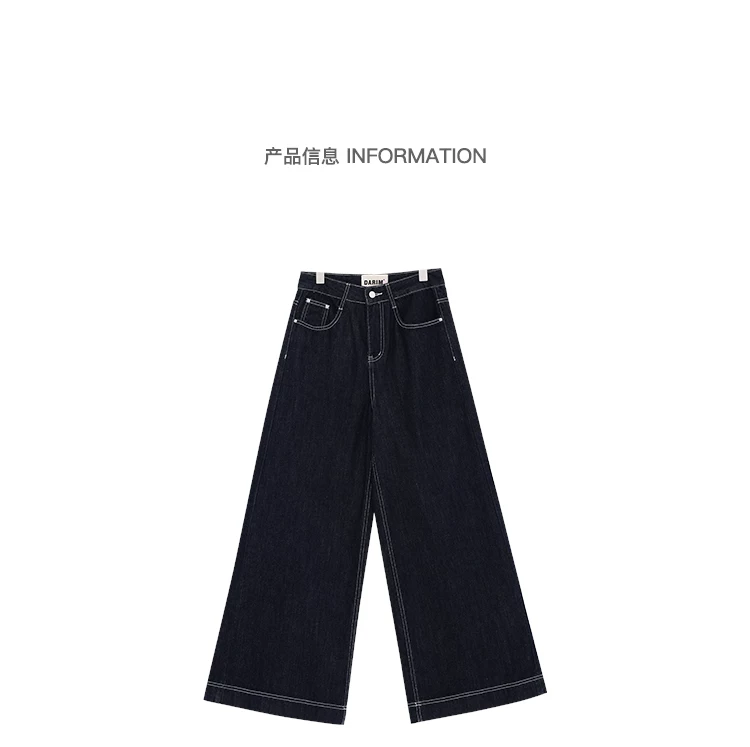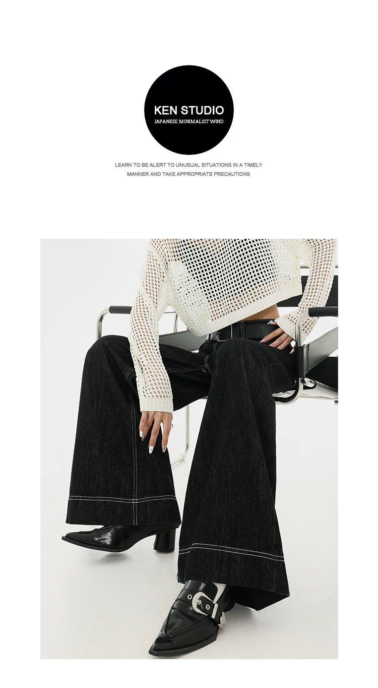 KEN STUDIO Xuân Thu Mới Phong Cách Retro Mỹ Thiết Kế Đường May Đen Quần Jean Ống Thẳng Quần Ống Rộng Cao Cho Nữ