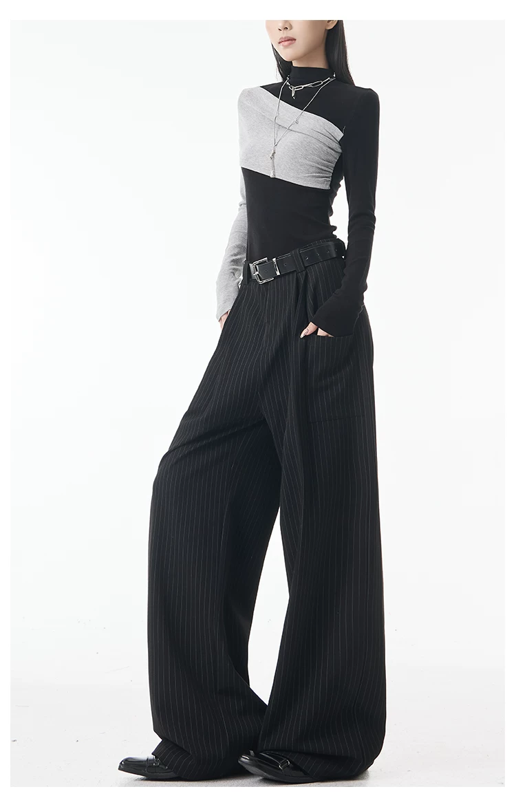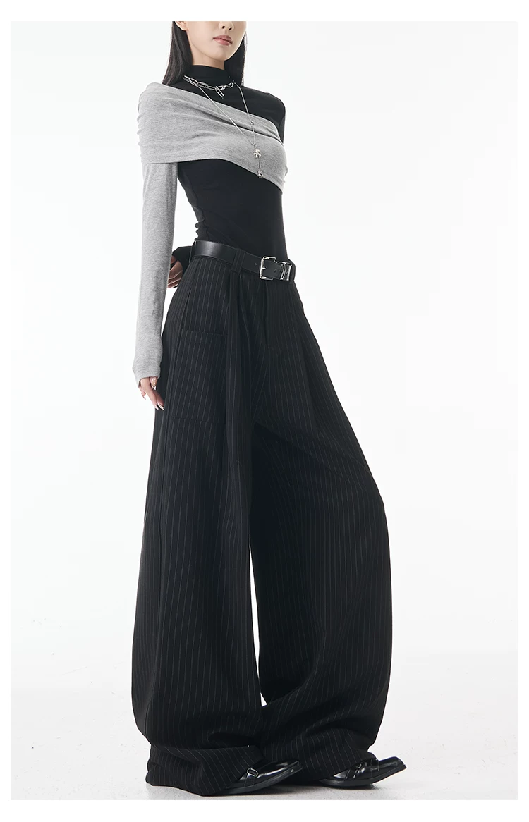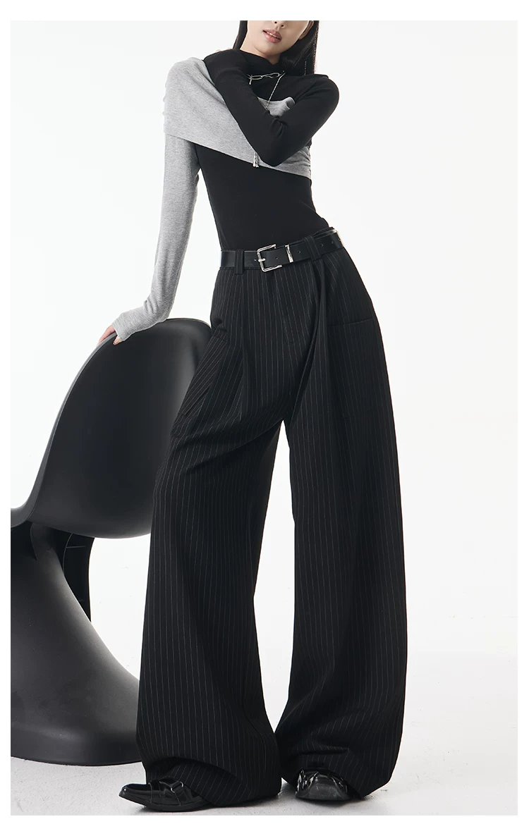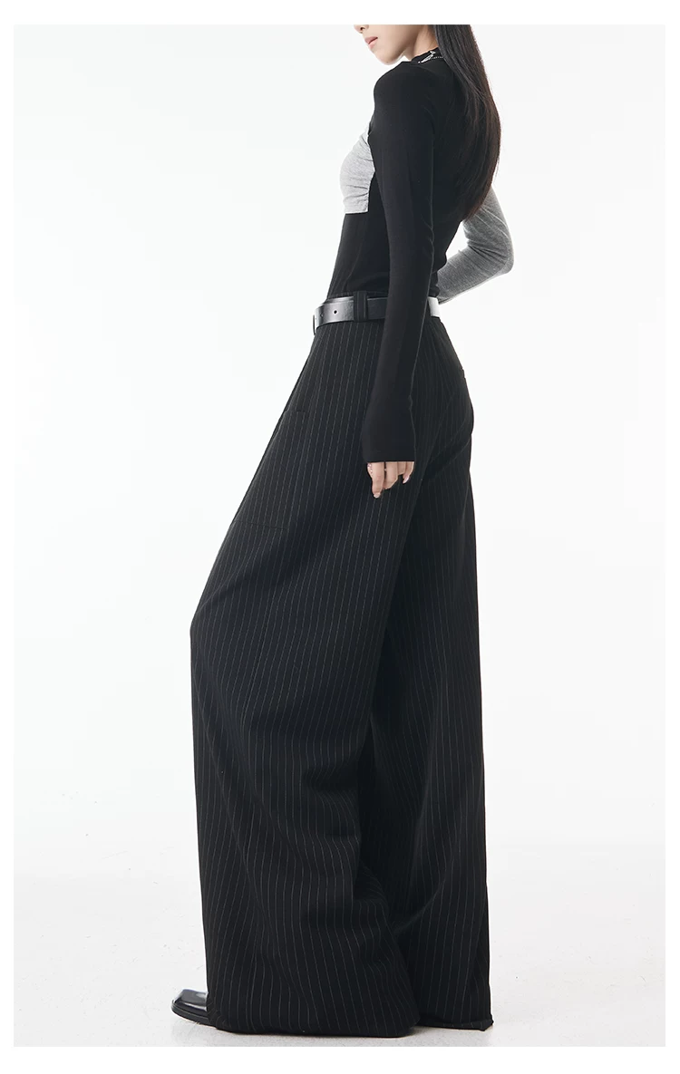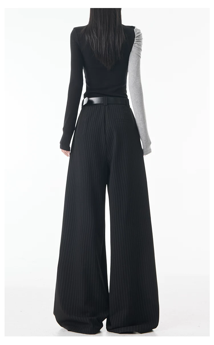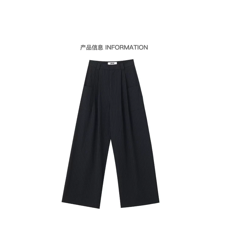 - KEN STUDIO Xuân Thu Mới Quần Âu Sọc Đen Ống Rộng Cho Nữ Quần Âu Cạp Cao Draping Giảm Béo Quần Âu