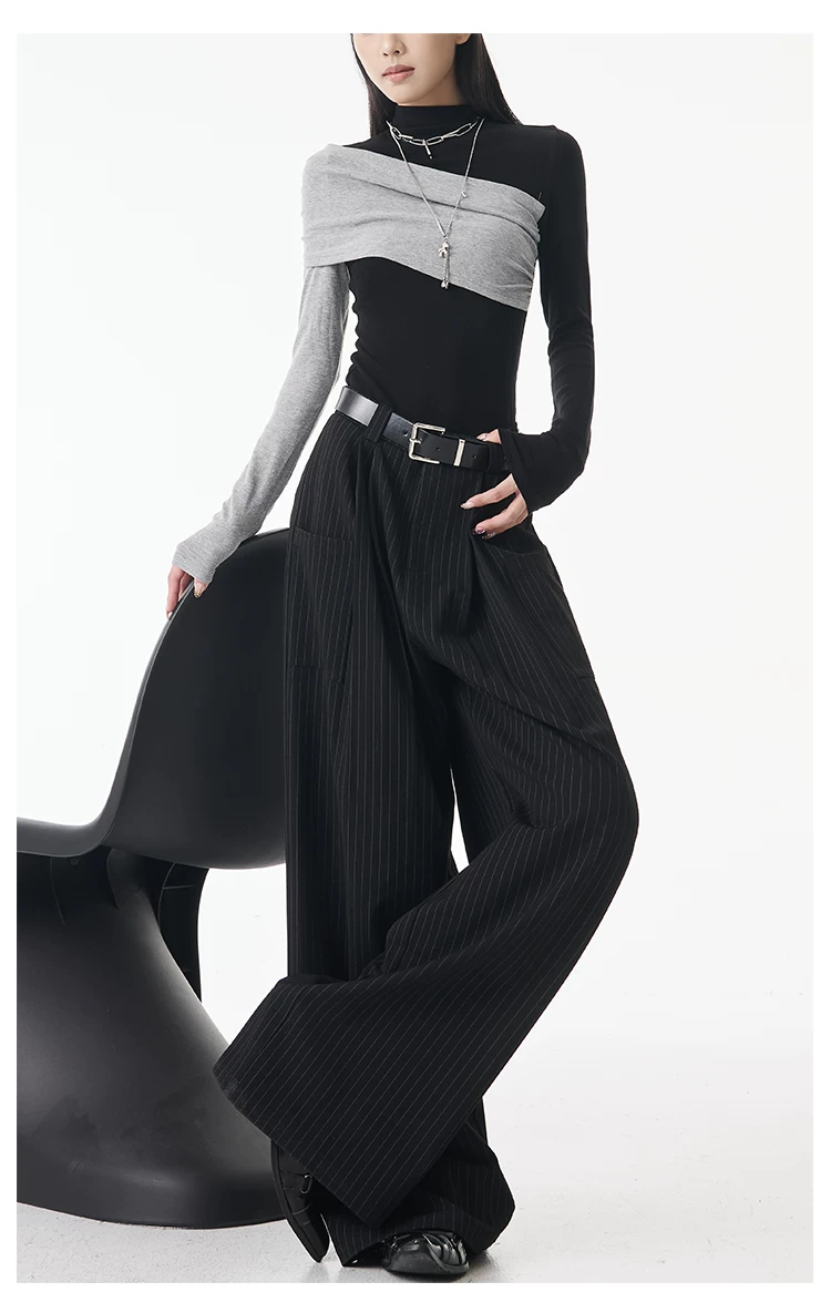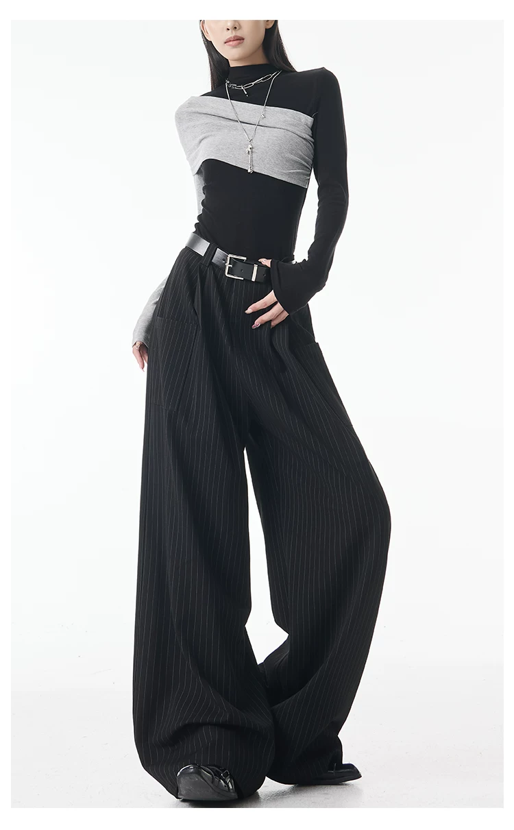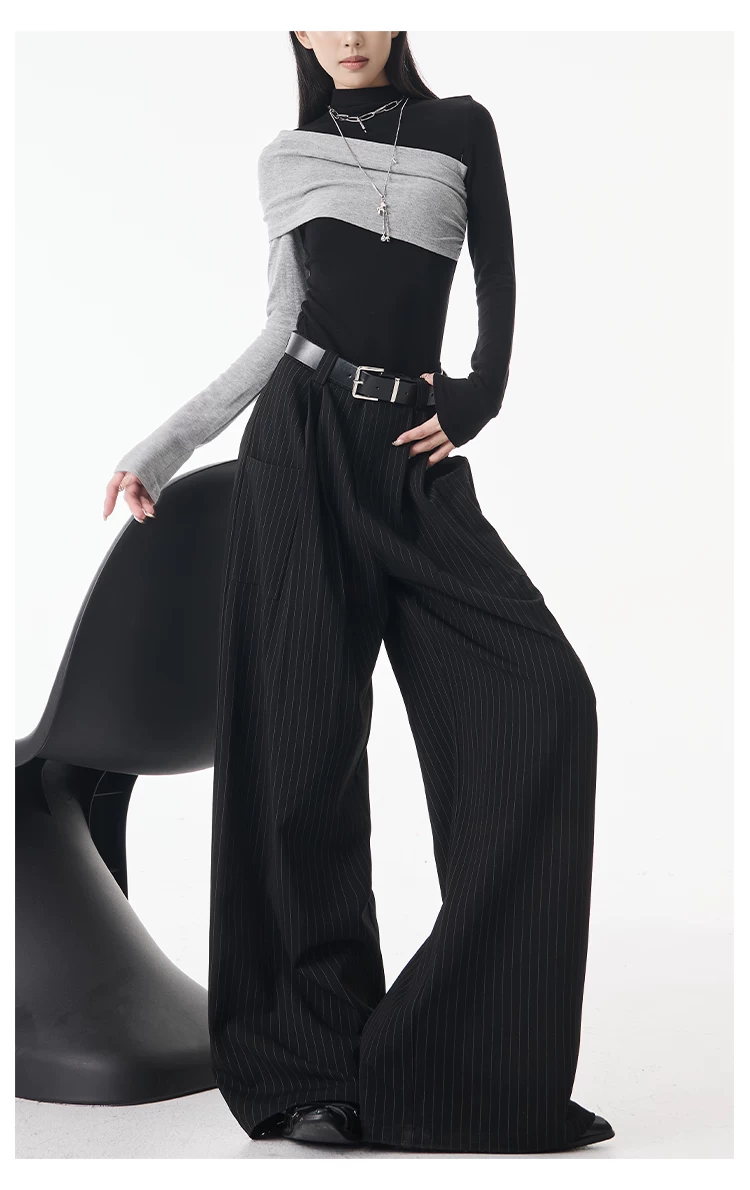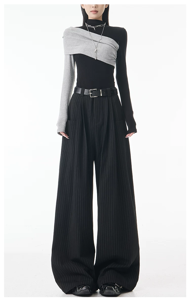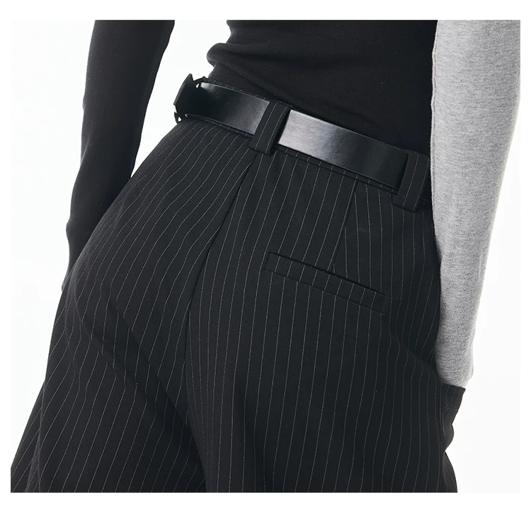 - KEN STUDIO Xuân Thu Mới Quần Âu Sọc Đen Ống Rộng Cho Nữ Quần Âu Cạp Cao Draping Giảm Béo Quần Âu
