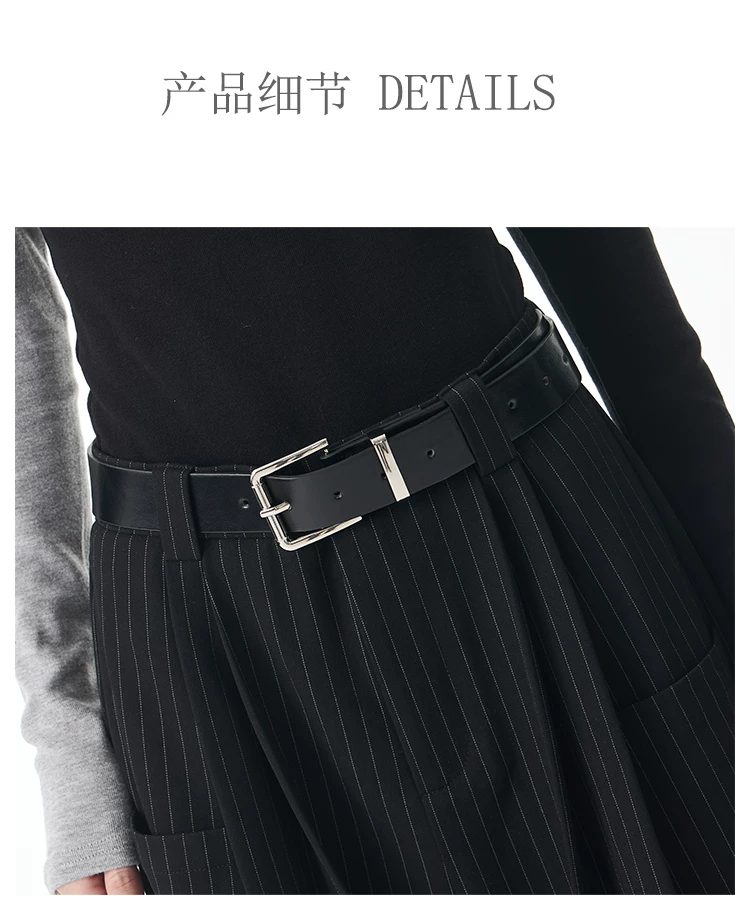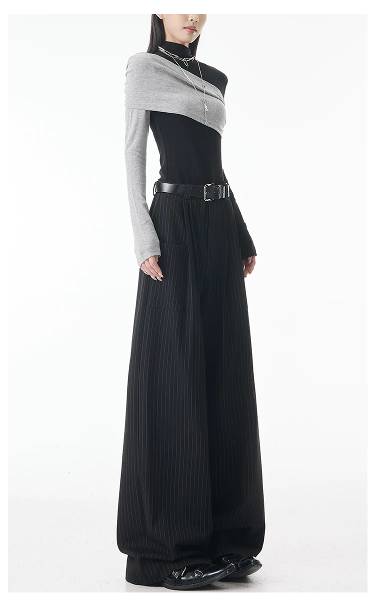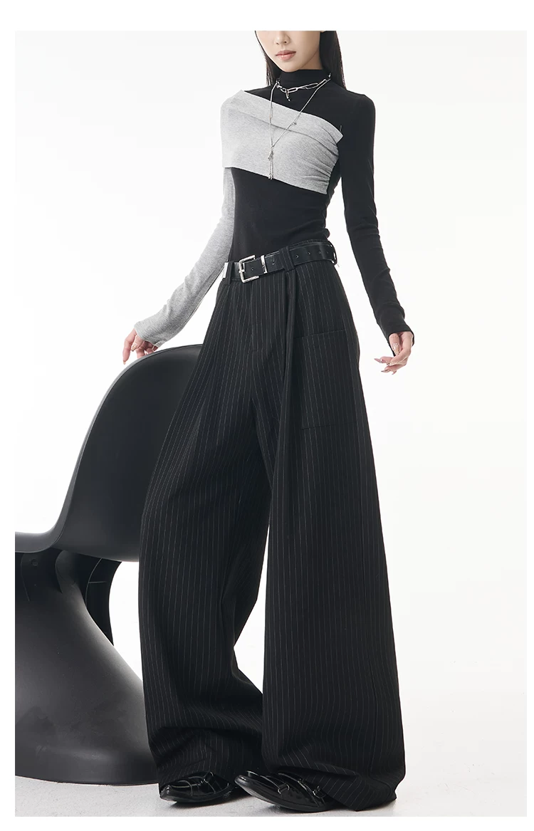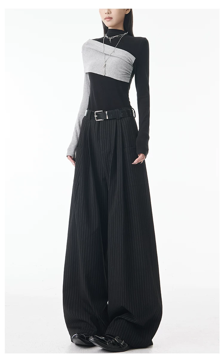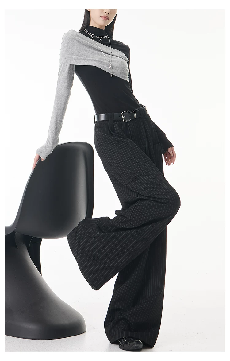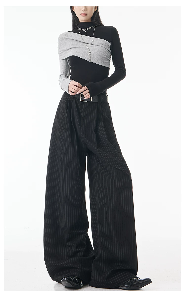 - KEN STUDIO Xuân Thu Mới Quần Âu Sọc Đen Ống Rộng Cho Nữ Quần Âu Cạp Cao Draping Giảm Béo Quần Âu
