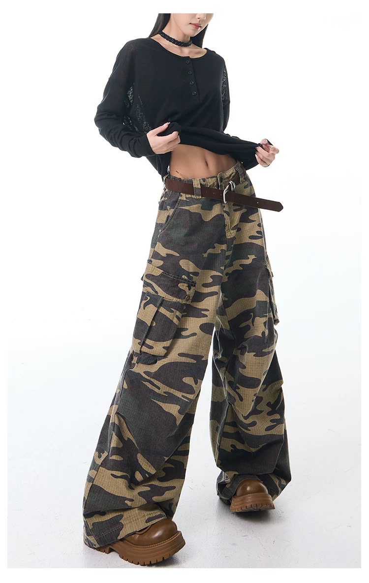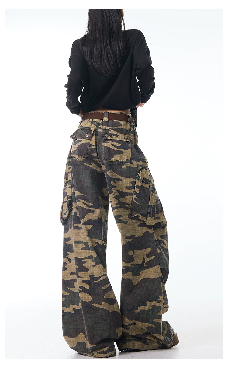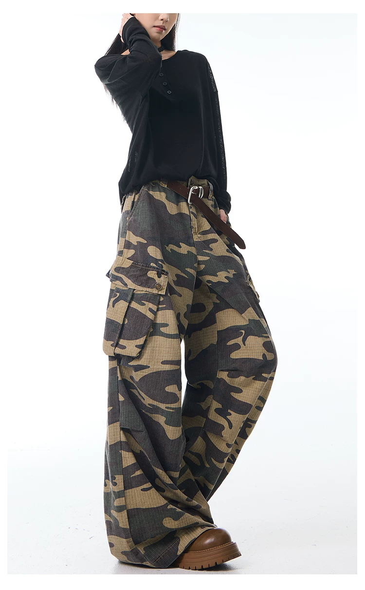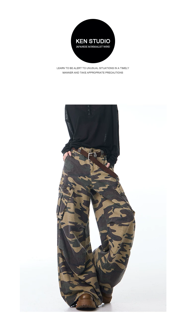 - KEN STUDIO Xuân Thu Mới Quần Cargo Ngụy Trang Cổ Điển Quần ống rộng nhiều túi dáng rộng cho nữ Quần dài đến sàn