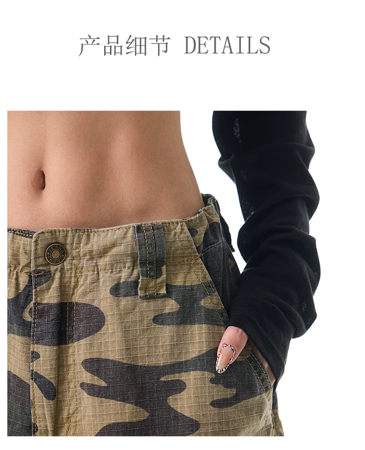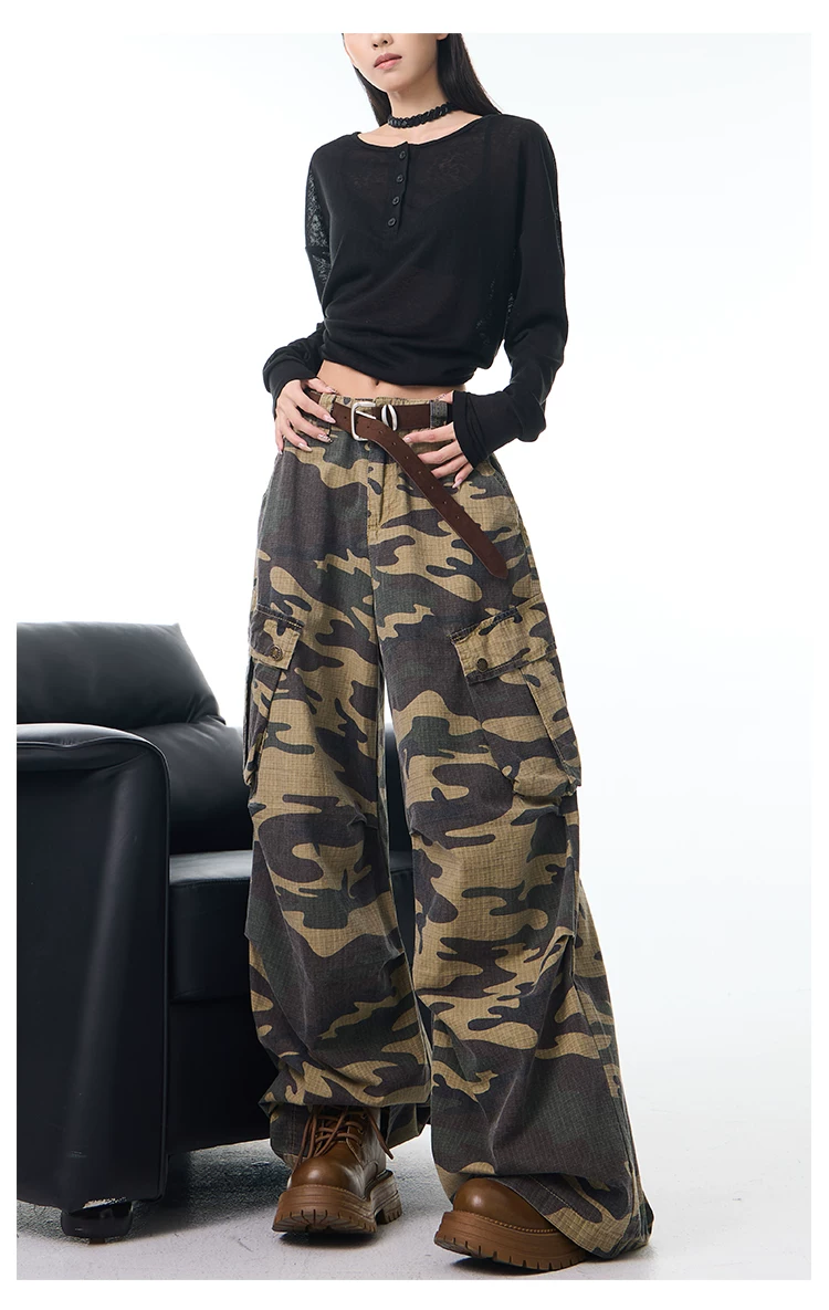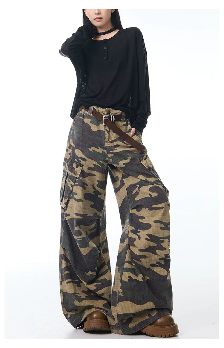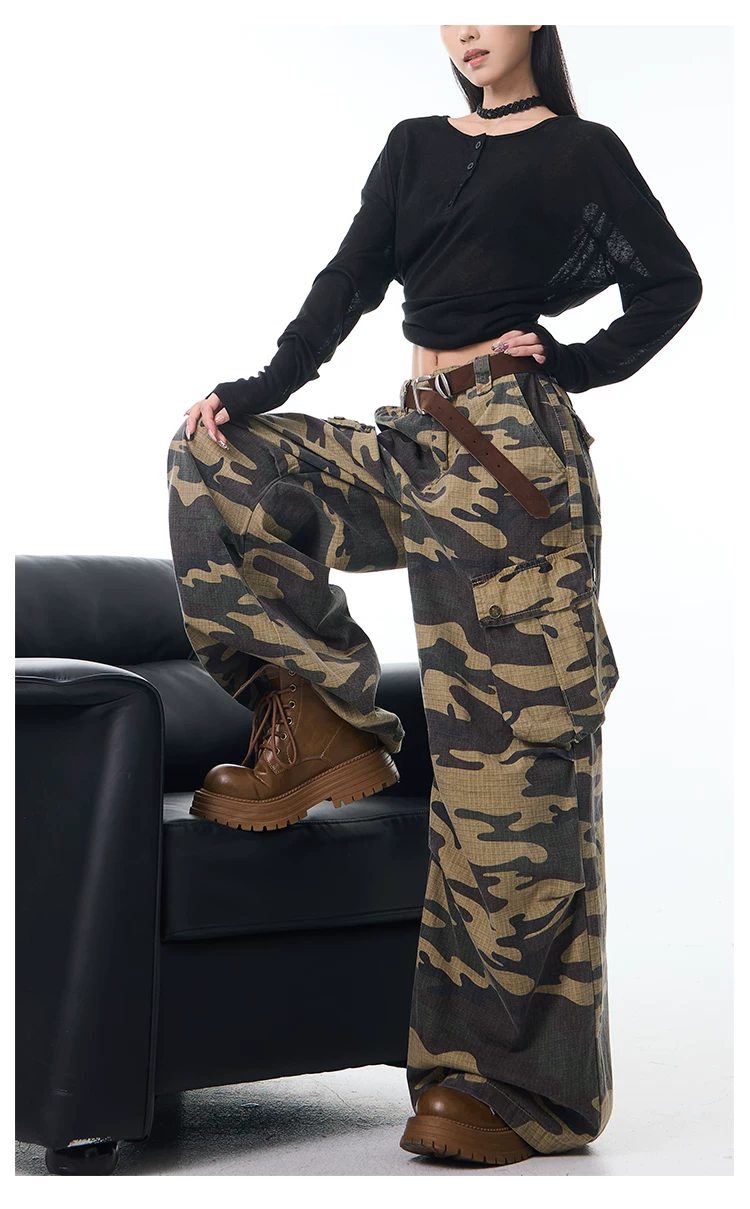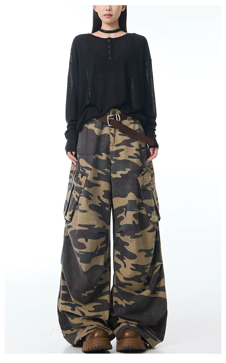 - KEN STUDIO Xuân Thu Mới Quần Cargo Ngụy Trang Cổ Điển Quần ống rộng nhiều túi dáng rộng cho nữ Quần dài đến sàn