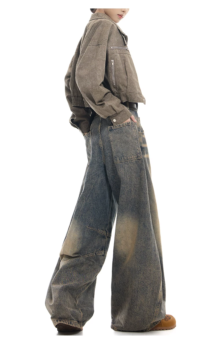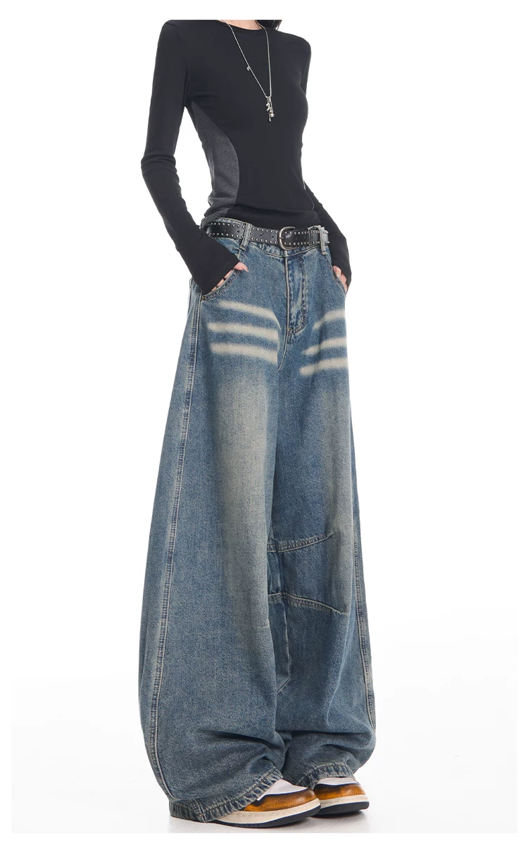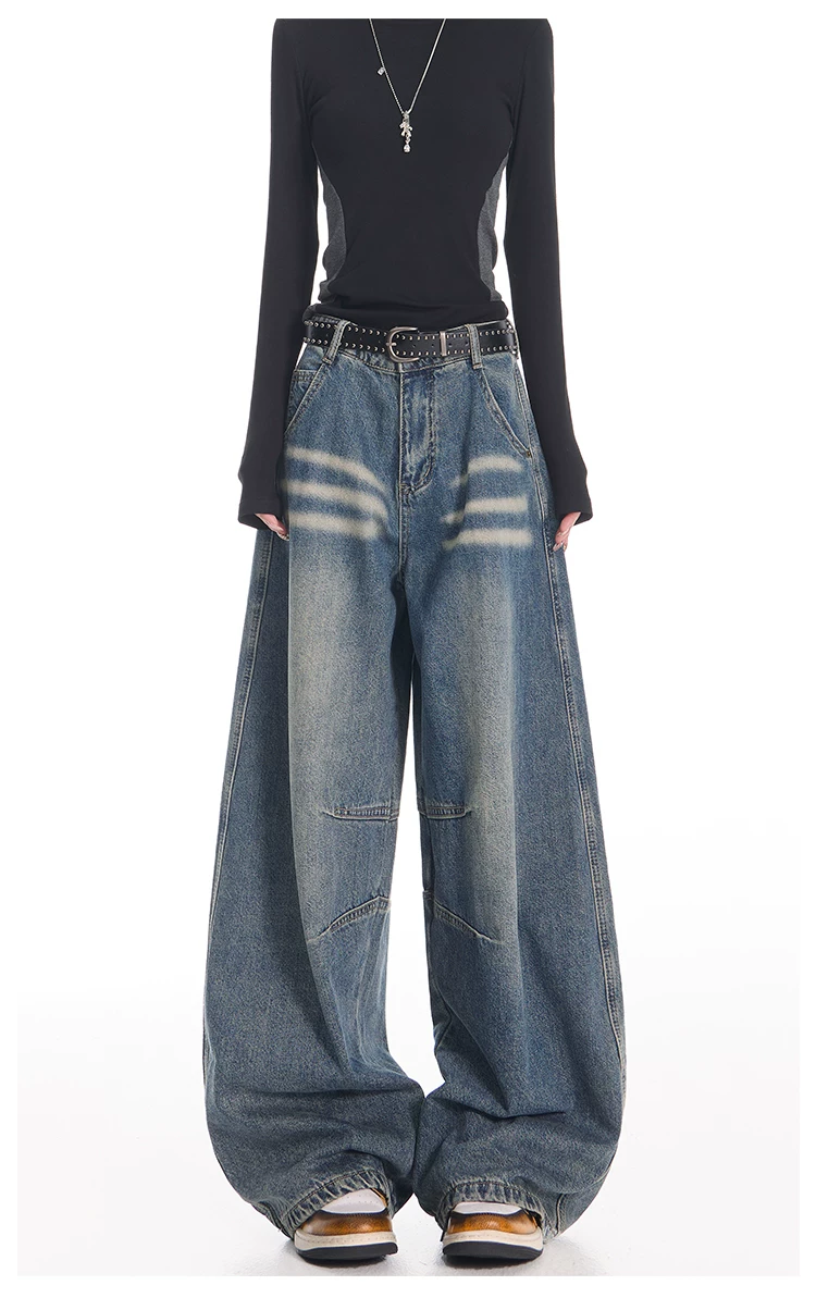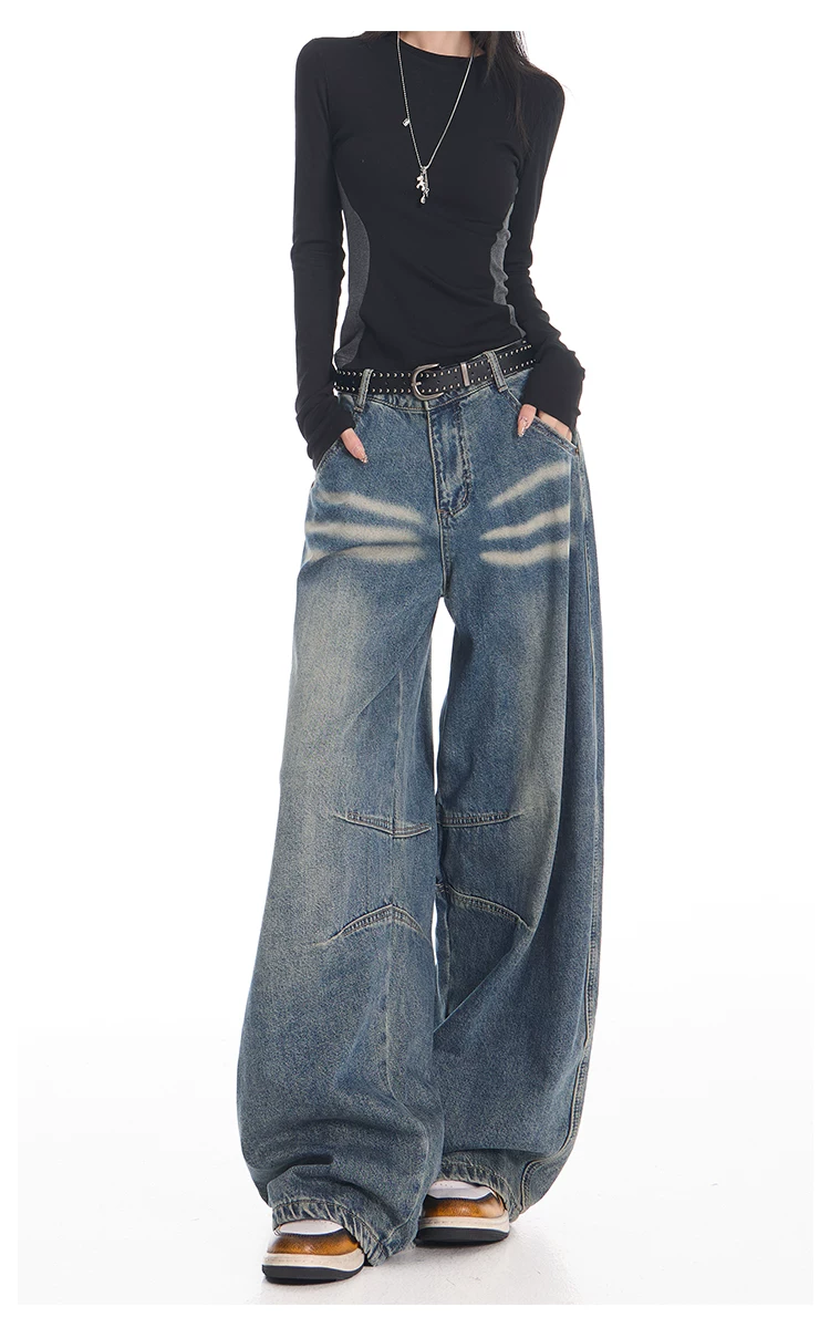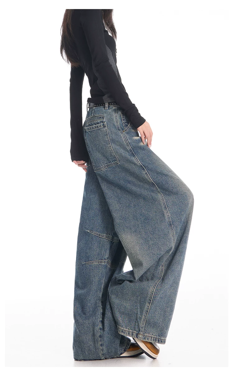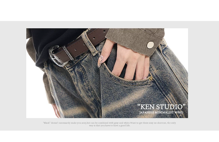 - KEN STUDIO Xuân Thu Mới Vintage Giặt Xước Quần Jeans Nữ Cao Cấp Rộng Ống Quần Scimitar