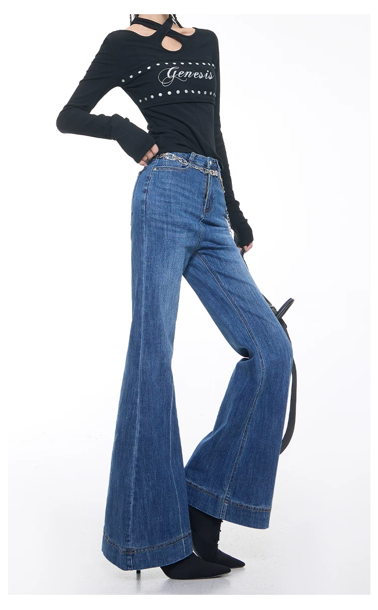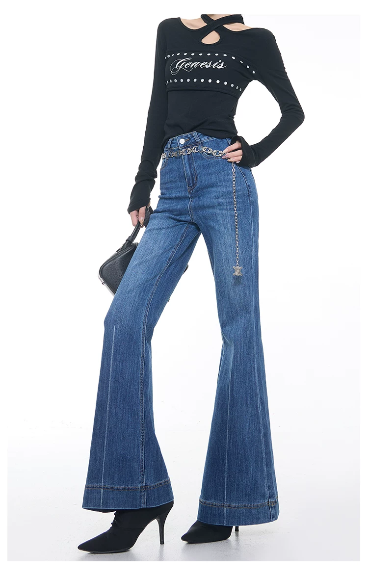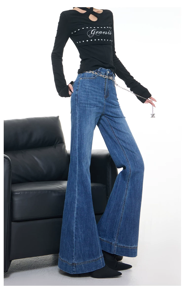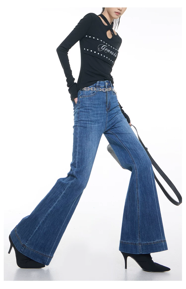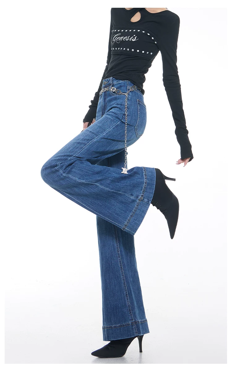 - KEN STUDIO Xuân Thu Mới Vintage Xanh Dương Quần Jean Loe Nữ Cao Cấp Slim Fit Co Giãn Quần Đáy Chuông