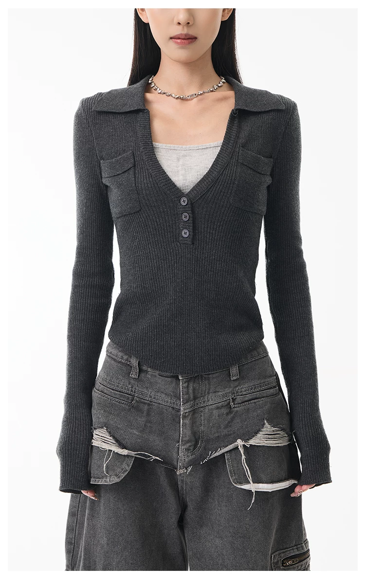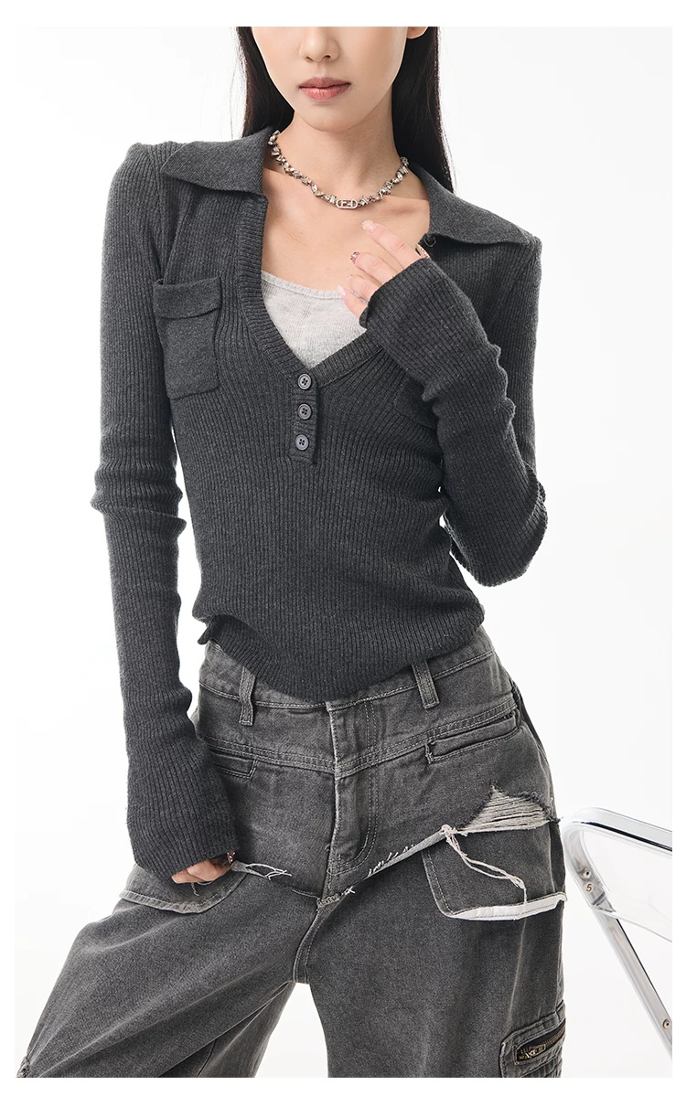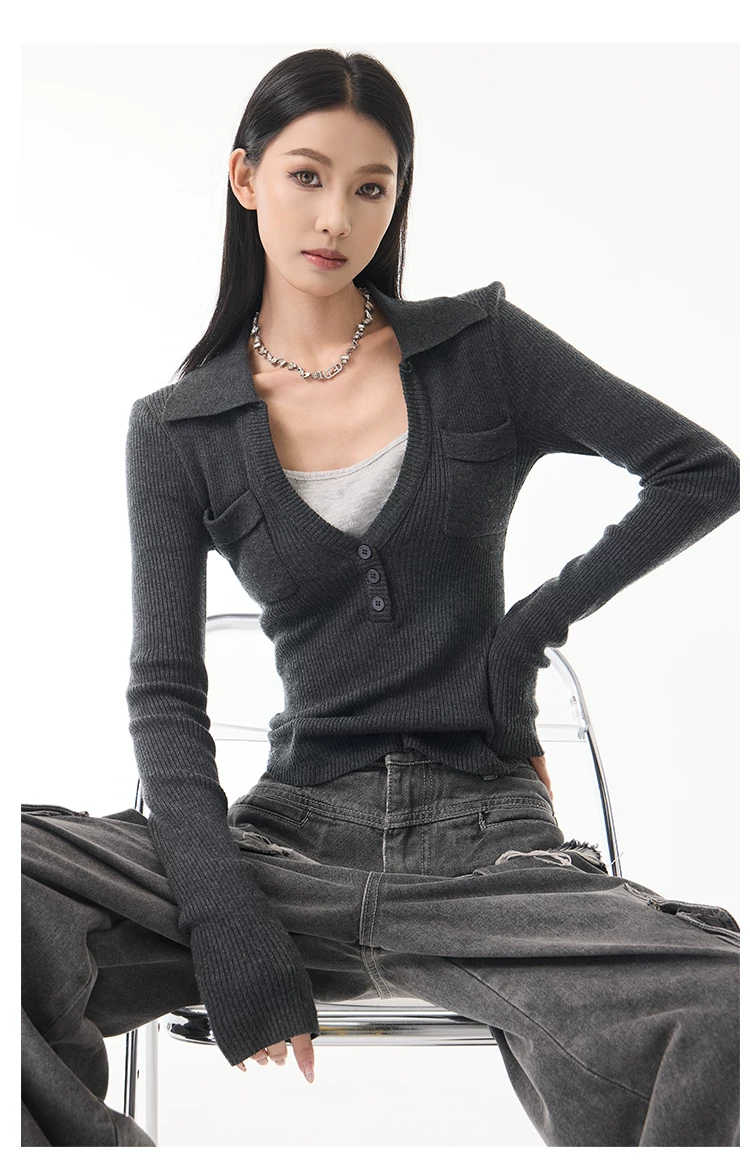 KEN STUDIO Xuân Thu Phong Cách Mới Màu Xám Đậm Áo Len Dệt Kim Giả Hai Mảnh Áo Len Dệt Kim Dài Tay Slim-Fit Áo Sơ Mi Dài Tay Cho Nữ