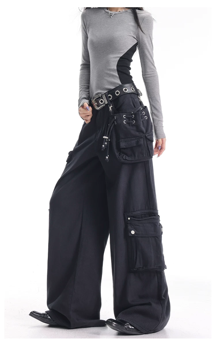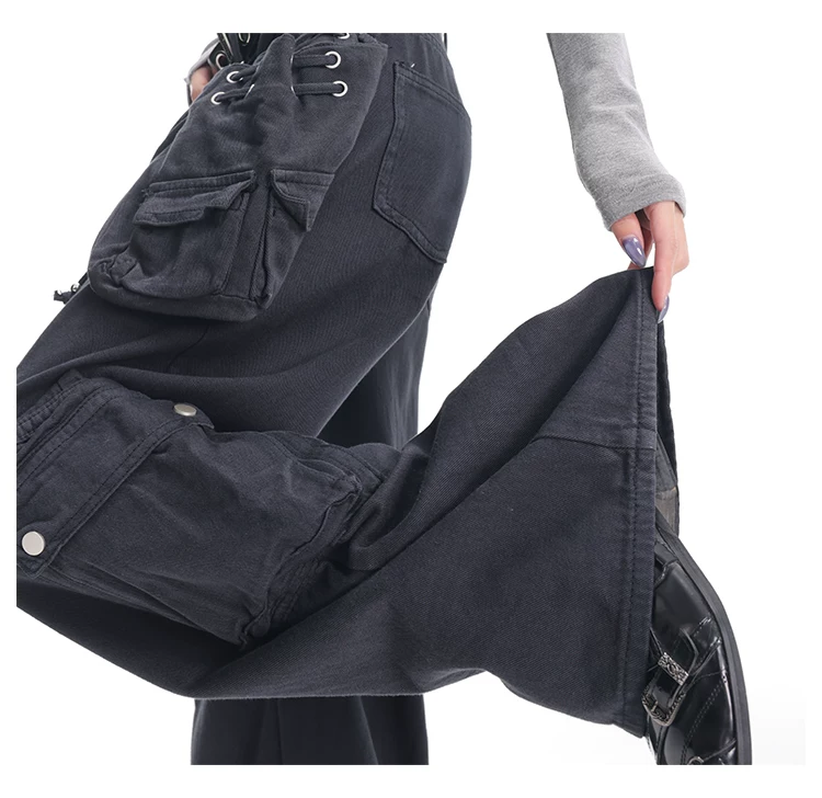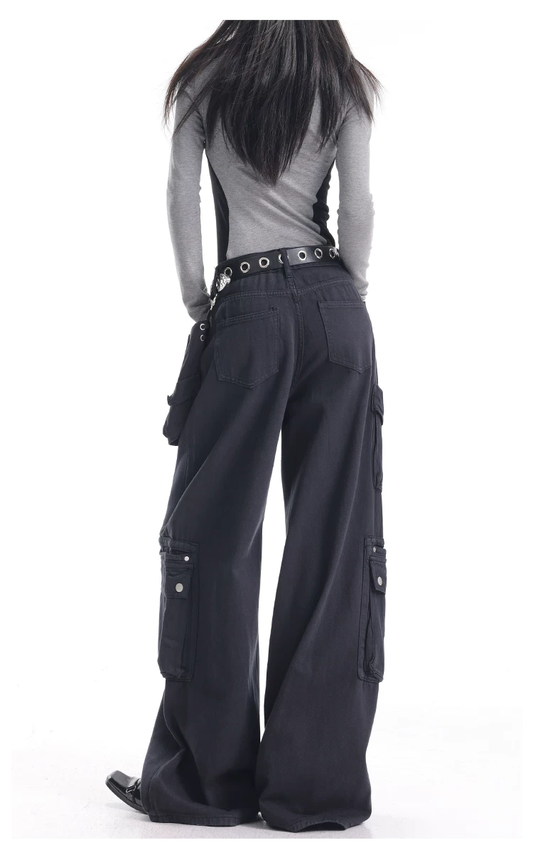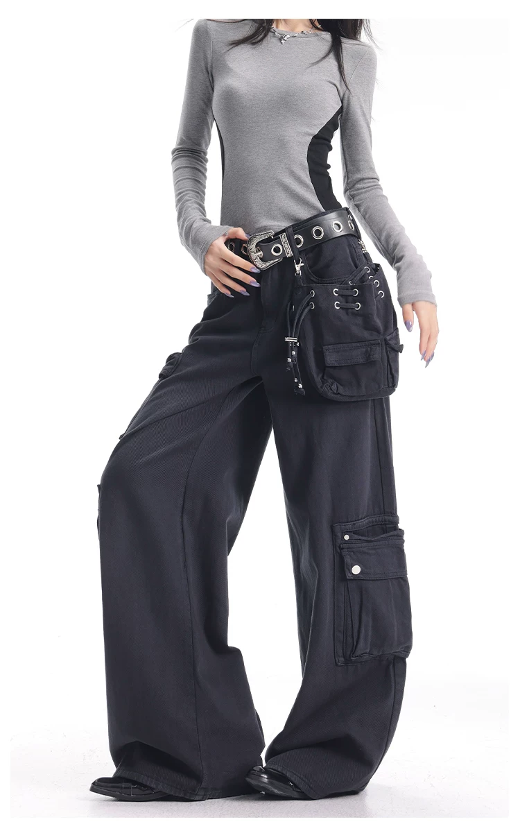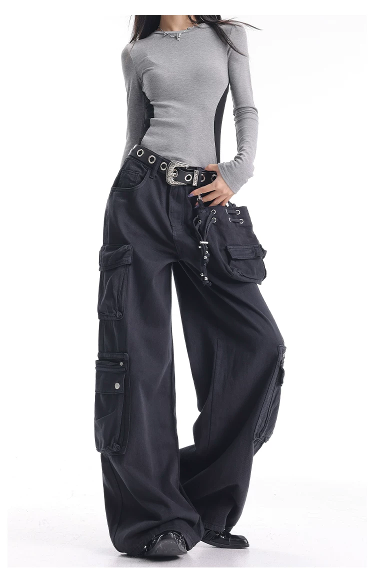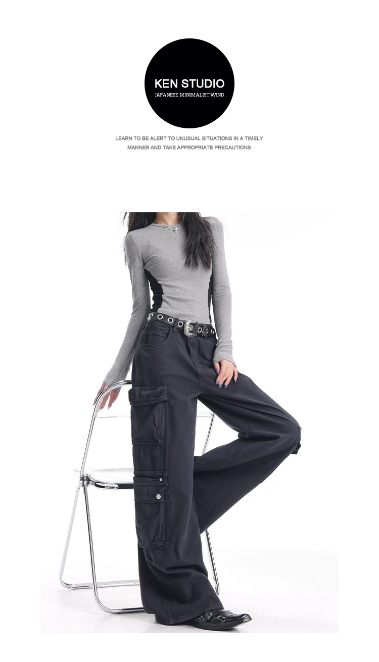 - KEN STUDIO Xuân Thu Quần Cargo Đường Phố Cao Cấp Màu Xanh Hải Quân Mới Quần Cargo Nữ Nhiều Túi Quần Ống Rộng Quần Ống Rộng