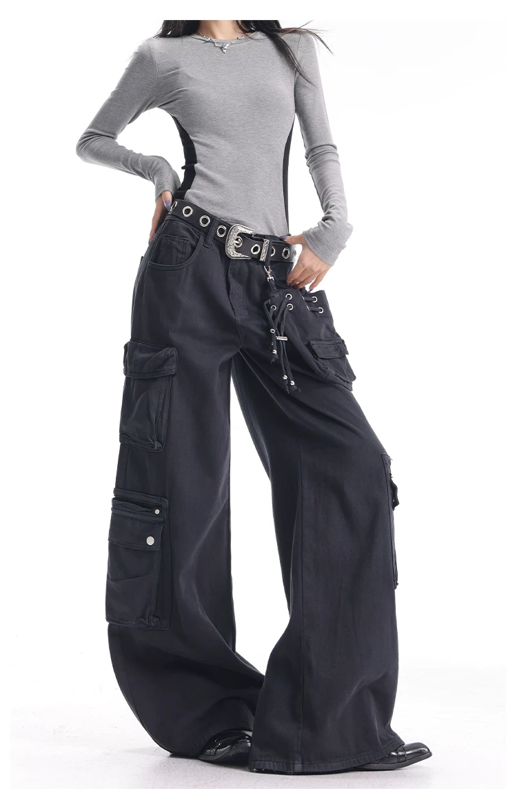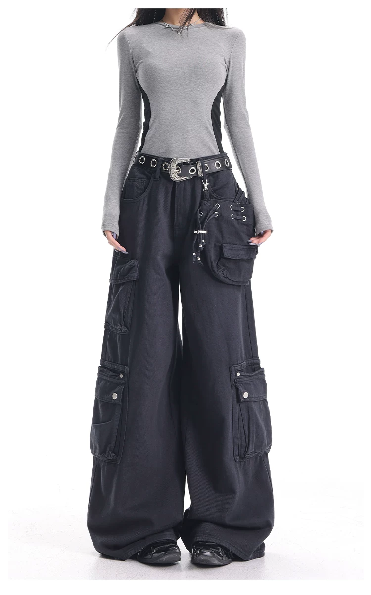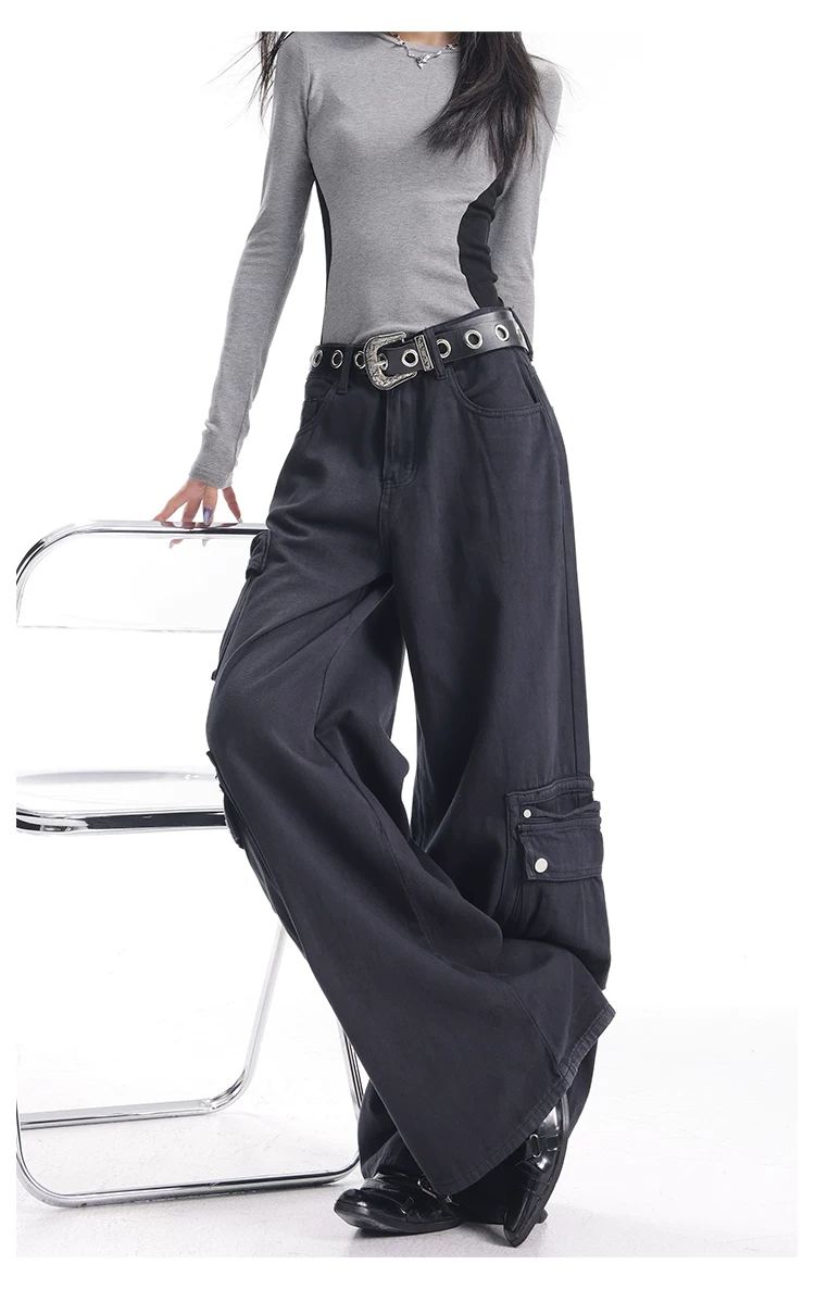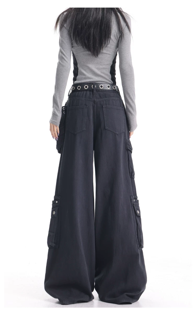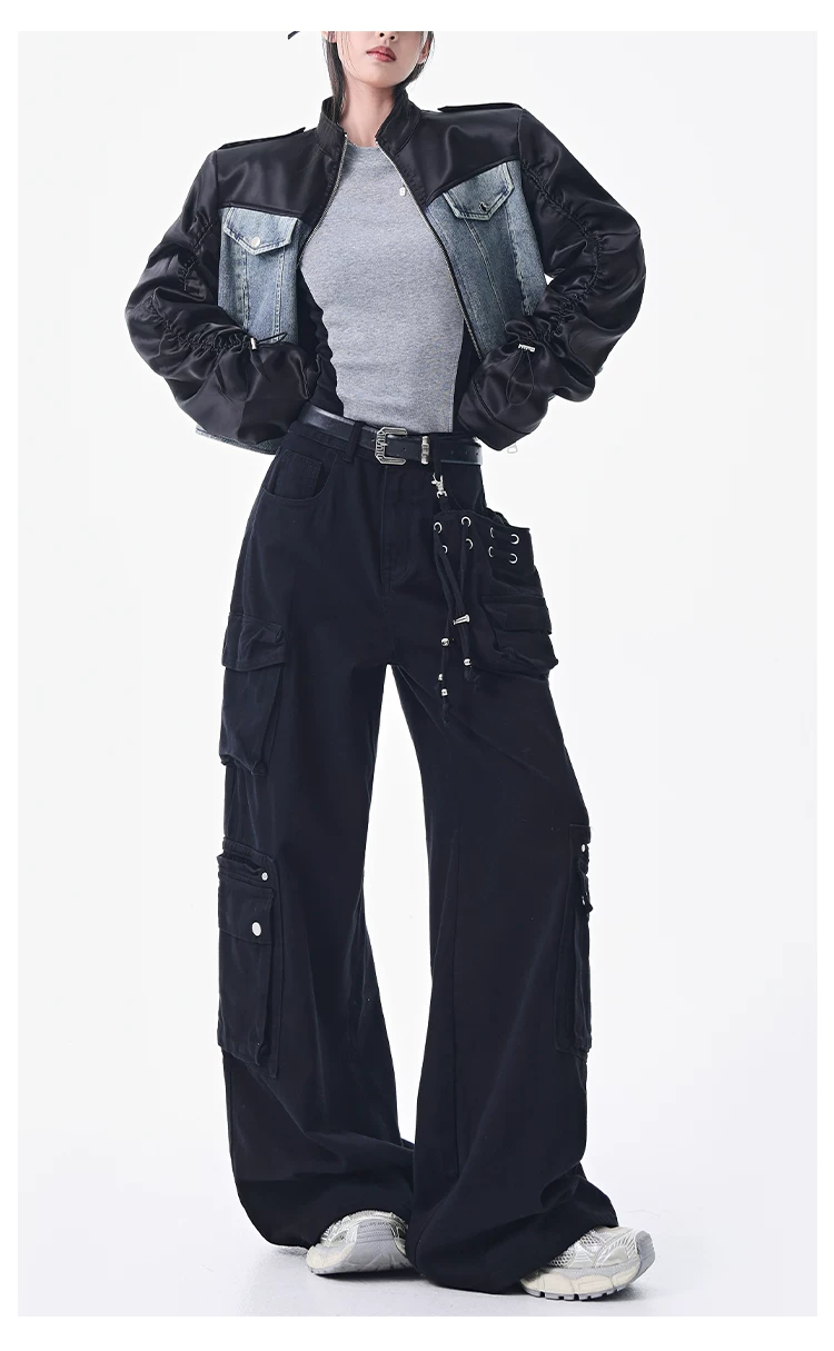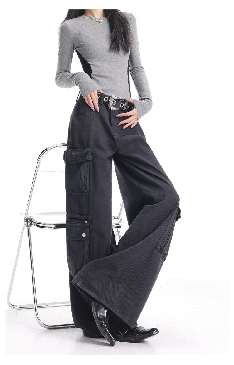 - KEN STUDIO Xuân Thu Quần Cargo Đường Phố Cao Cấp Màu Xanh Hải Quân Mới Quần Cargo Nữ Nhiều Túi Quần Ống Rộng Quần Ống Rộng