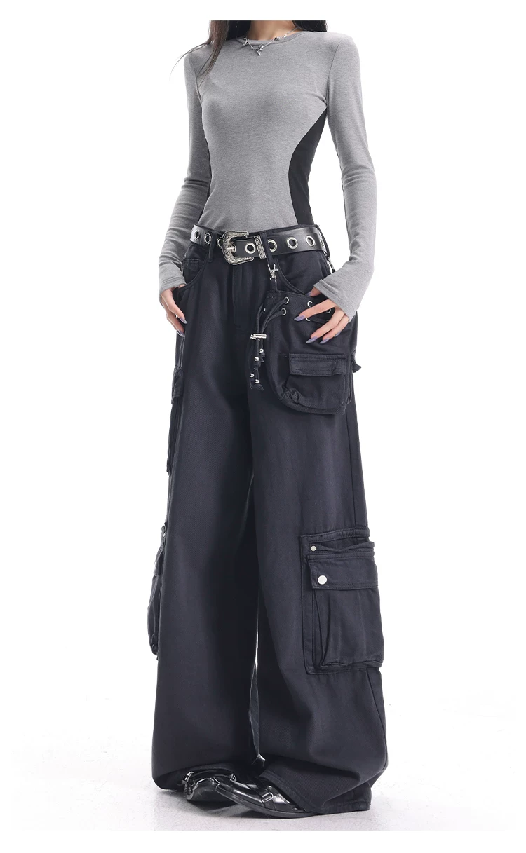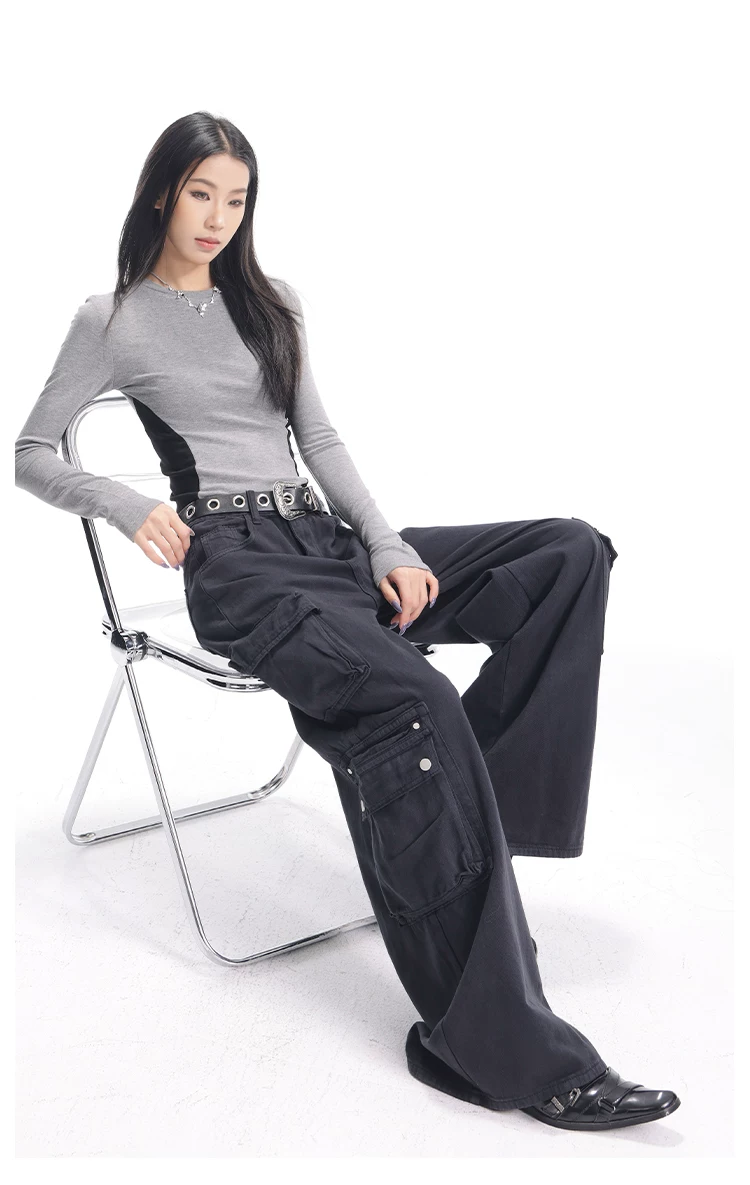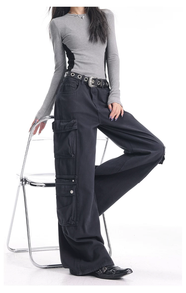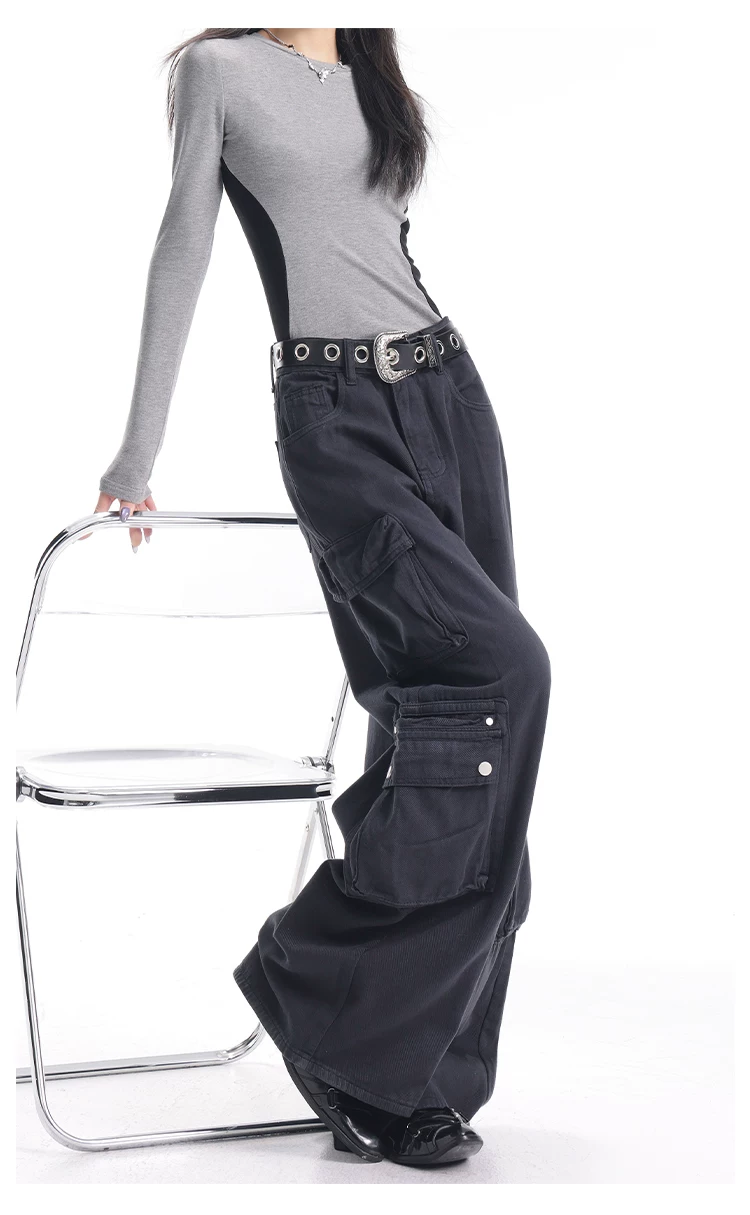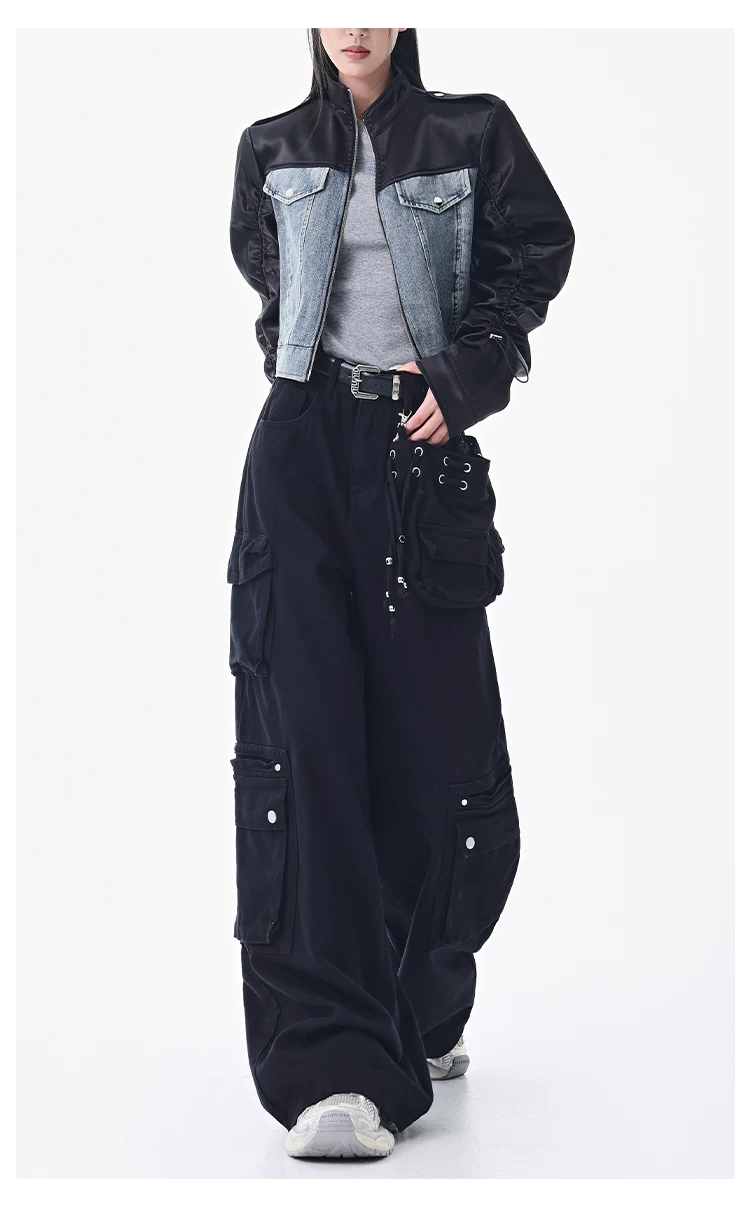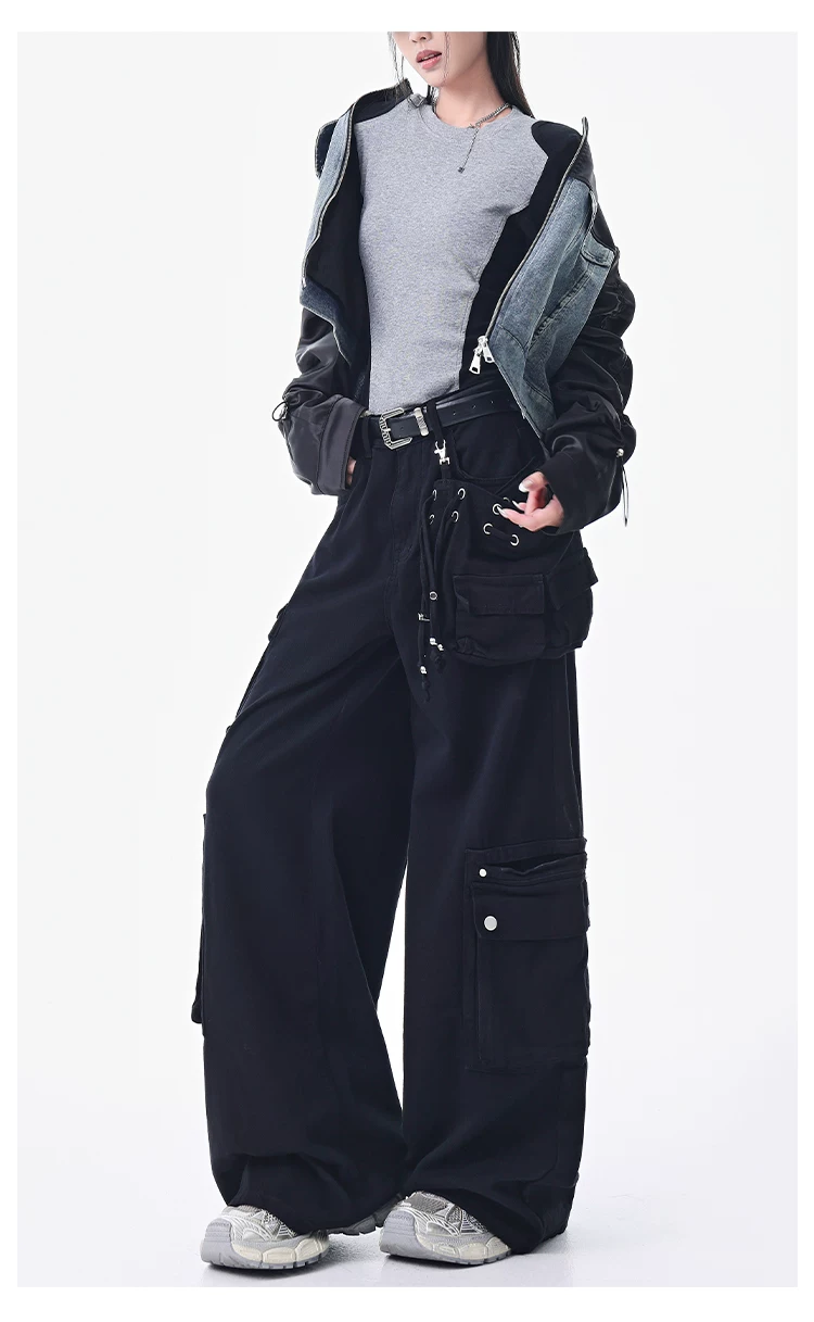 - KEN STUDIO Xuân Thu Quần Cargo Đường Phố Cao Cấp Màu Xanh Hải Quân Mới Quần Cargo Nữ Nhiều Túi Quần Ống Rộng Quần Ống Rộng