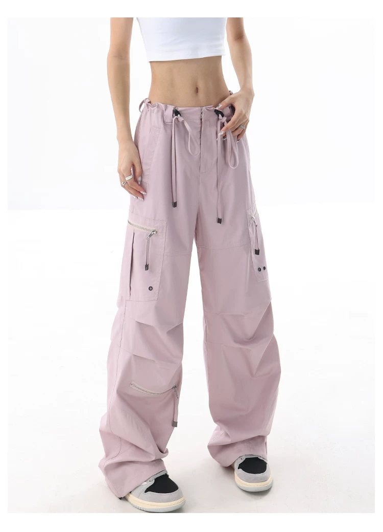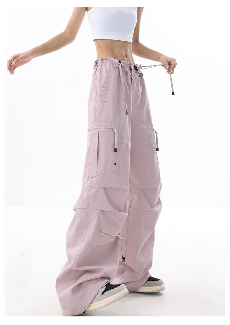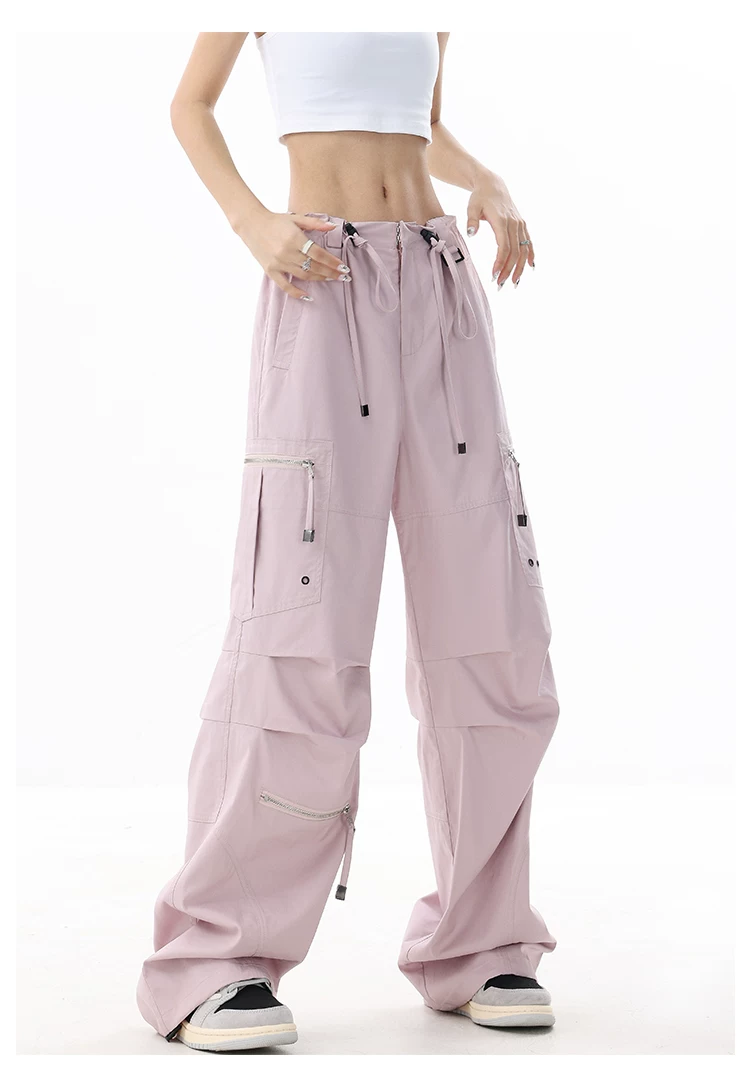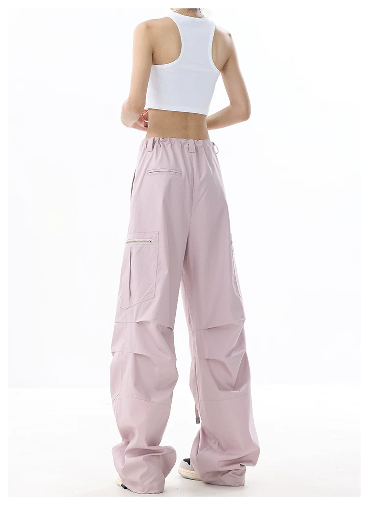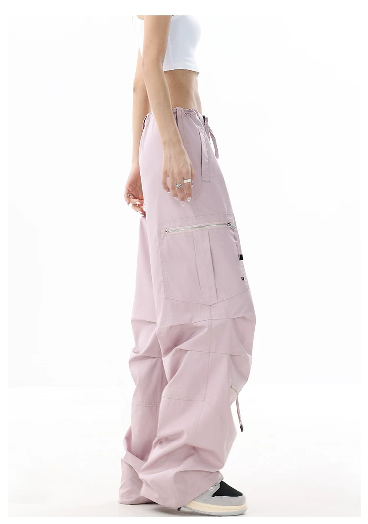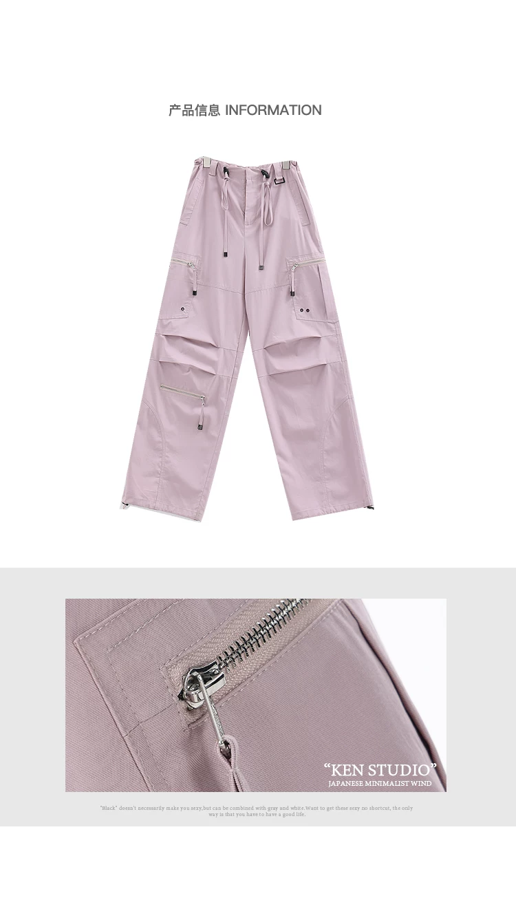 - KEN STUDIO Xuân Thu Quần Cargo ống rộng xếp ly màu hồng mới dành cho nữ Quần dài dáng rộng lưng cao dáng rộng giúp giảm béo Quần dài thường ngày