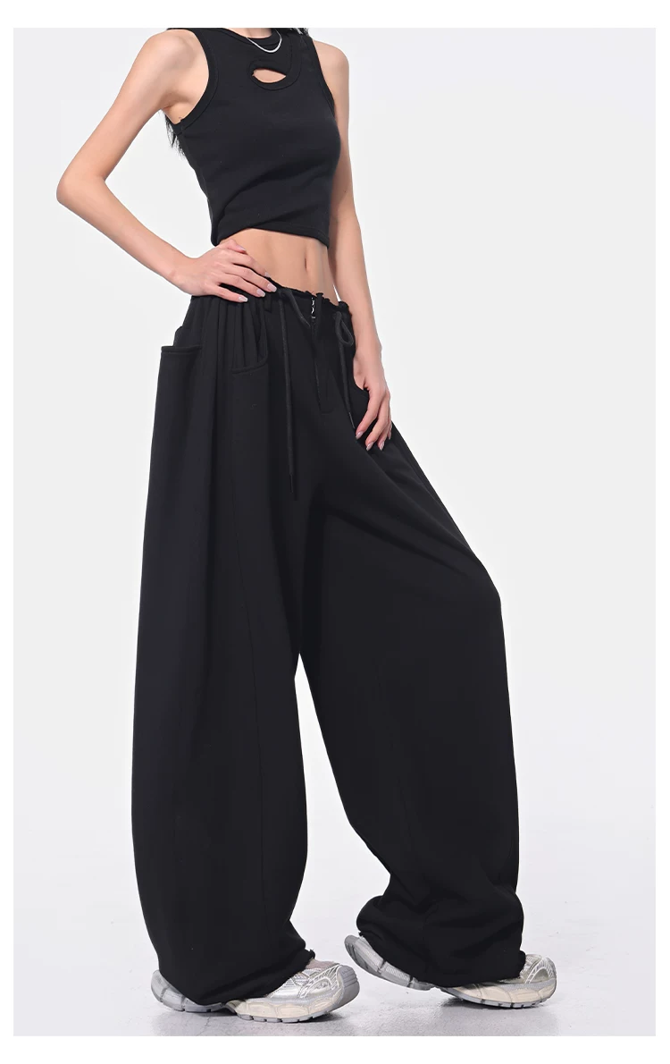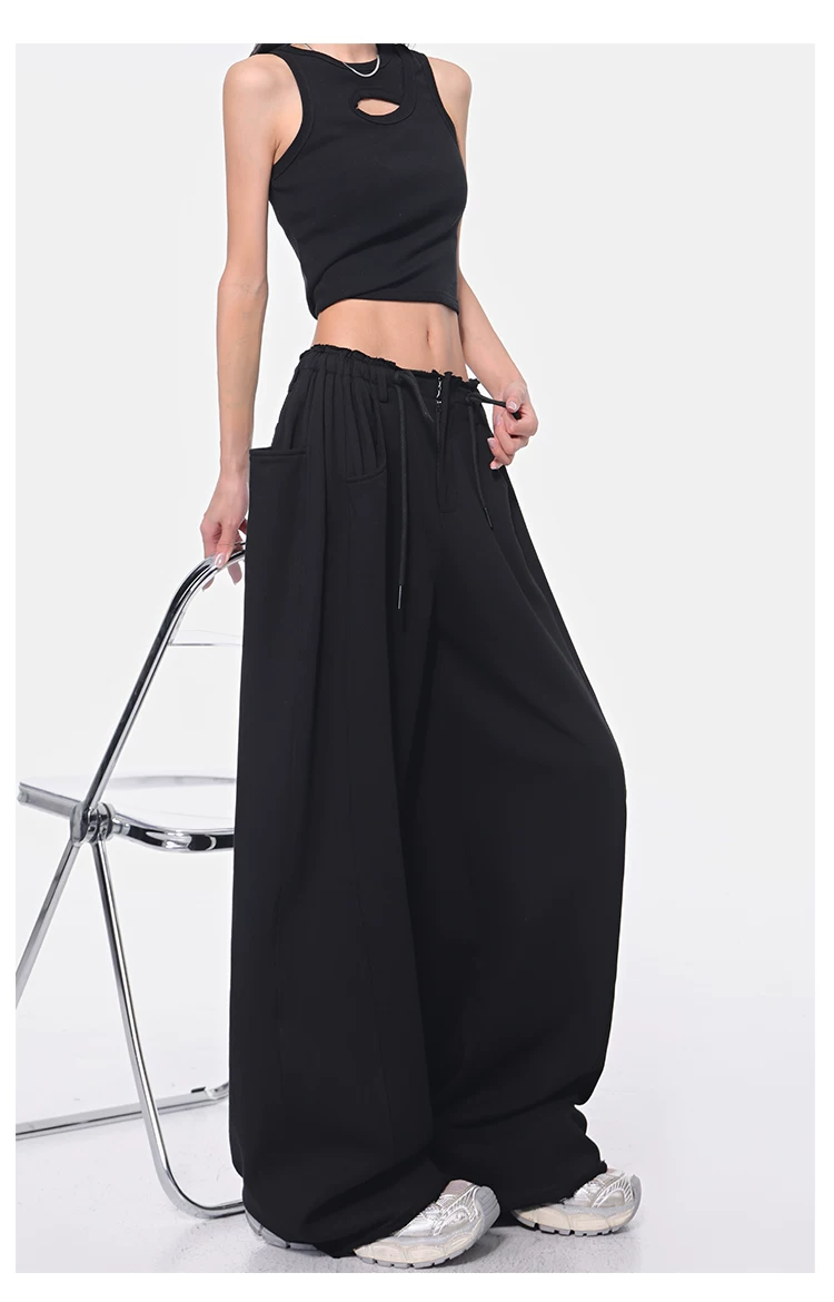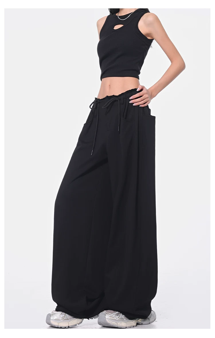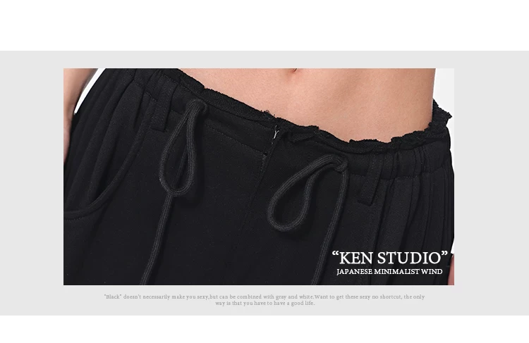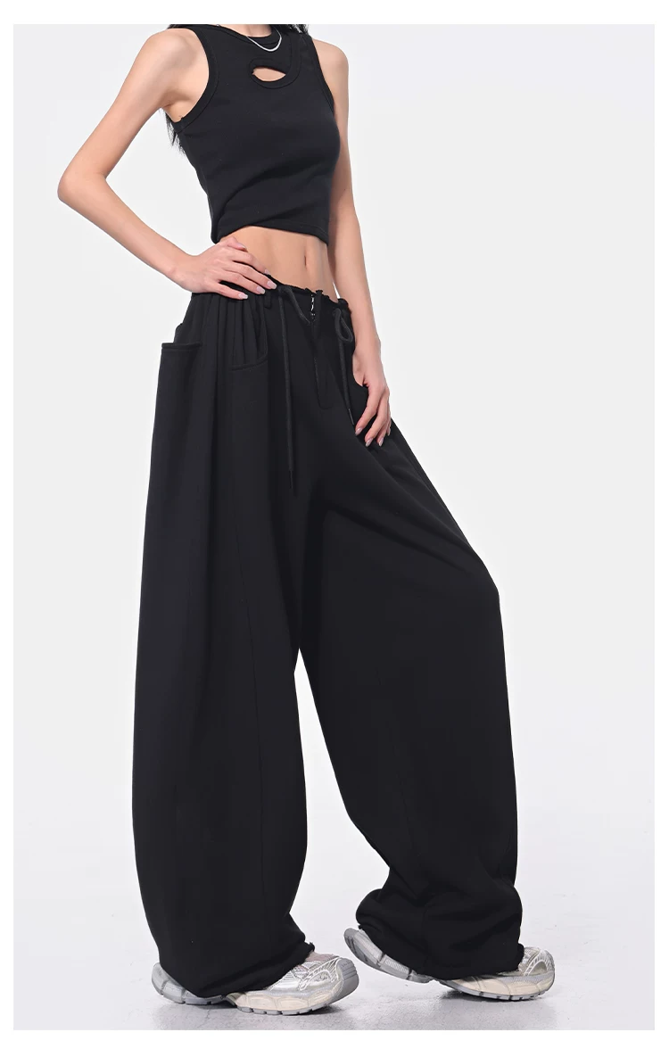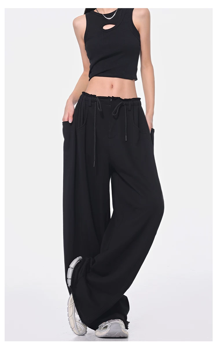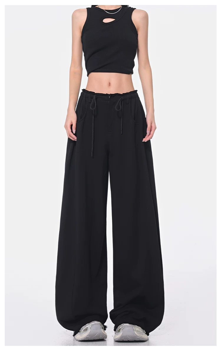- KEN STUDIO Xuân Thu Quần dài dây rút màu đen mới Quần nữ lưng cao dáng rộng Quần ống rộng dài đến sàn