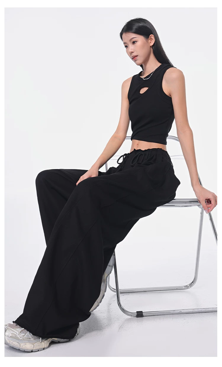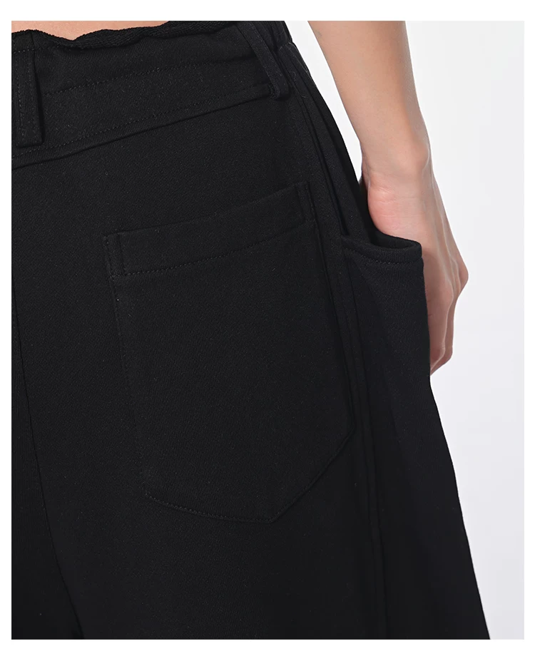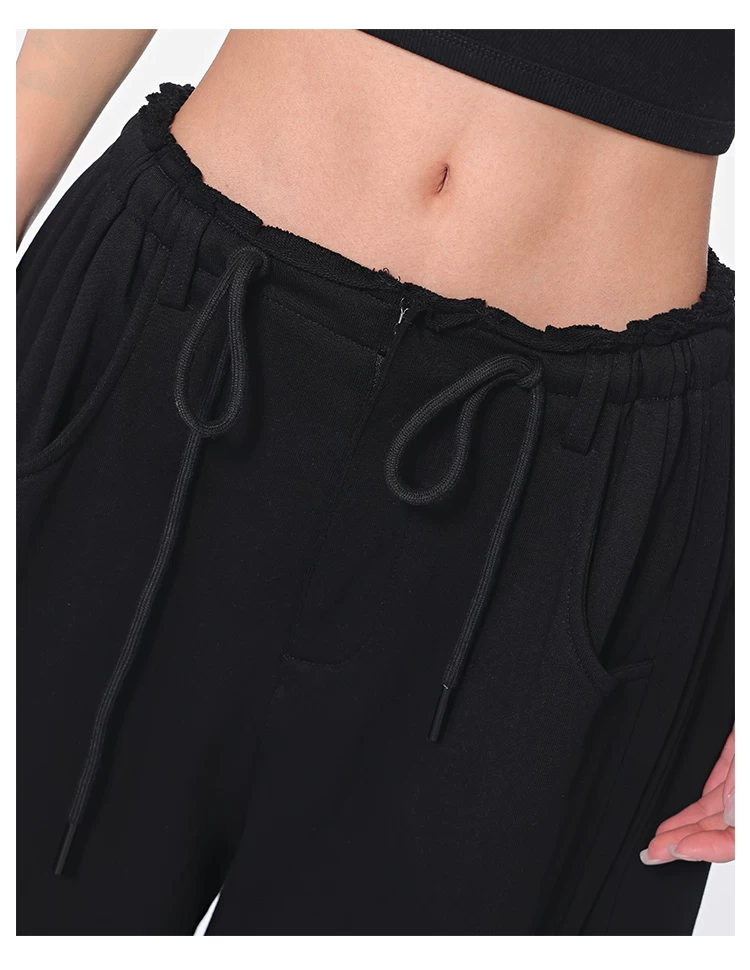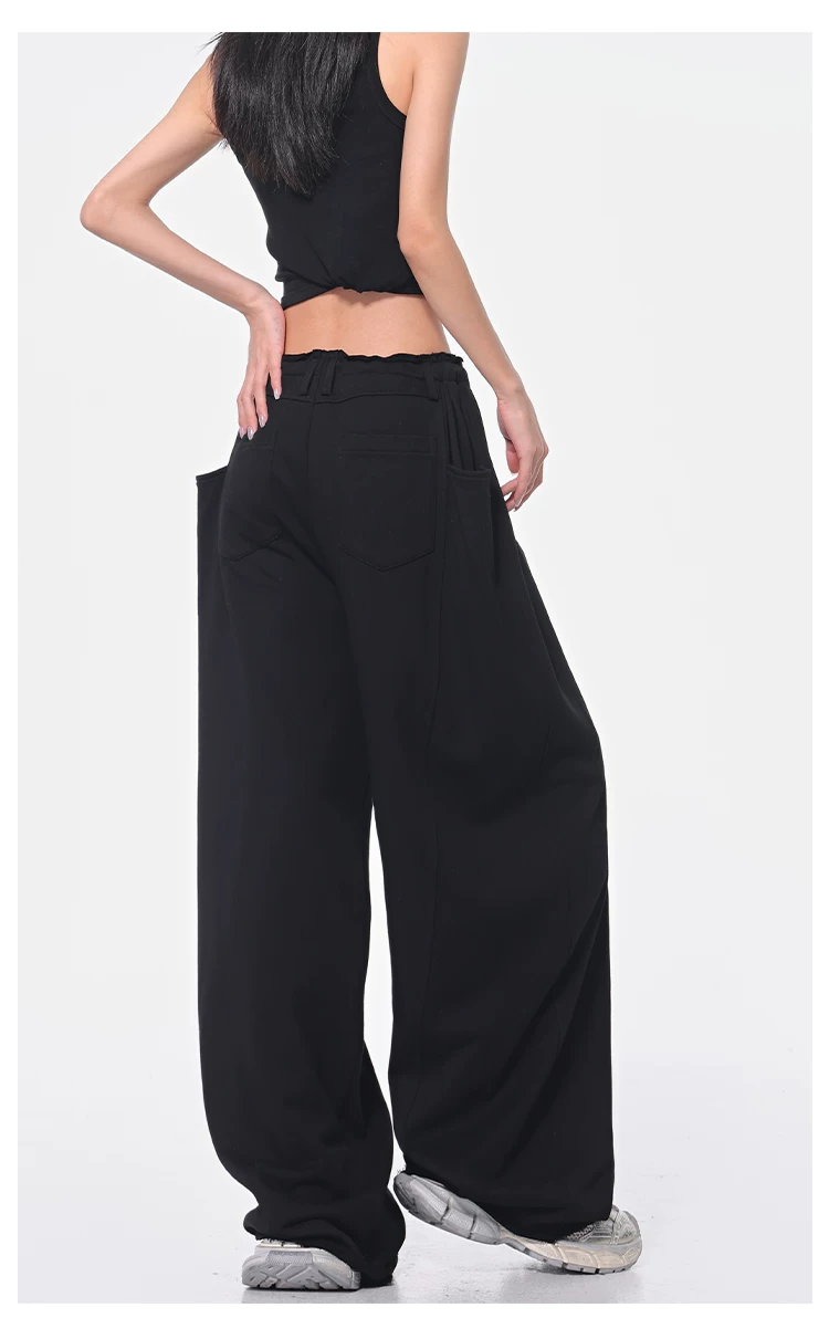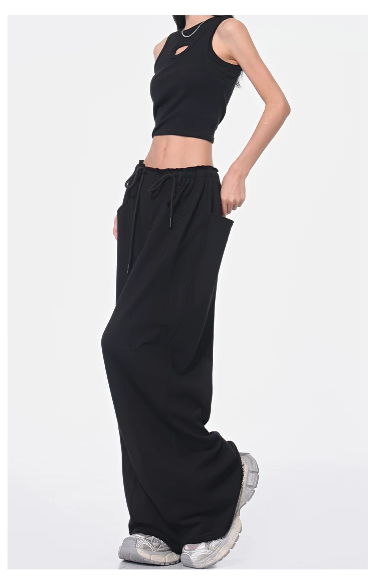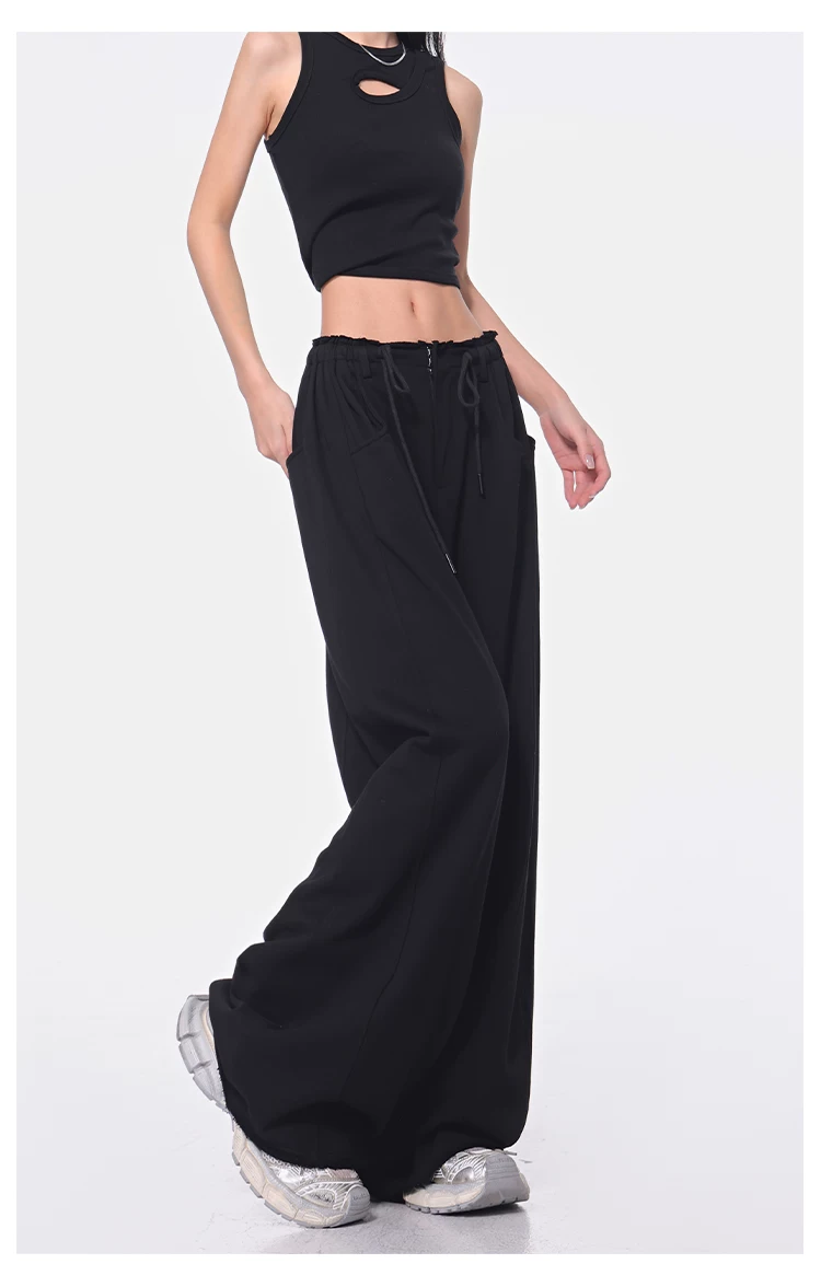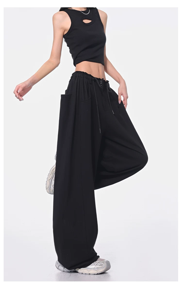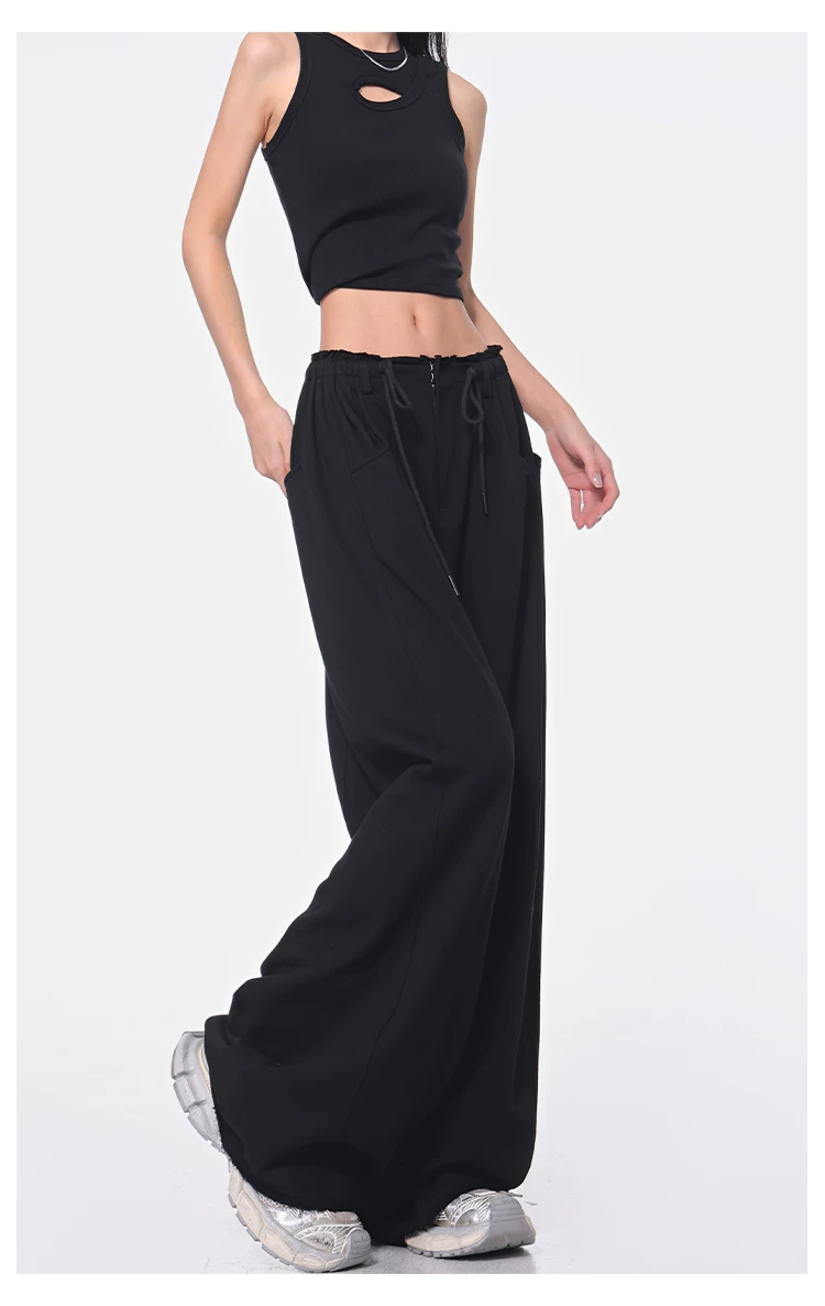 - KEN STUDIO Xuân Thu Quần dài dây rút màu đen mới Quần nữ lưng cao dáng rộng Quần ống rộng dài đến sàn