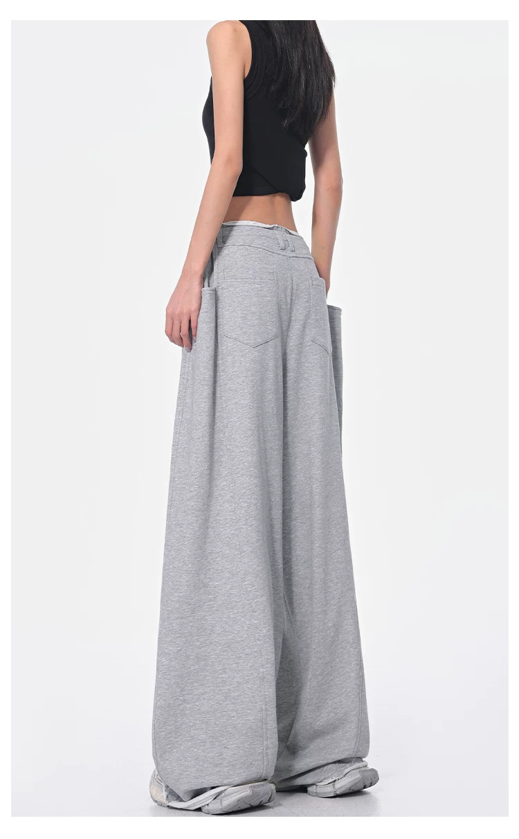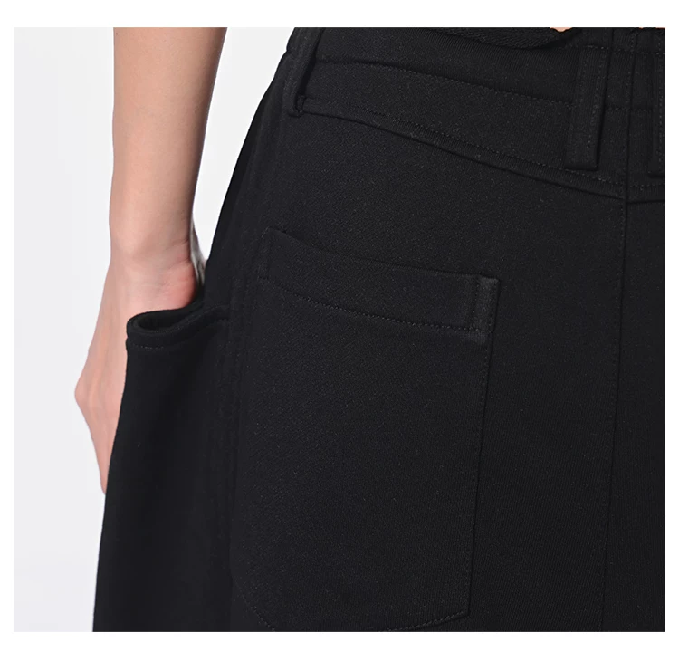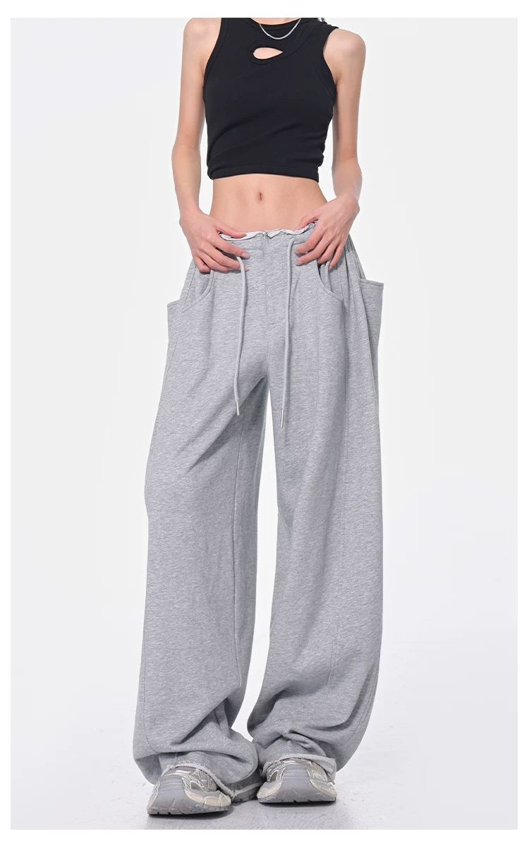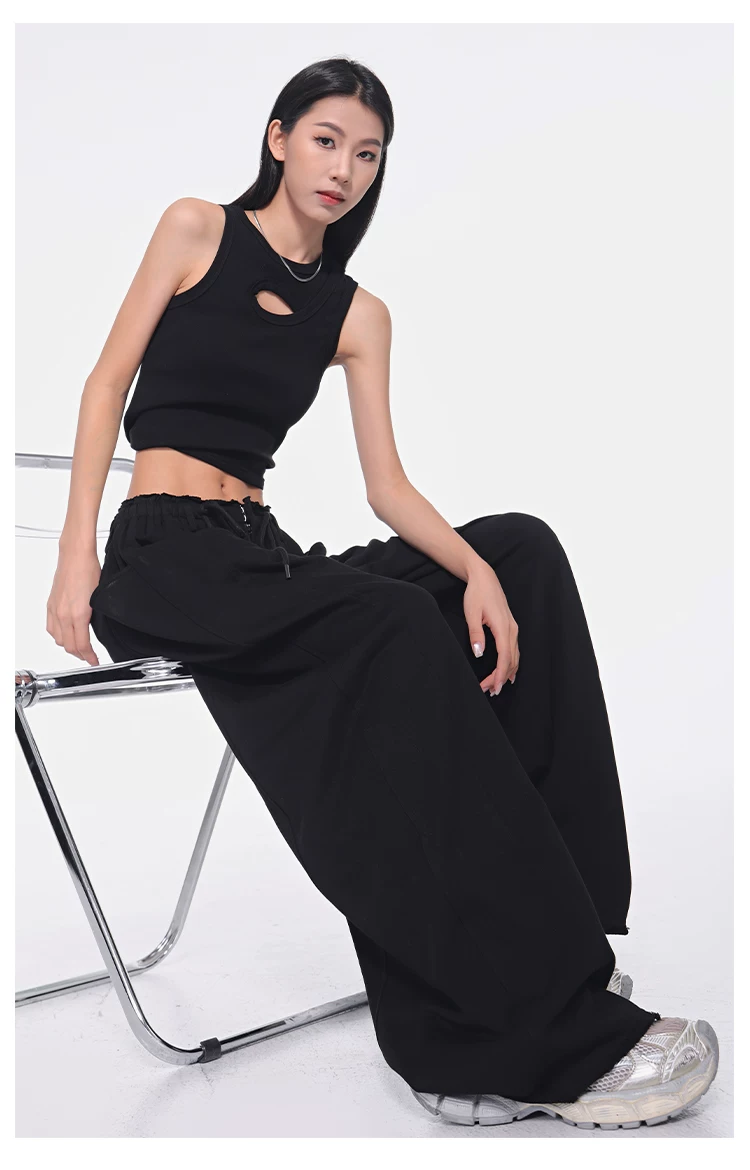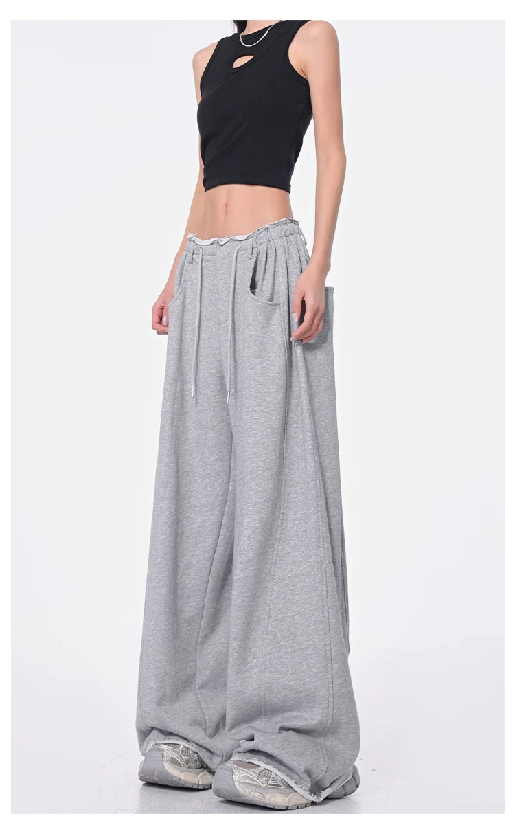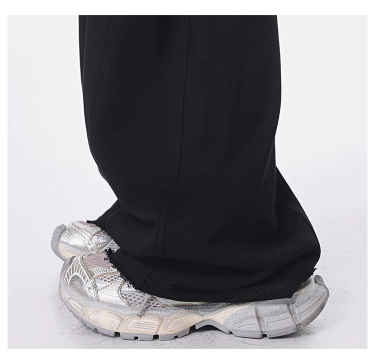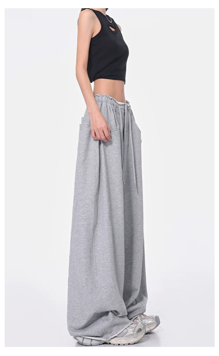 - KEN STUDIO Xuân Thu Quần dài dây rút màu đen mới Quần nữ lưng cao dáng rộng Quần ống rộng dài đến sàn