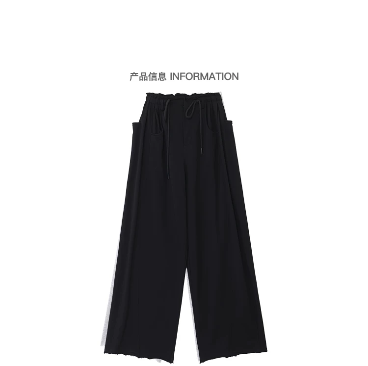 KEN STUDIO Xuân Thu Quần dài dây rút màu đen mới Quần nữ lưng cao dáng rộng Quần ống rộng dài đến sàn