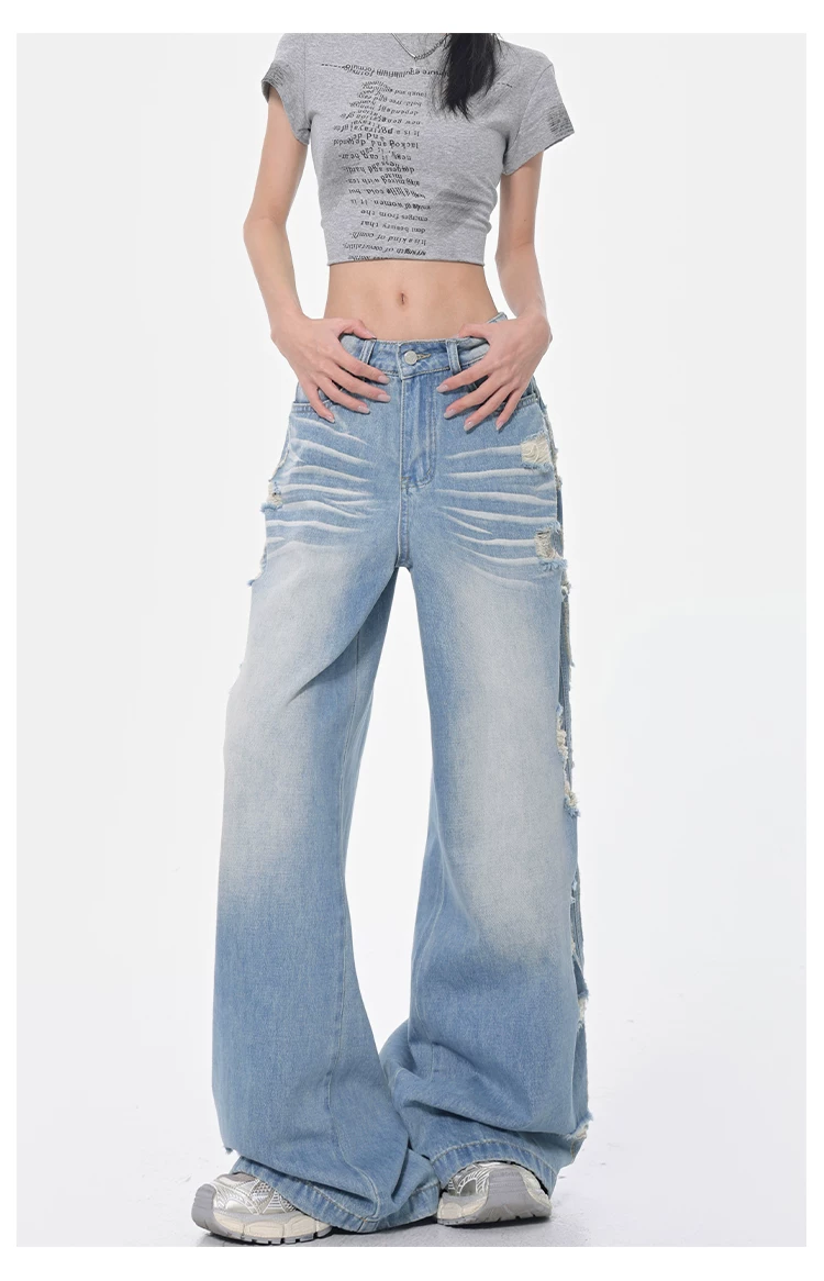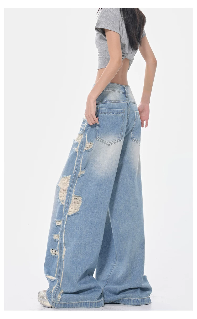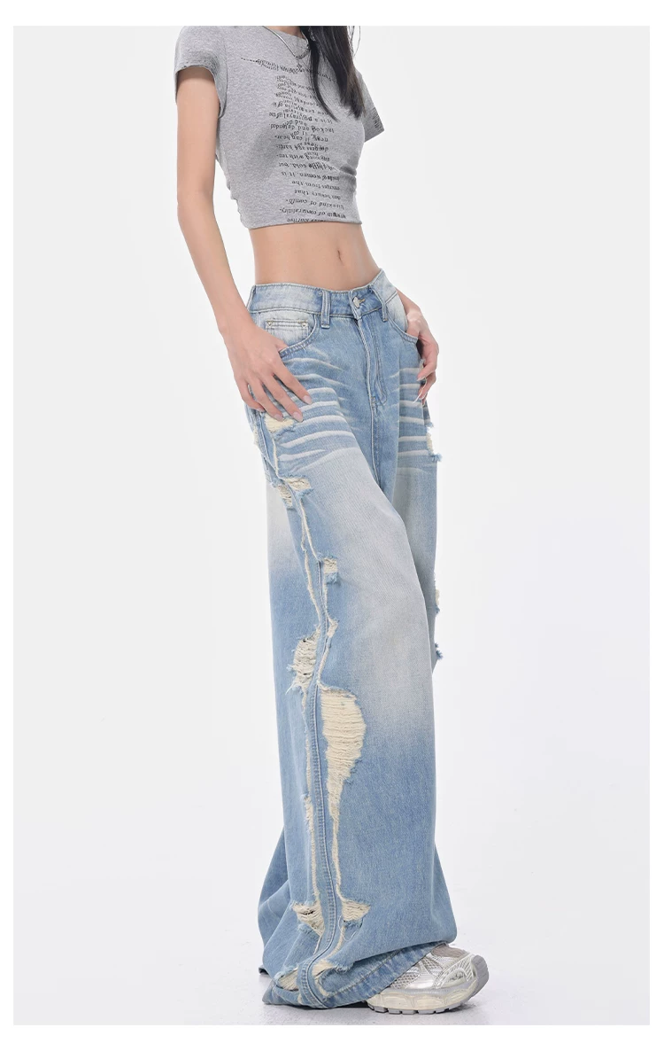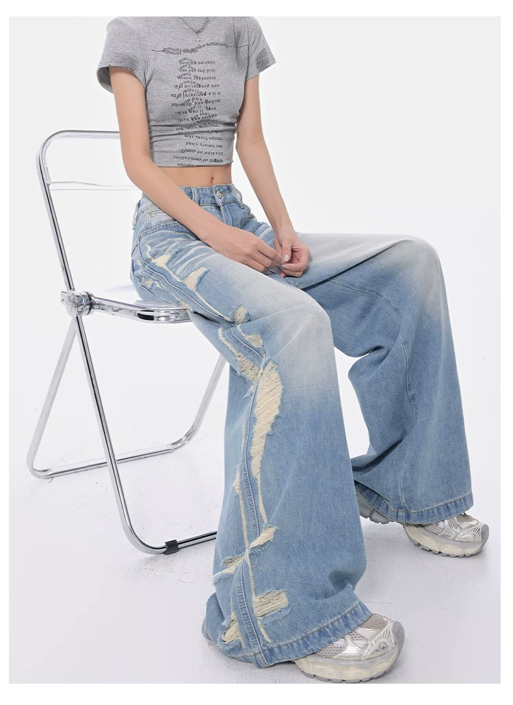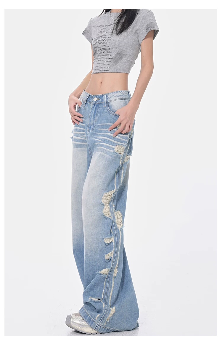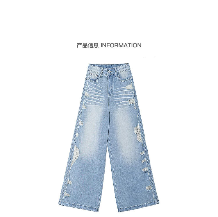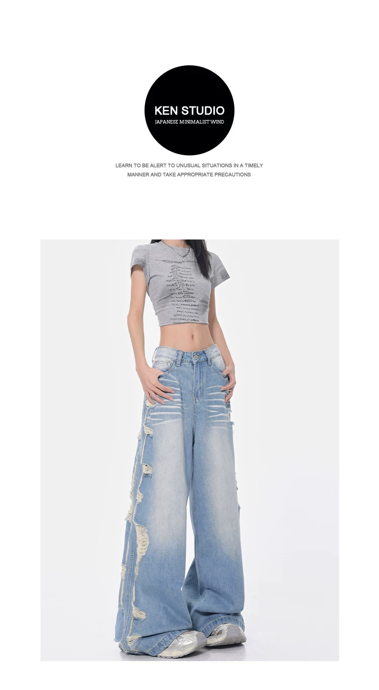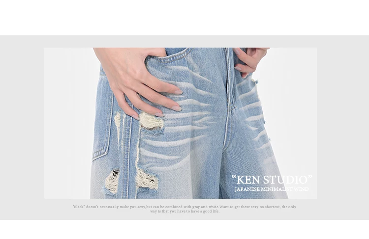 - KEN STUDIO Xuân Thu Quần jean ống rộng màu xanh nhạt cổ điển mới dành cho nữ với thiết kế rách Quần ống đứng kiểu dáng đơn giản