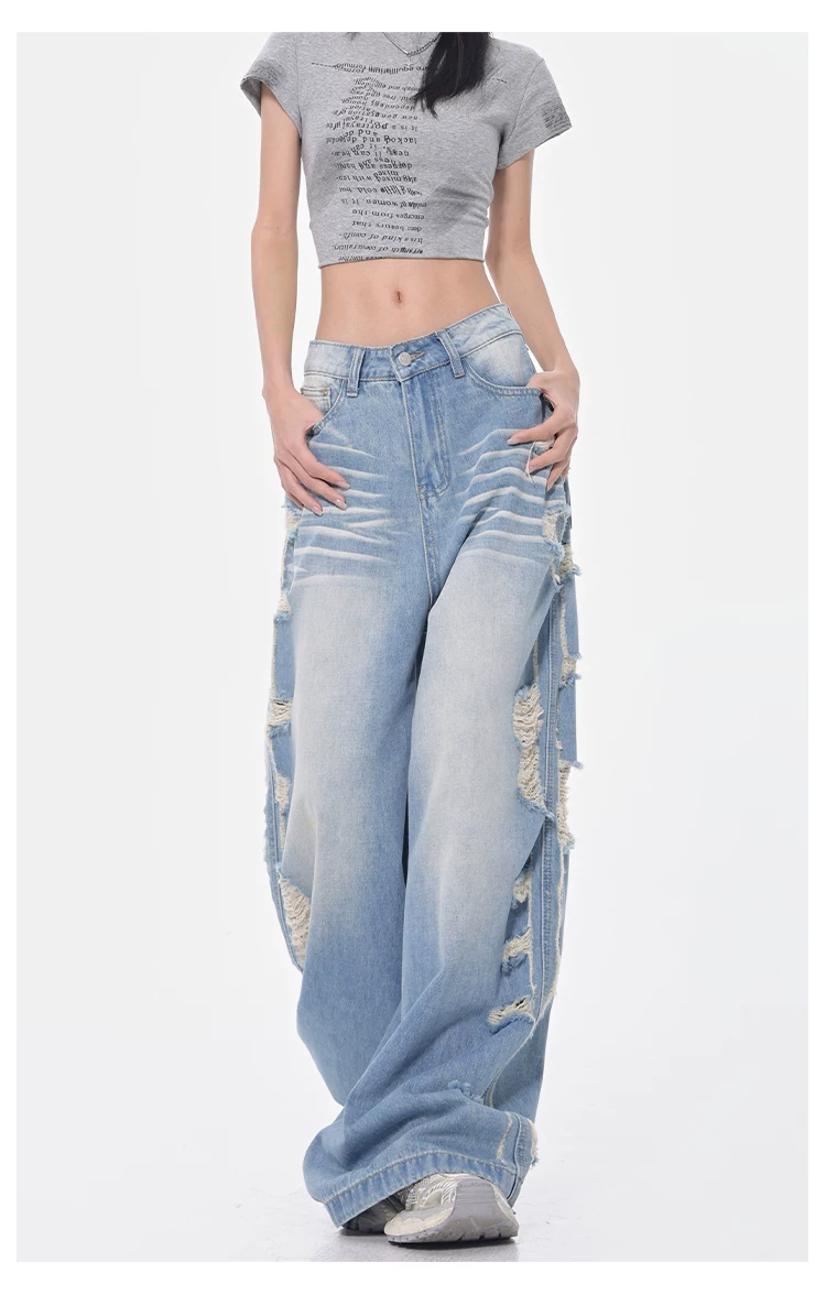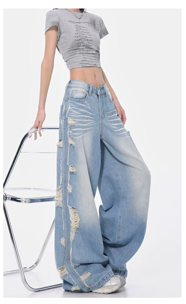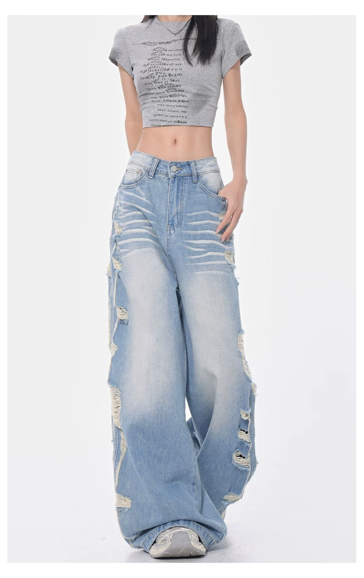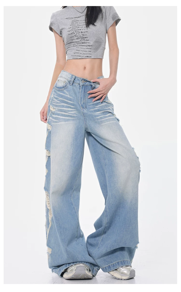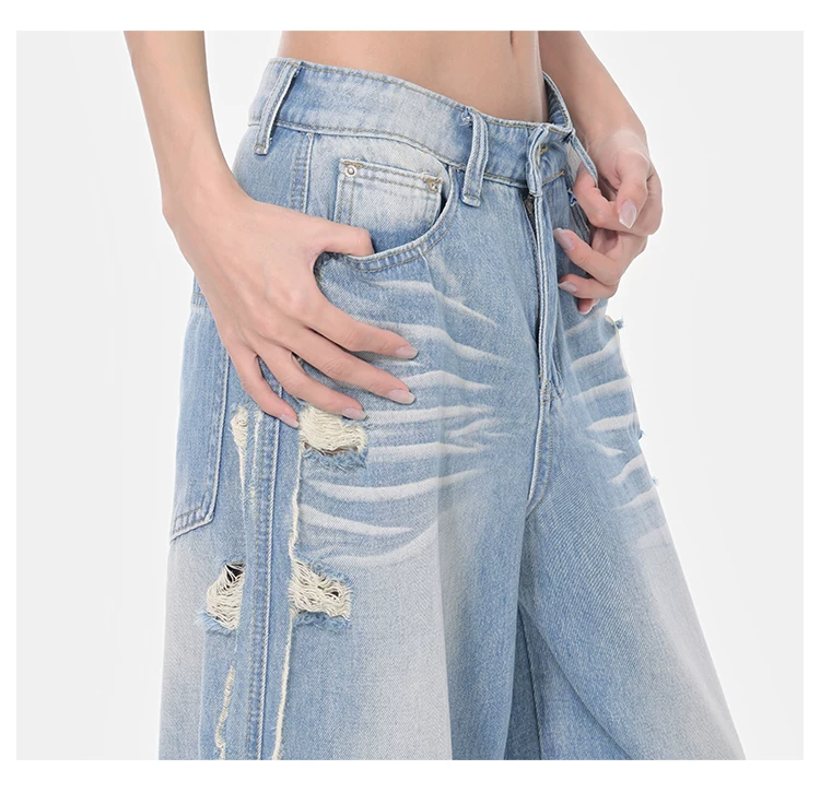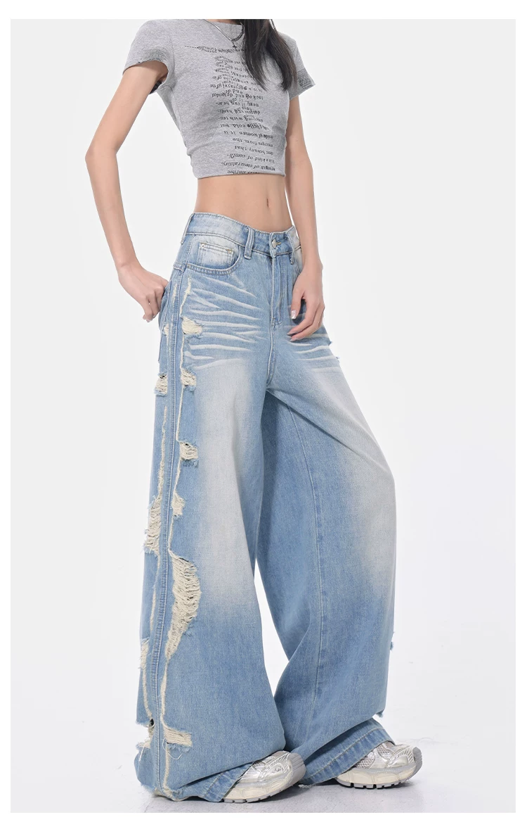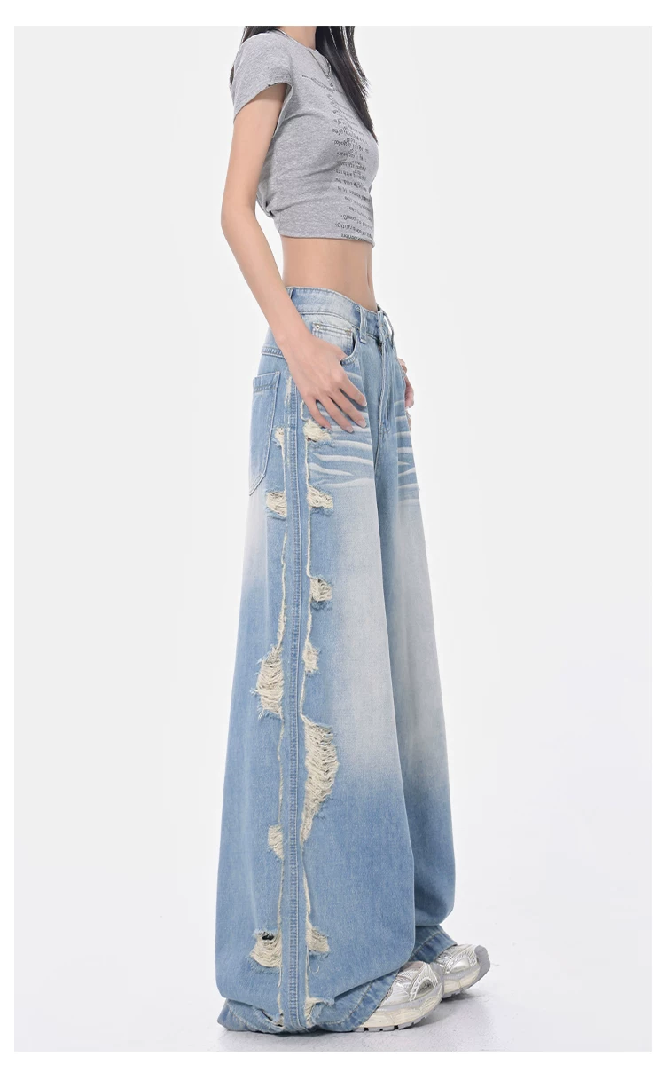 - KEN STUDIO Xuân Thu Quần jean ống rộng màu xanh nhạt cổ điển mới dành cho nữ với thiết kế rách Quần ống đứng kiểu dáng đơn giản