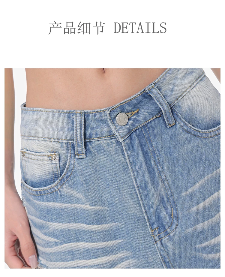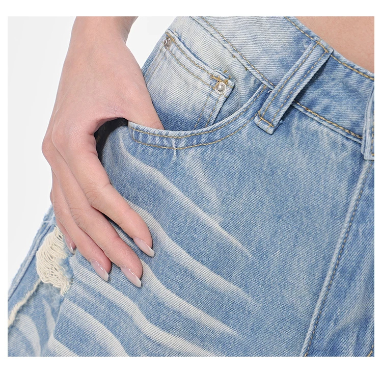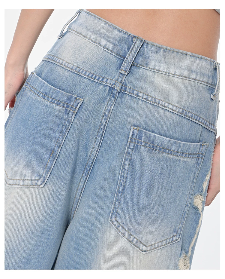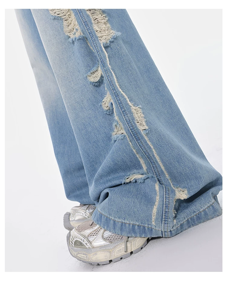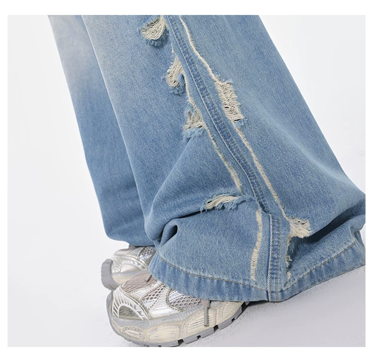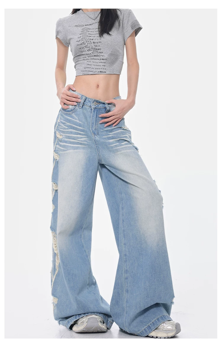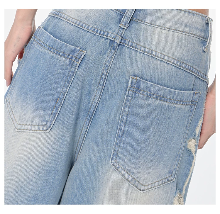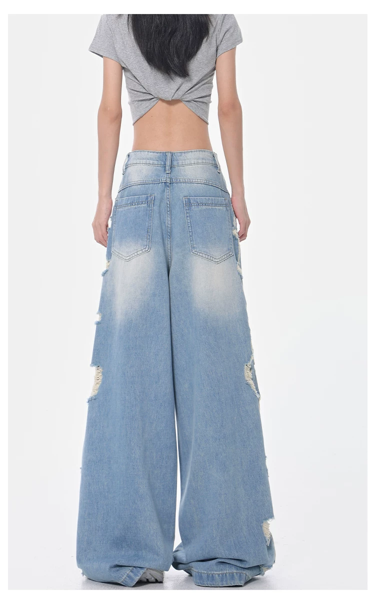 - KEN STUDIO Xuân Thu Quần jean ống rộng màu xanh nhạt cổ điển mới dành cho nữ với thiết kế rách Quần ống đứng kiểu dáng đơn giản